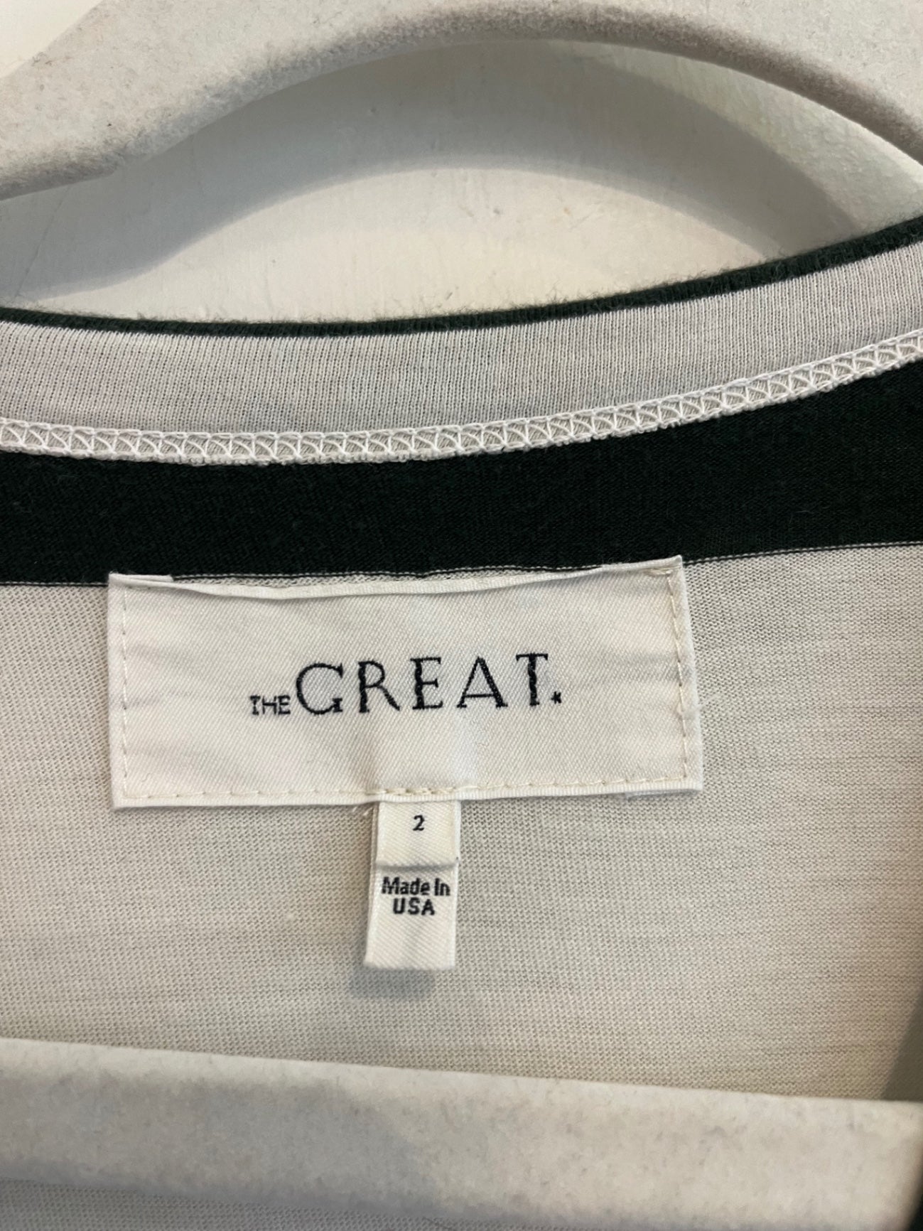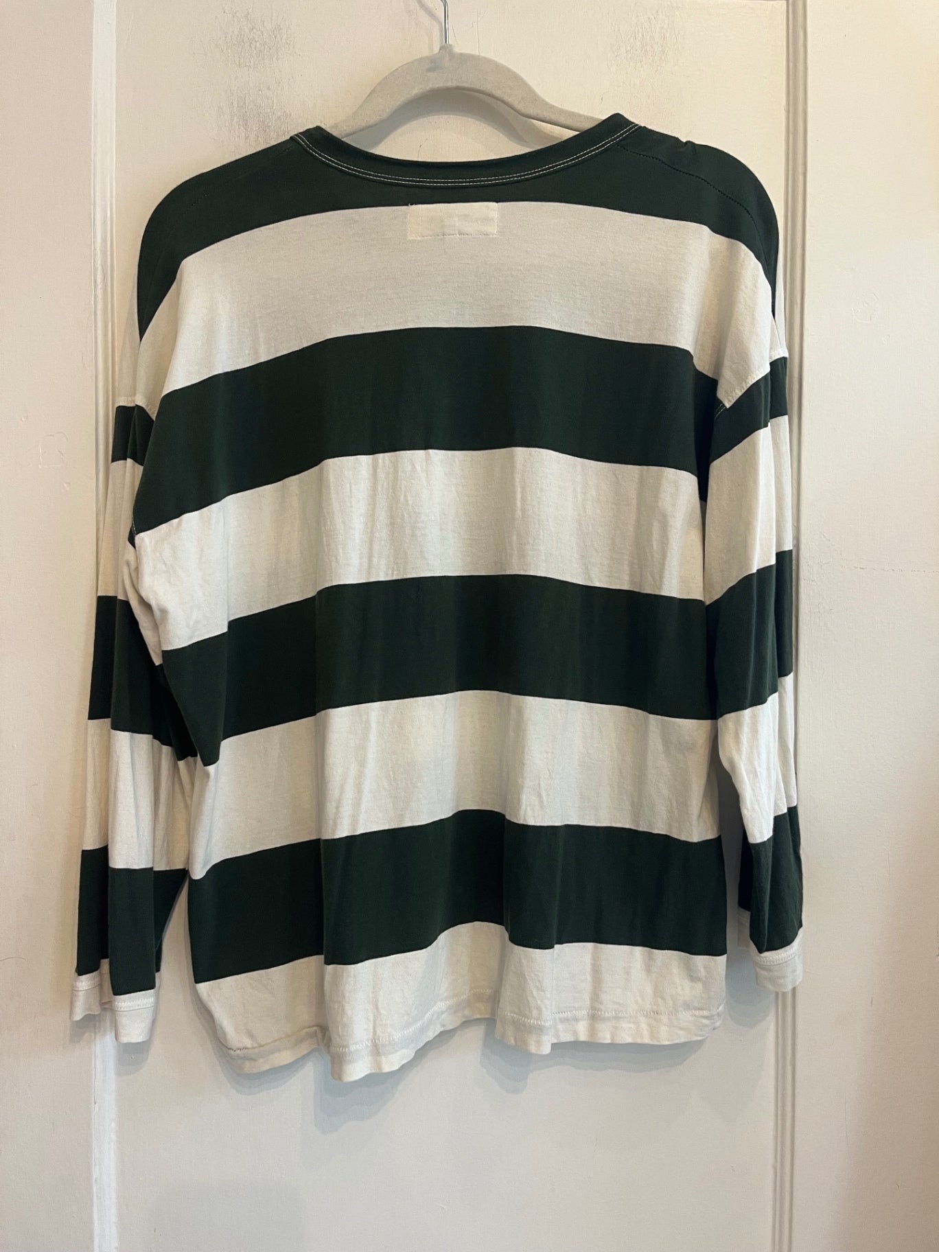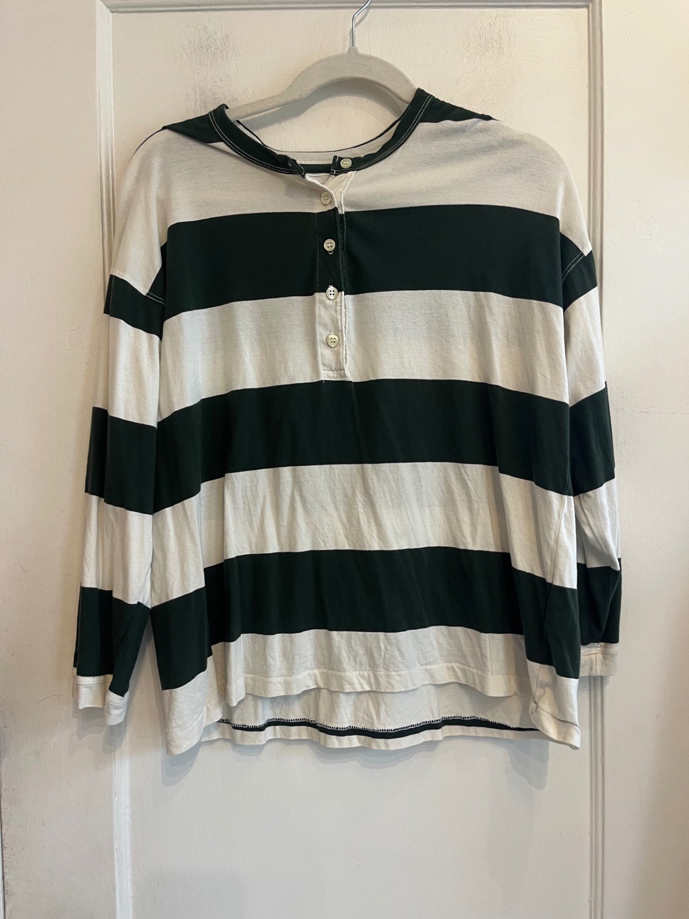 Soft cotton long sleeve from The Great in cream and deep green stripes. Features button Henley neckline and relaxed oversized fit.