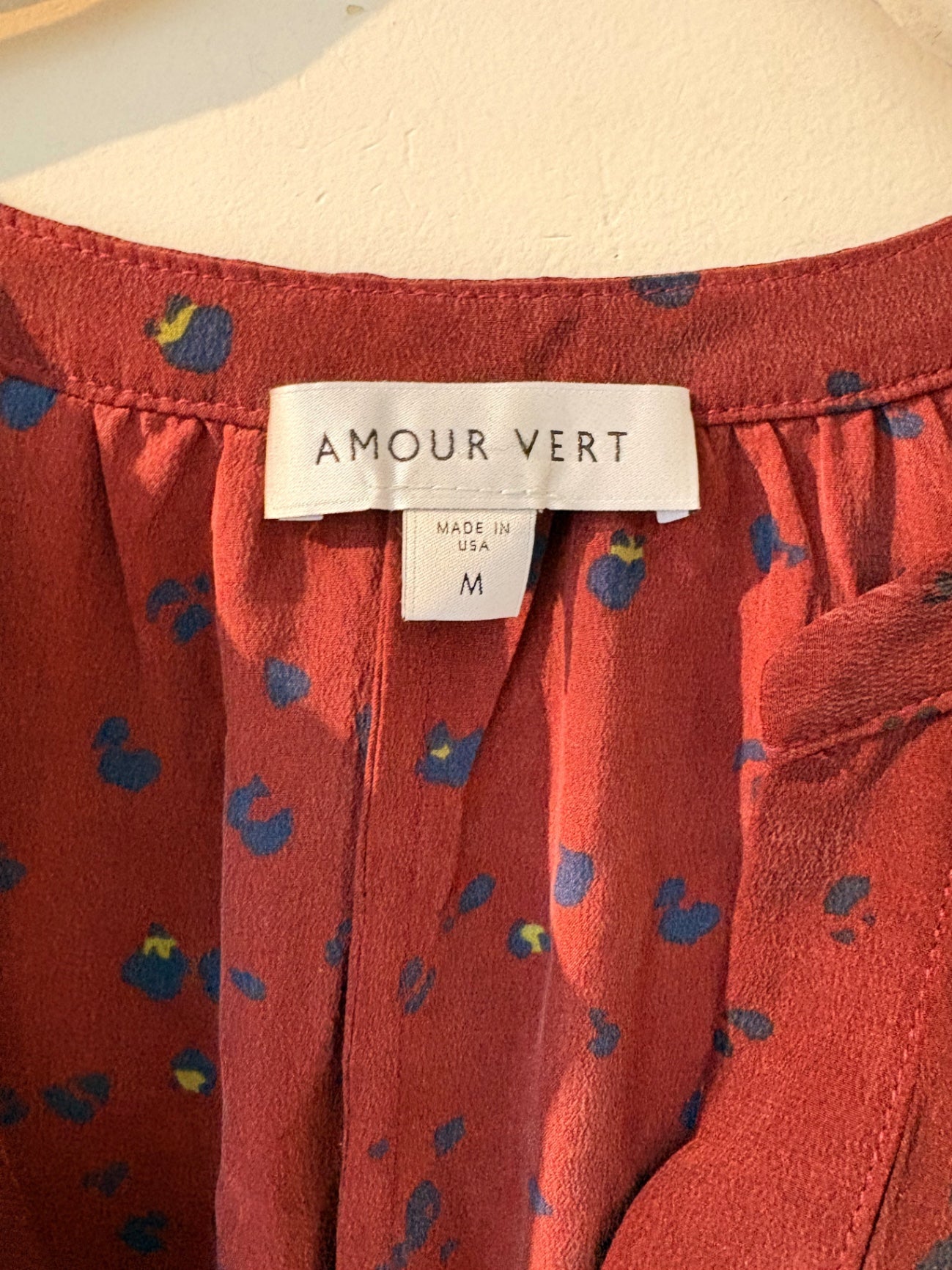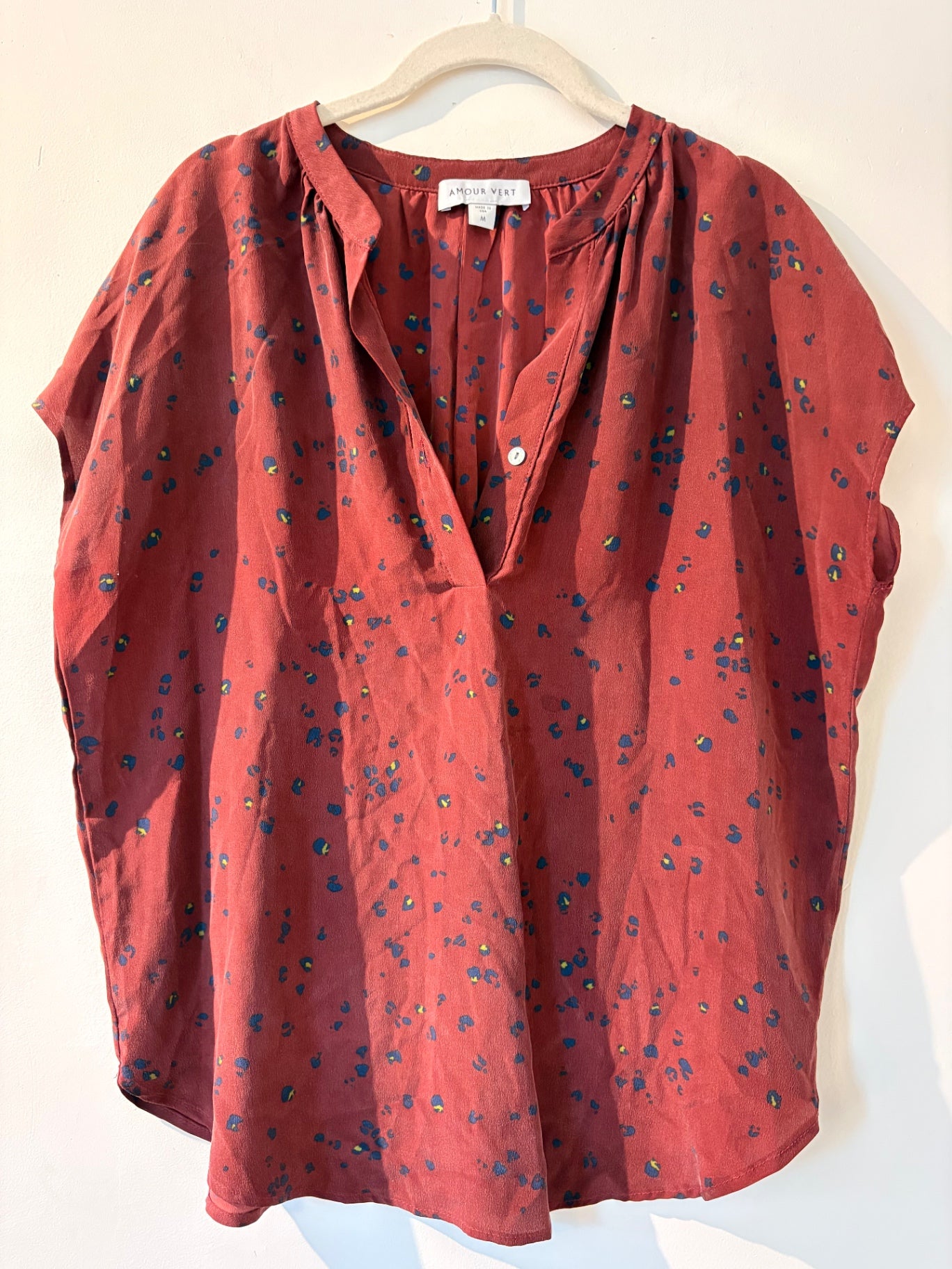 Red blouse with navy and chartreuse print. Soft, flowy fabric with a relaxed fit and open V neckline.