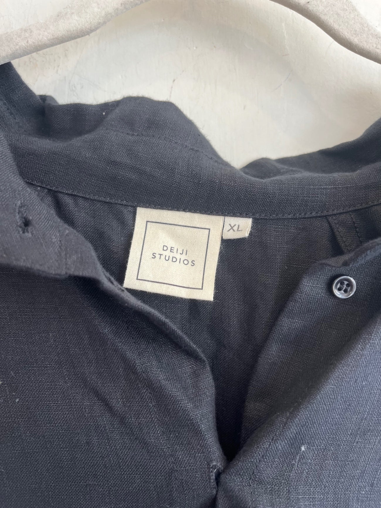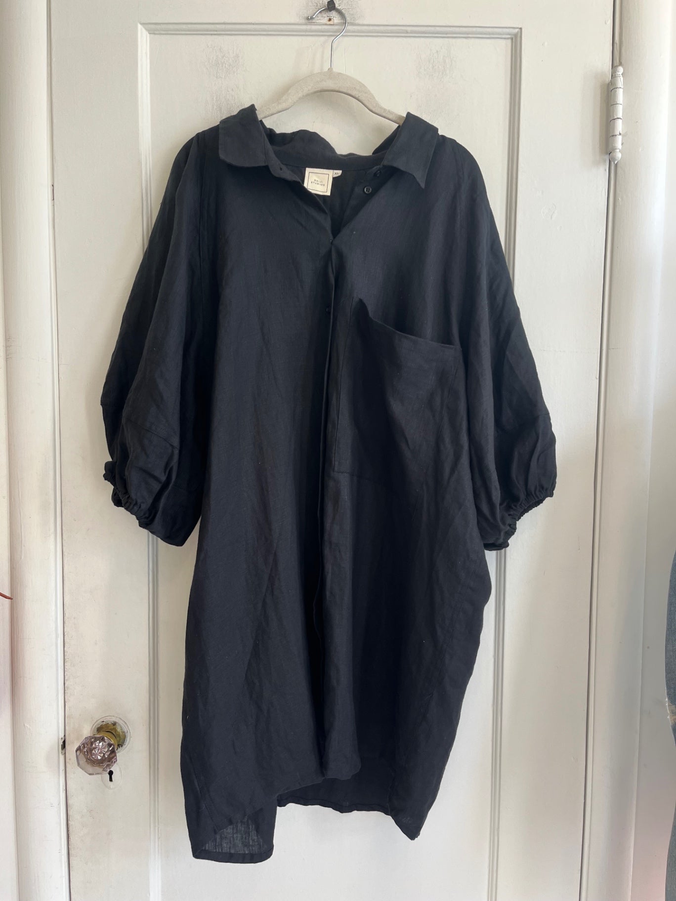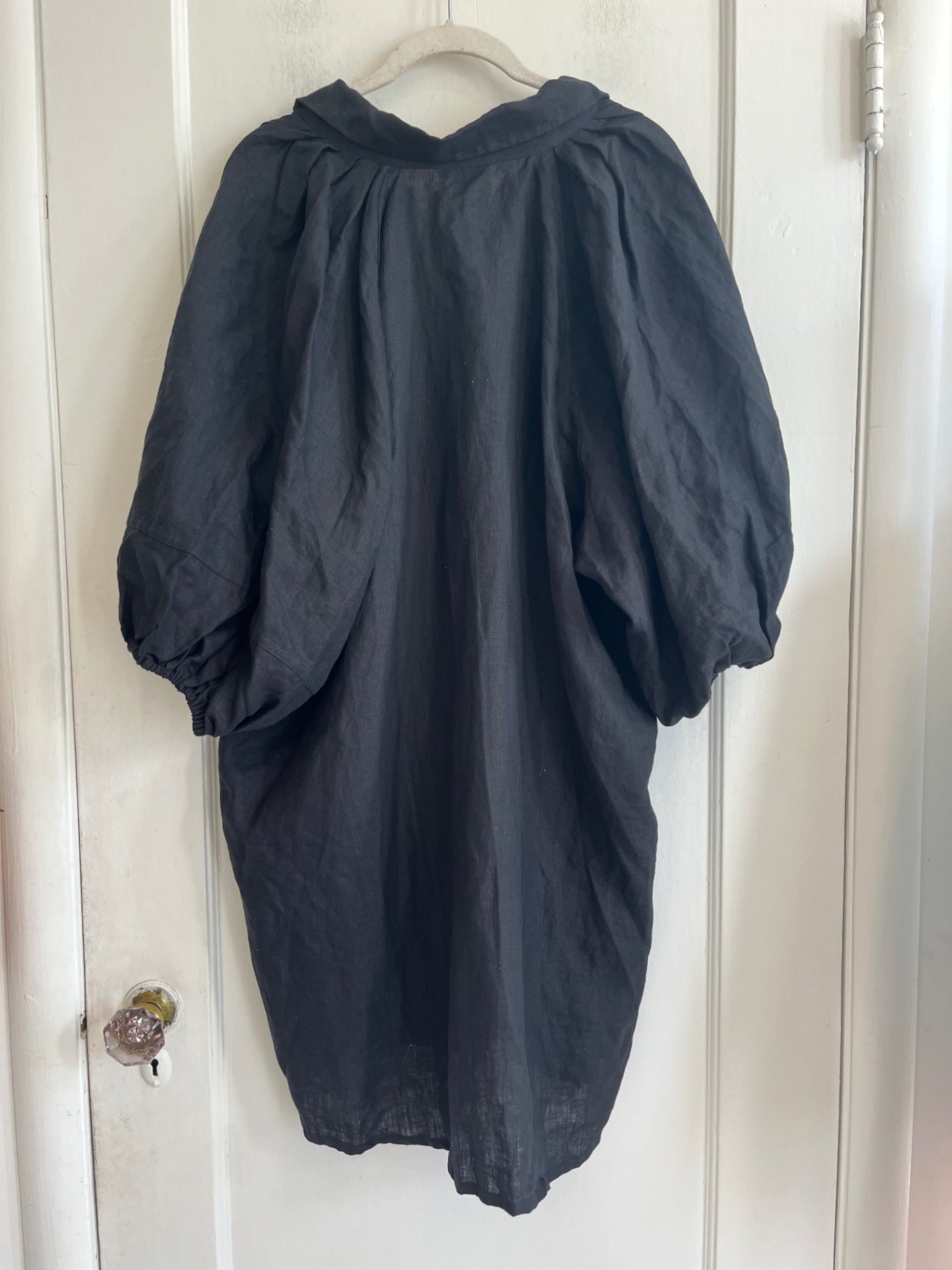 Black linen shirt dress, features a relaxed oversized fit, partial button front, and gathered ballon sleeves.