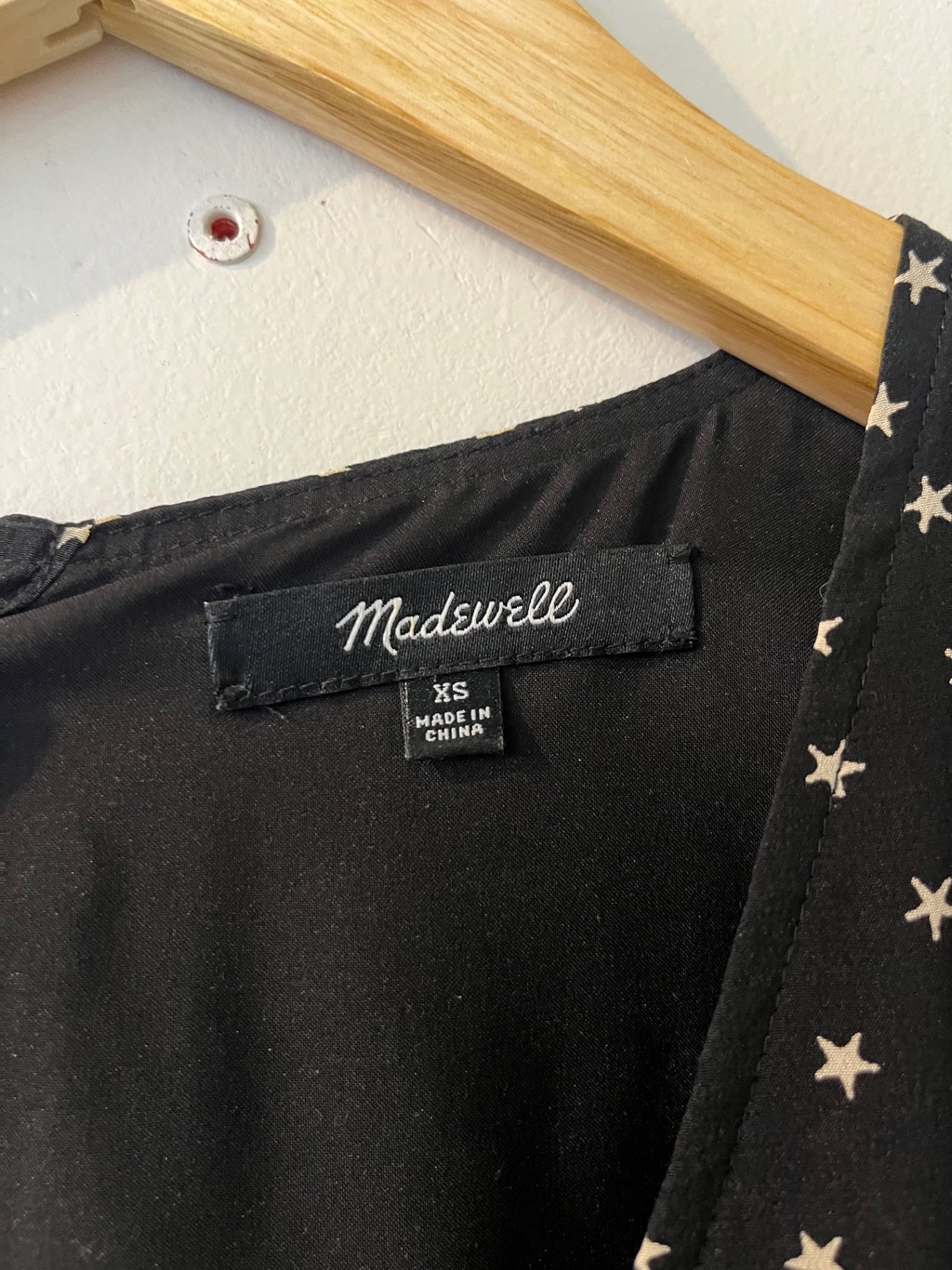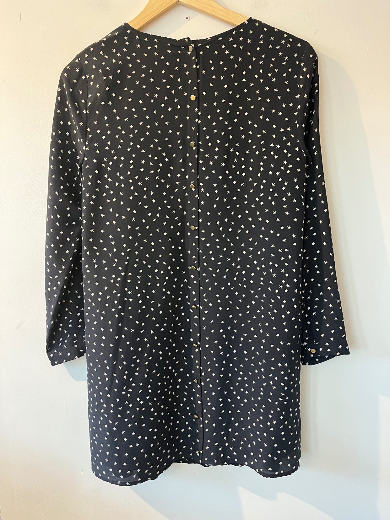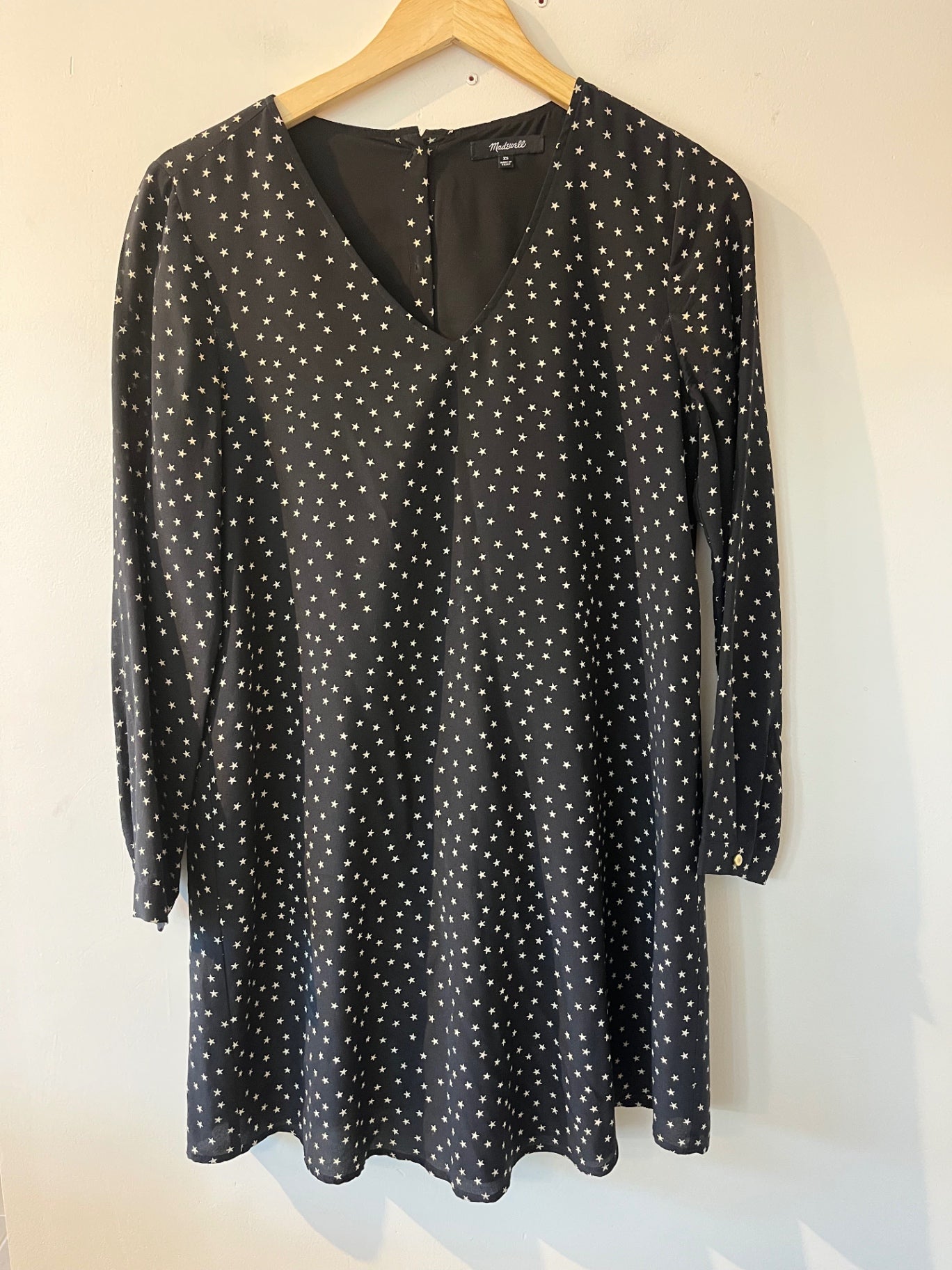 Madewell mini dress with all over white star print on black background. Designed with long sleeves and a relaxed silhouette.