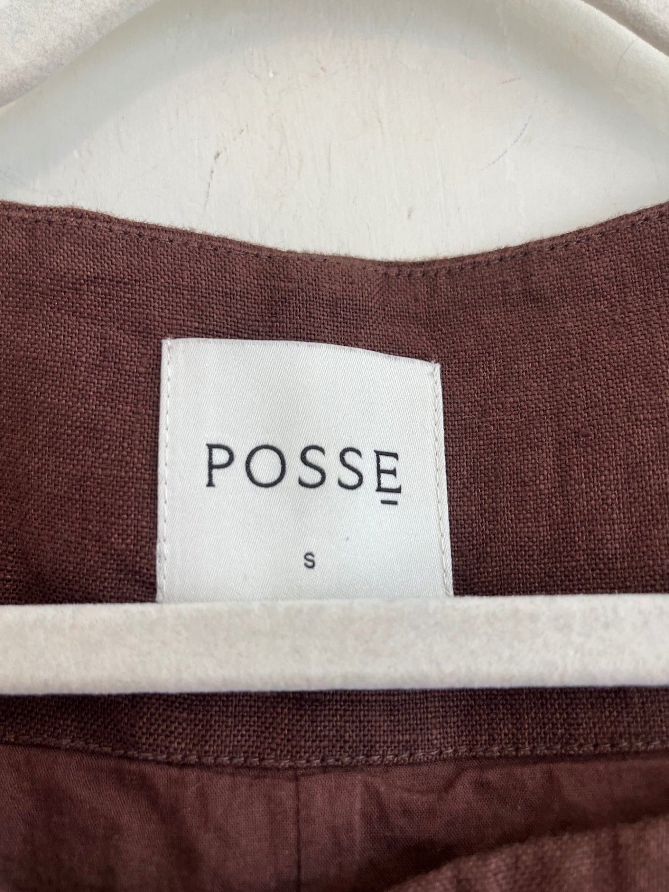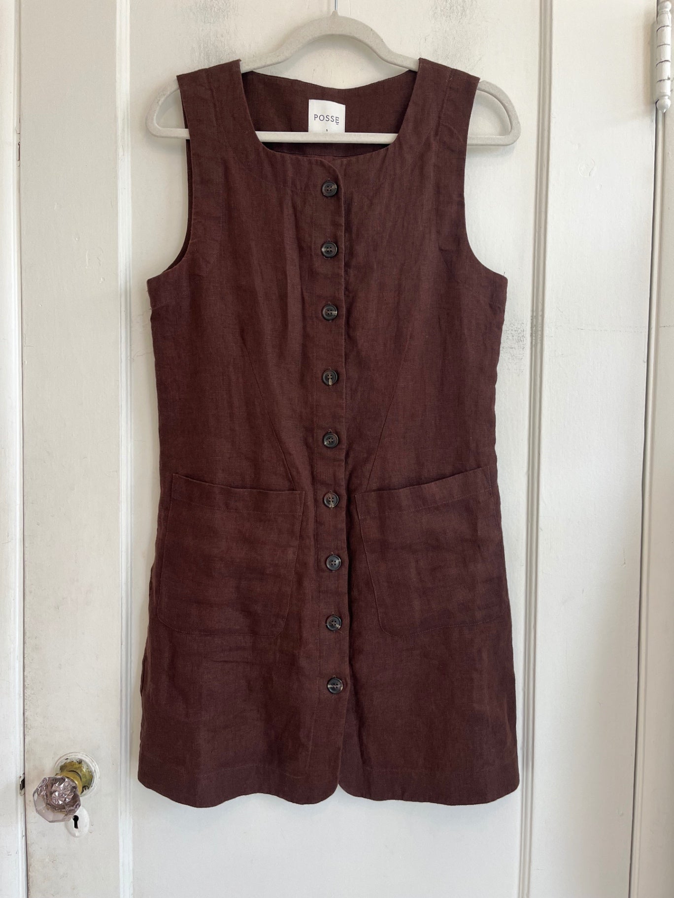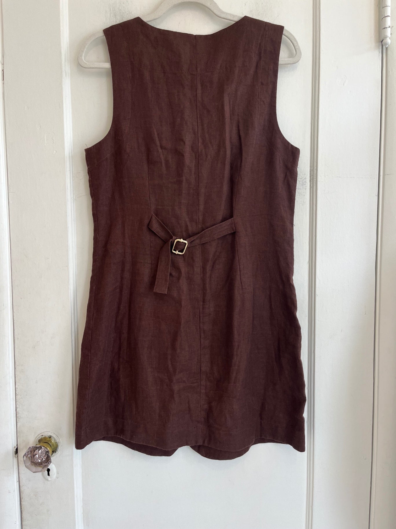 Brown linen sleeveless dress with full button front and large front pockets. Structured waist seams with a flattering straight silhouette.