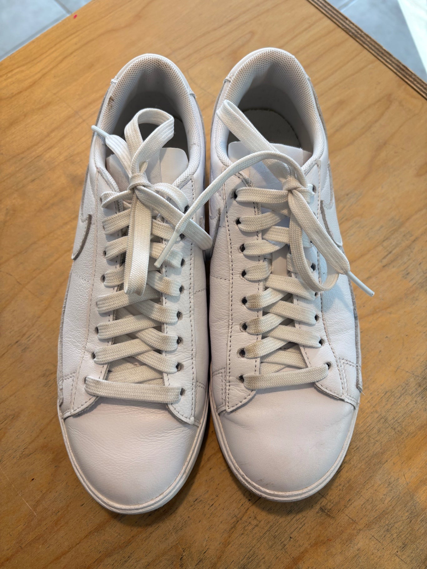 Classic white leather sneakers that showcase a clean and versatile style. Perfect for casual wear or adding a sporty touch to your everyday outfits. The minimalist design offers comfort and simplicity, making them a staple in any wardrobe.