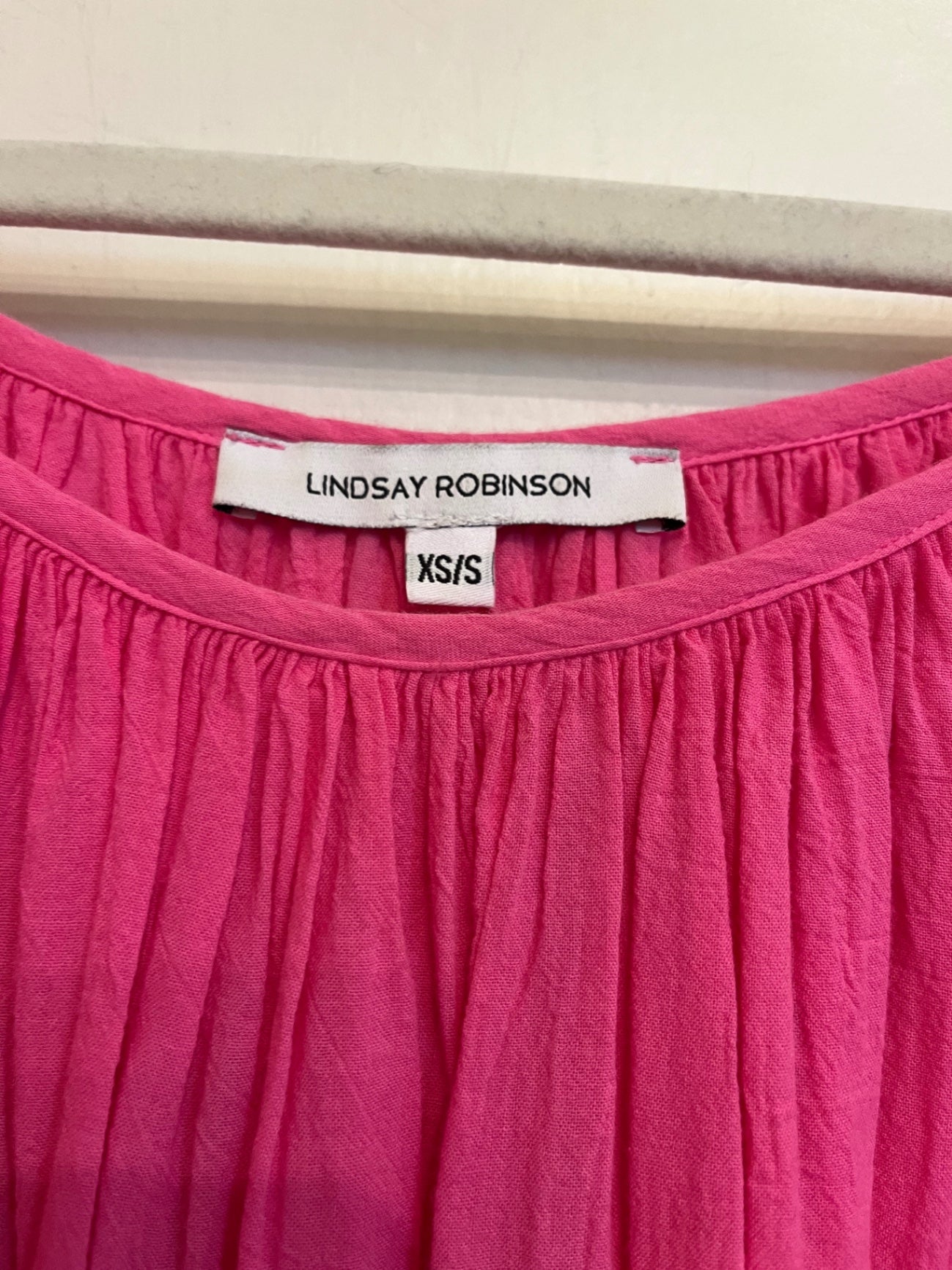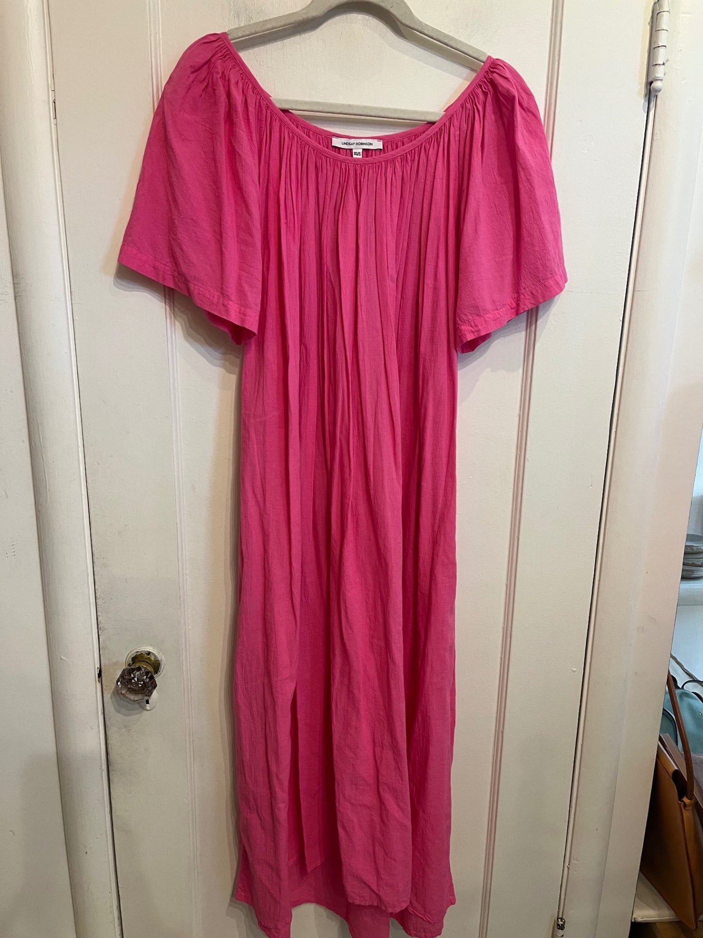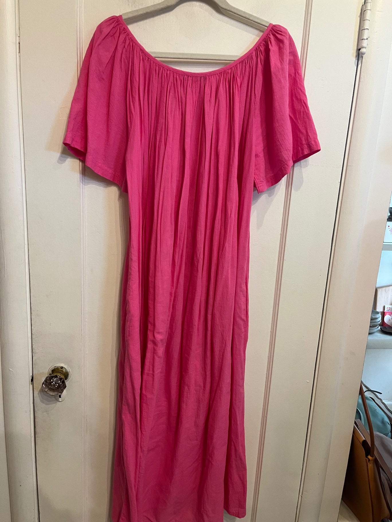 Soft cotton gauze midi dress in a vibrant pink. Features a gathered scoop neckline, relaxed silhouette, and airy drape.