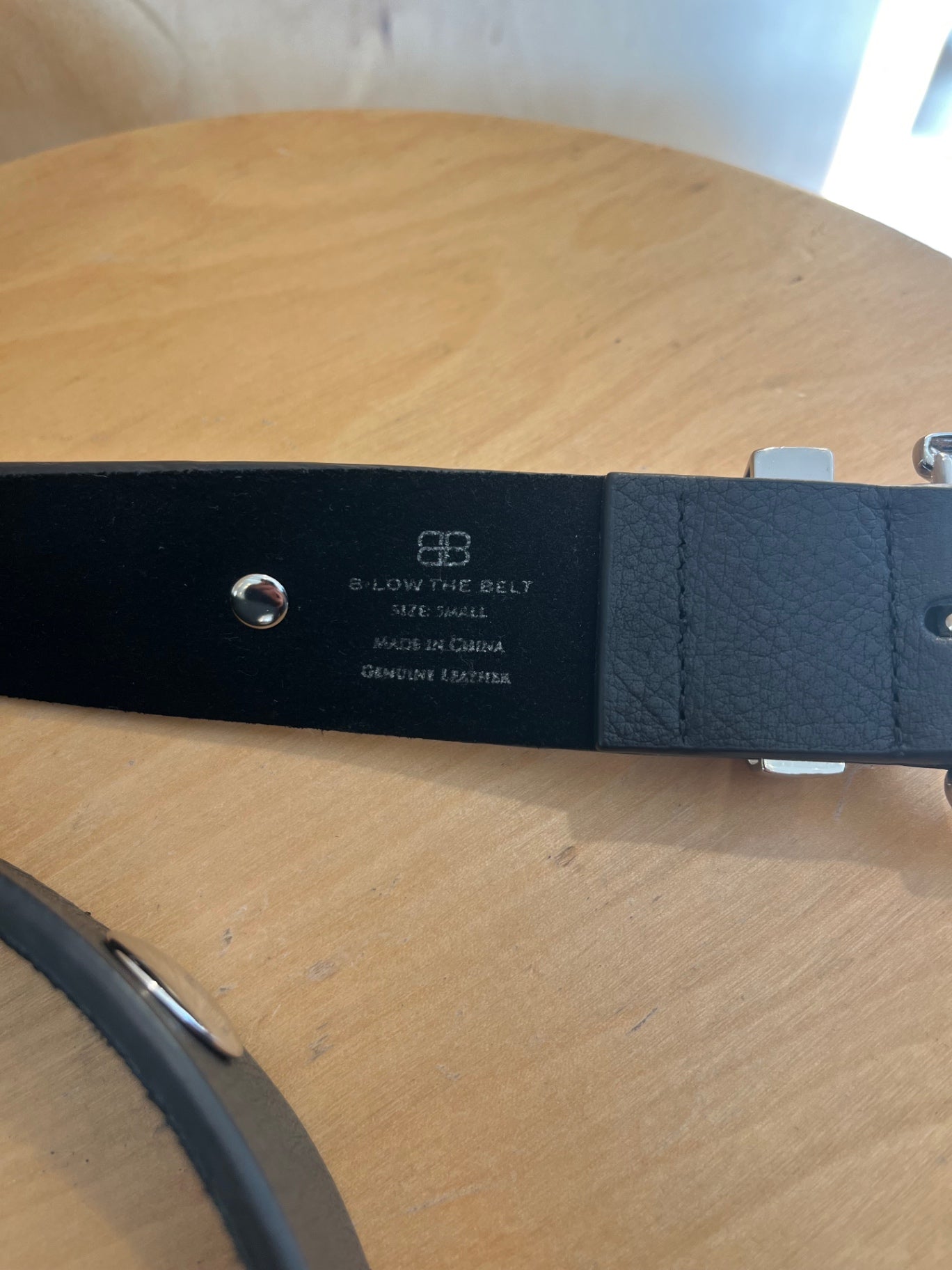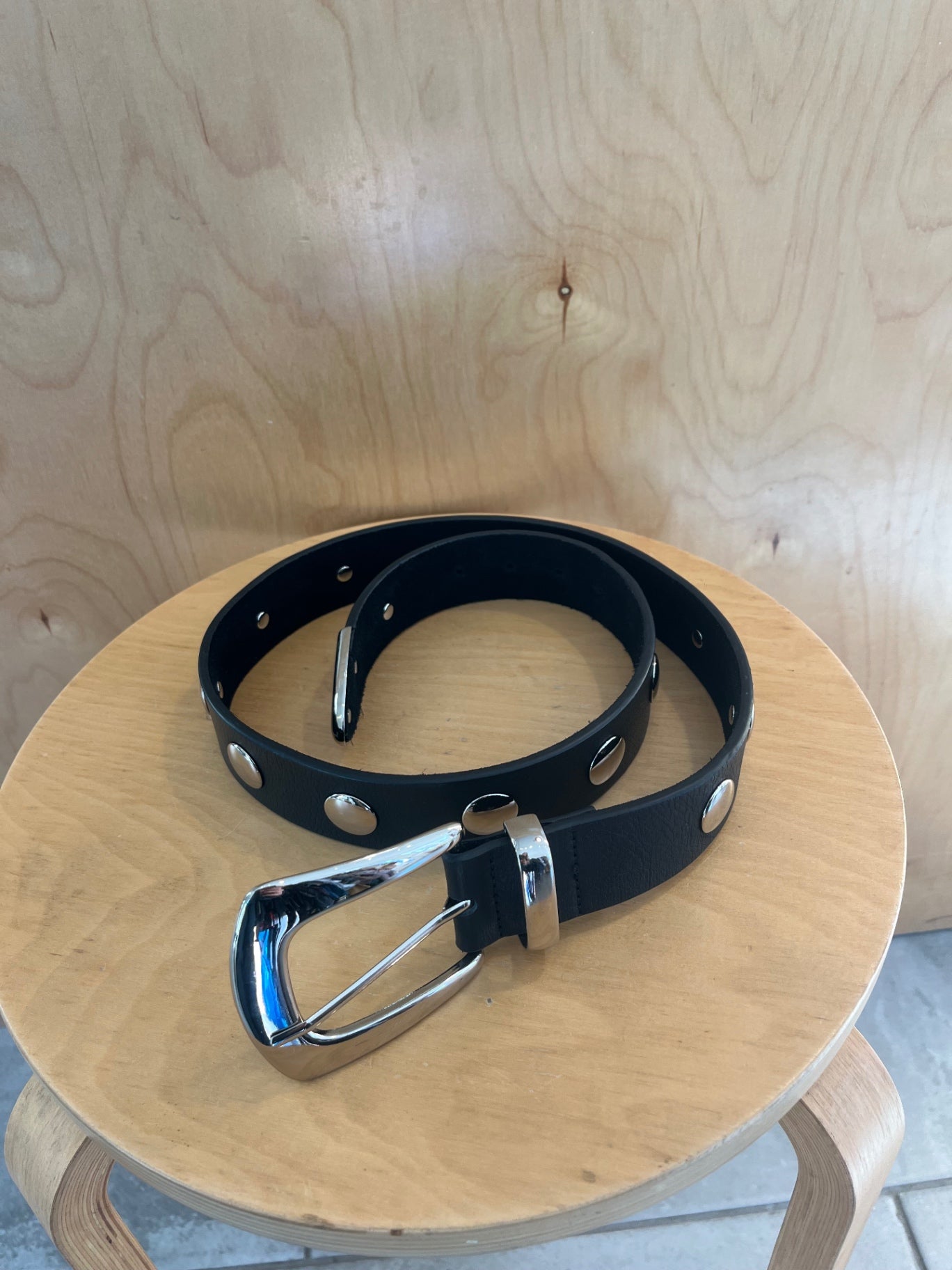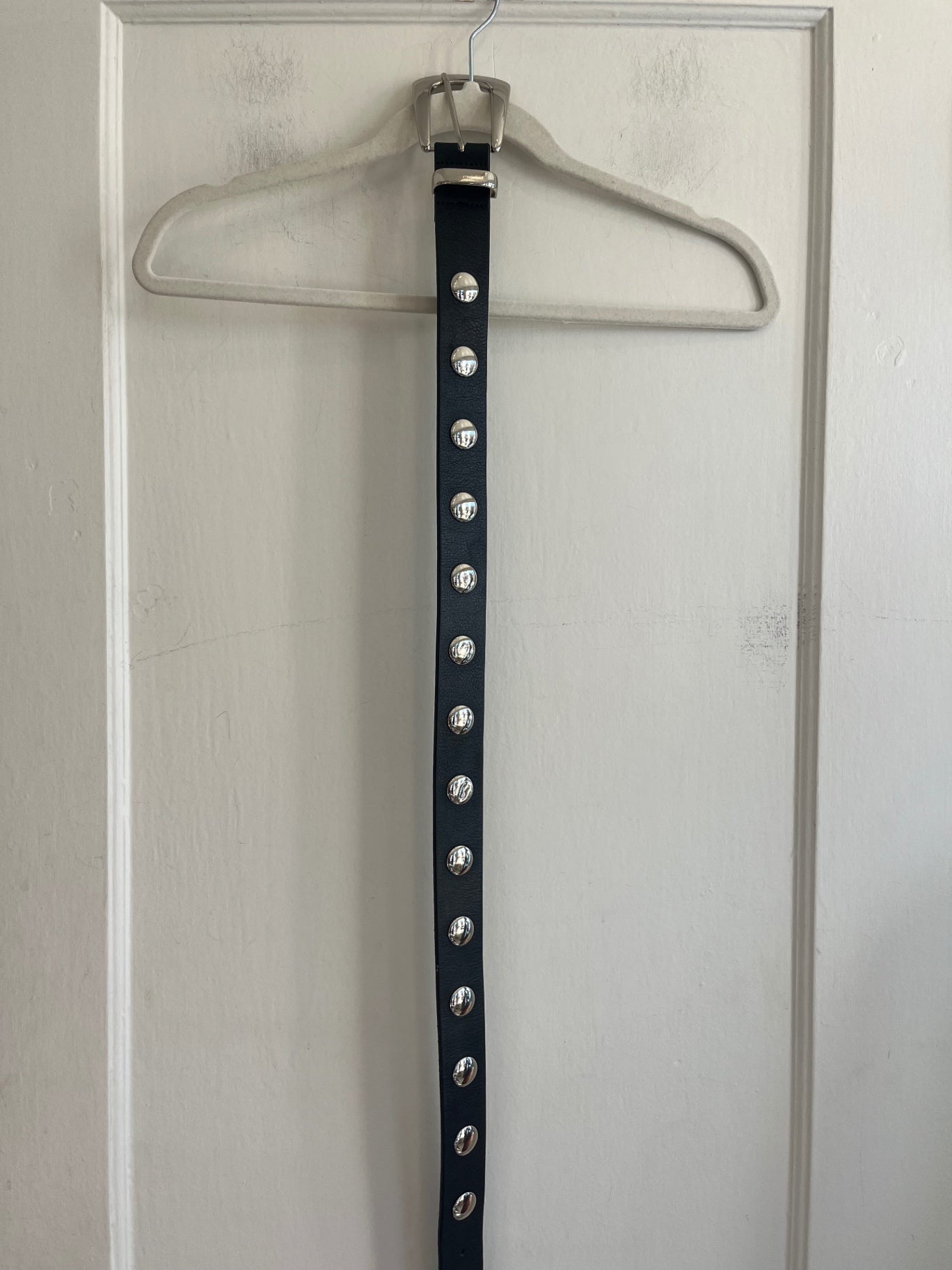Black leather belt with silver-tone buckle and stud detailing throughout.