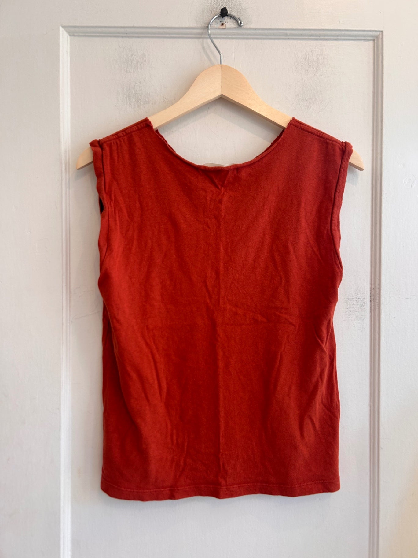 This sleeveless top features a relaxed fit and a soft, textured fabric perfect for casual days. Its simple design makes it versatile for pairing with jeans or skirts. The vibrant red hue adds a pop of color to any outfit, setting a cheerful tone. Ideal for warm weather, providing comfort and style effortlessly.