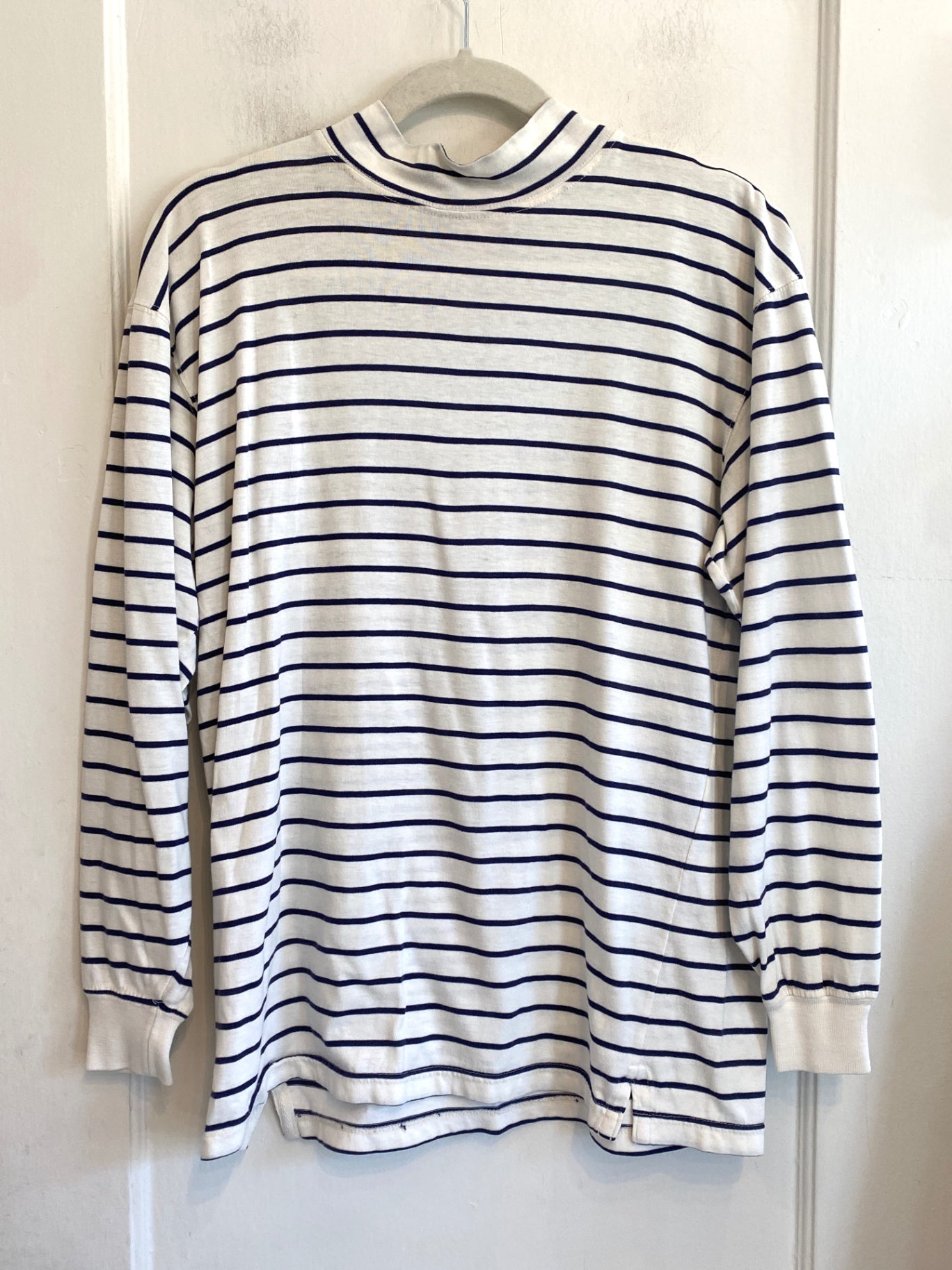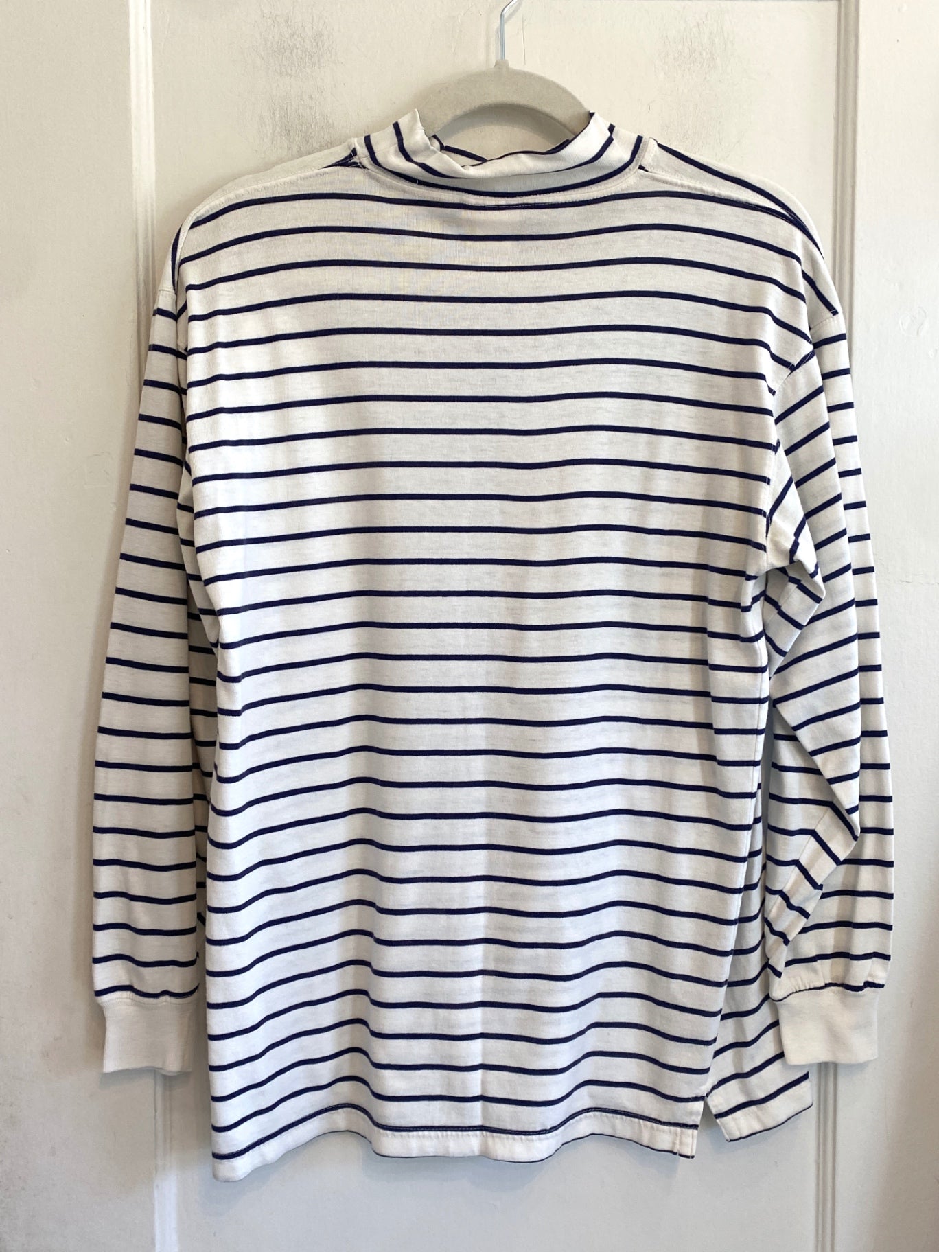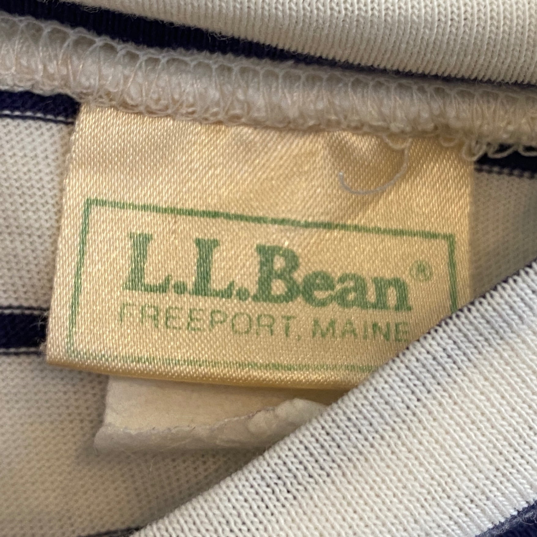 This classic L.L.Bean striped top offers a timeless nautical style. Crafted from soft cotton fabric, it features a comfortable high neckline and long sleeves. Perfect for casual outings or layering, its versatile design blends comfort with style. The distinctive navy blue stripes on a crisp white background add a touch of maritime charm.