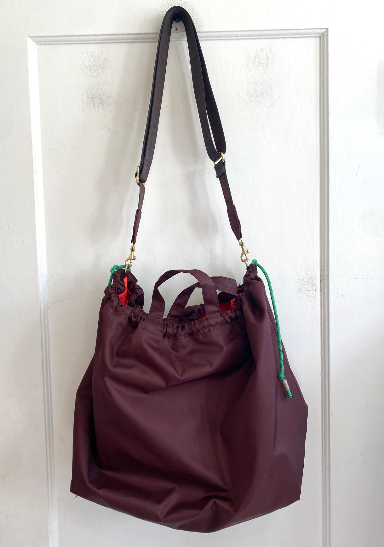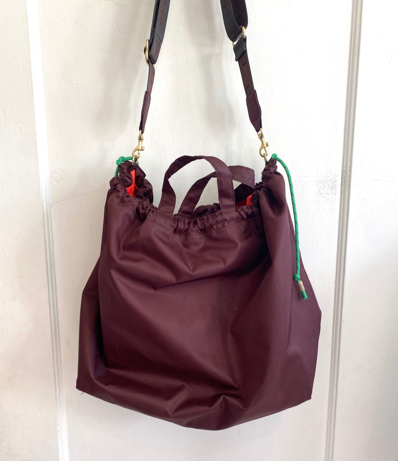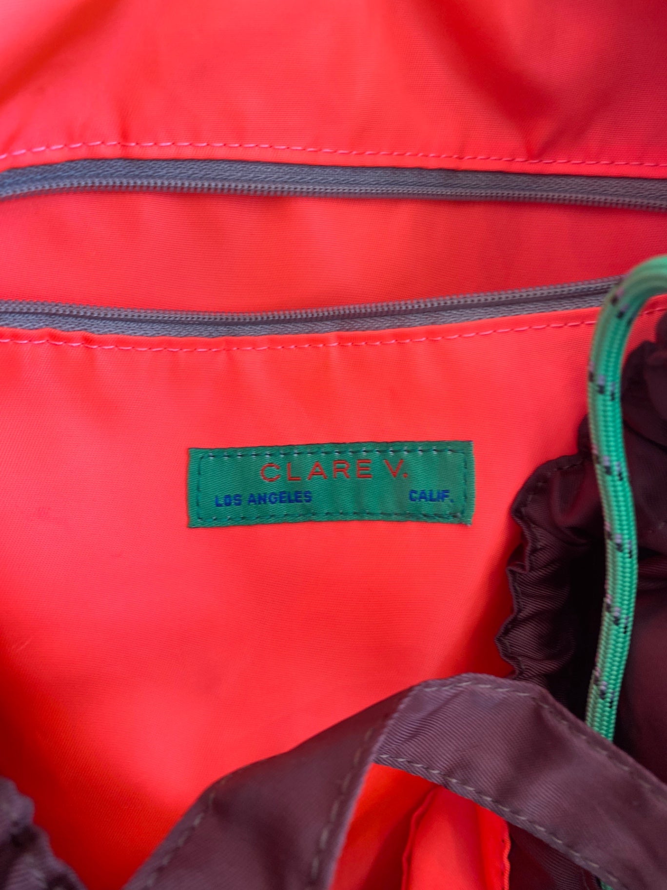 This Clare V. tote combines practicality with a sleek design, featuring a durable nylon exterior in a rich burgundy hue. The spacious interior is lined with vibrant orange fabric, complete with a handy zip pocket for small essentials. Its sturdy handles and adjustable strap make it perfect for everyday use or travel. Unique detailing includes bright green and black cord accents and gold hardware, adding a pop of color and a touch of elegance. The bag’s versatile style complements both casual and chic outfits, making it a must-have accessory.
