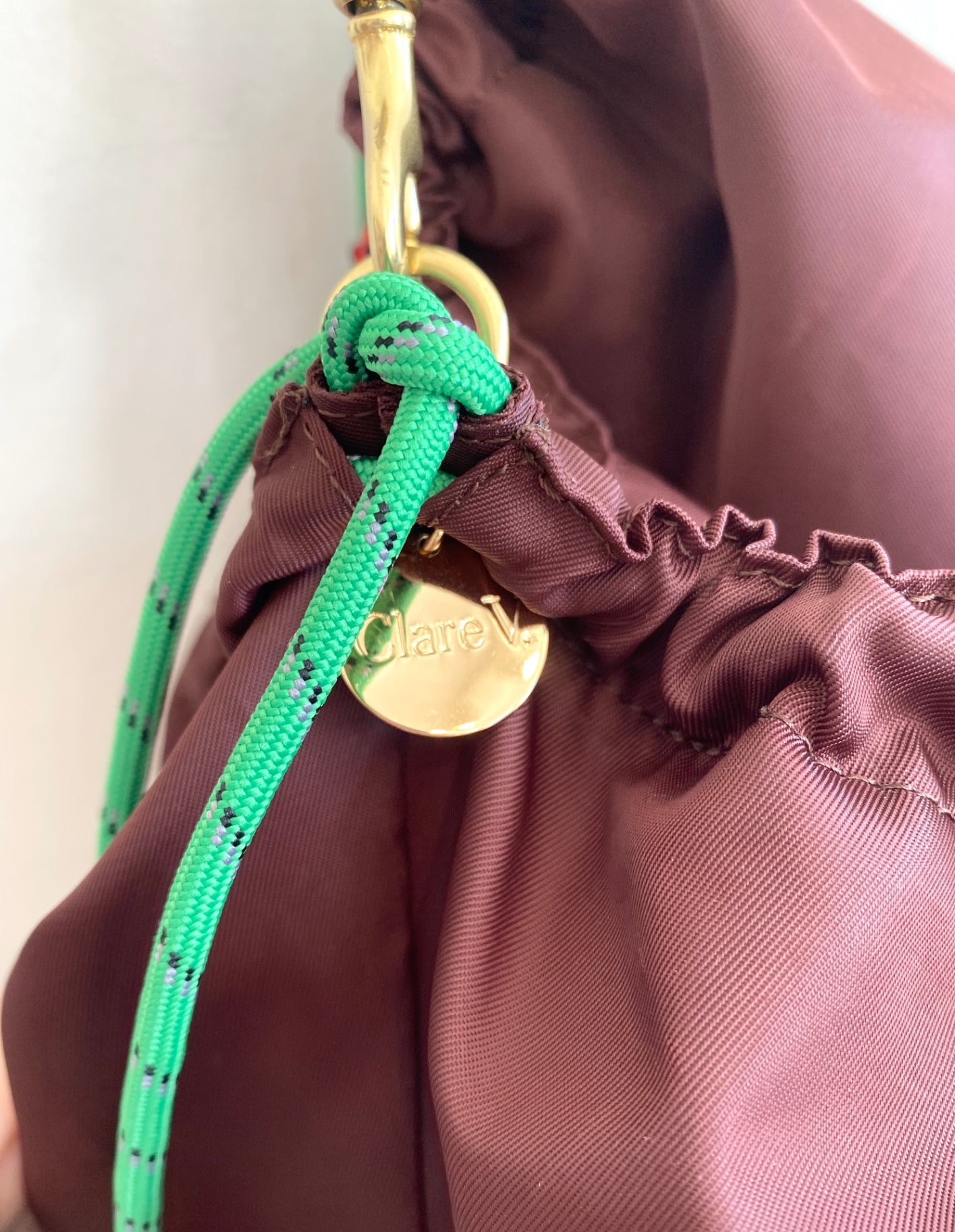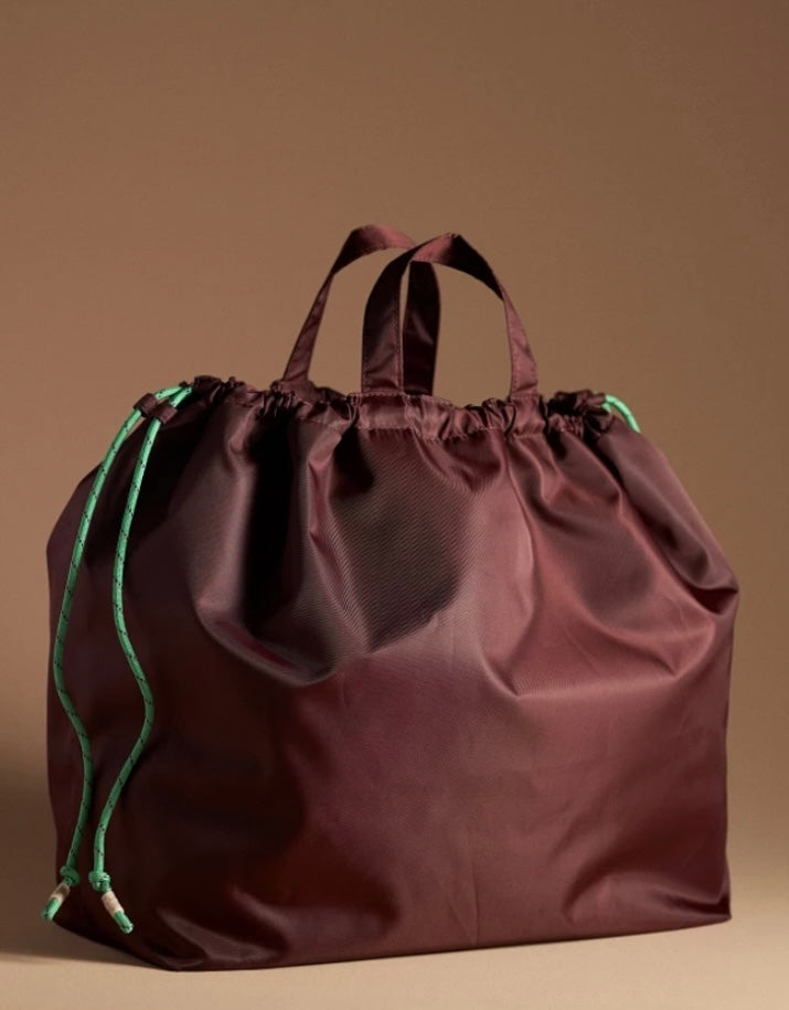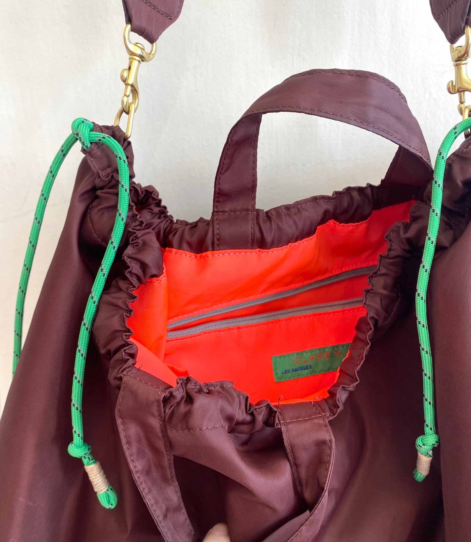 This Clare V. tote combines practicality with a sleek design, featuring a durable nylon exterior in a rich burgundy hue. The spacious interior is lined with vibrant orange fabric, complete with a handy zip pocket for small essentials. Its sturdy handles and adjustable strap make it perfect for everyday use or travel. Unique detailing includes bright green and black cord accents and gold hardware, adding a pop of color and a touch of elegance. The bag’s versatile style complements both casual and chic outfits, making it a must-have accessory.