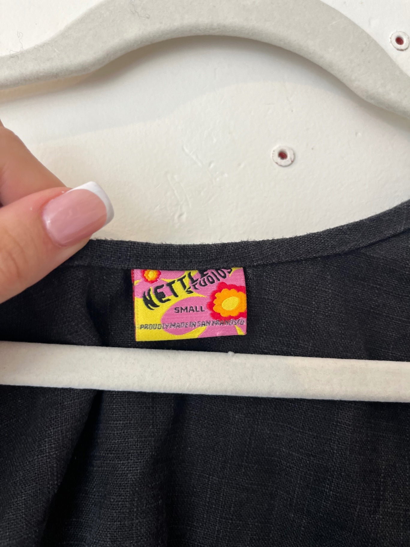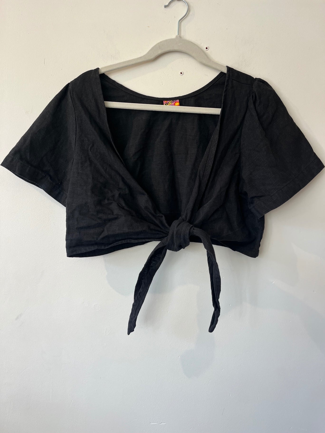 Short-sleeve linen tie front blouse handmade in San Francisco.