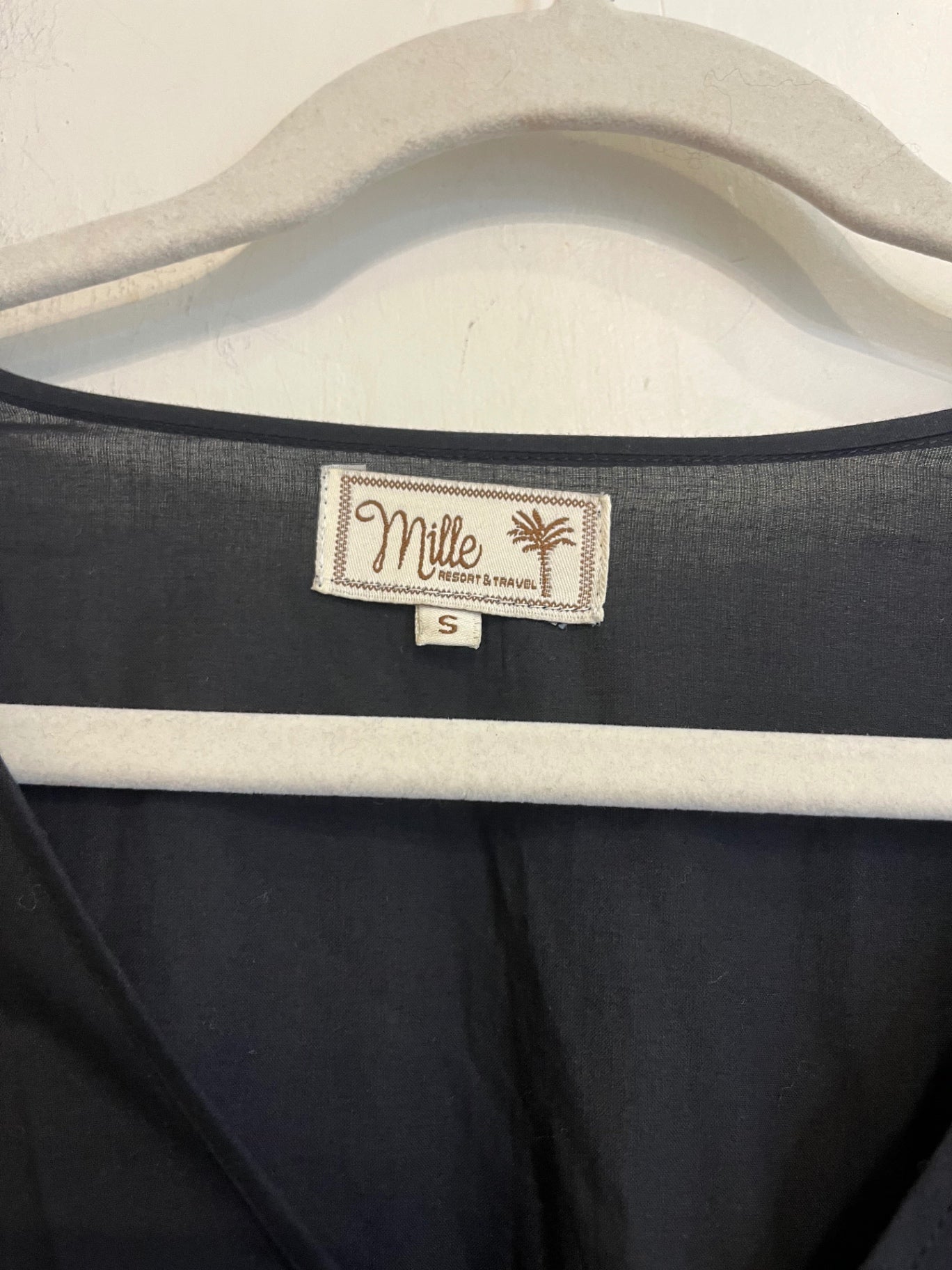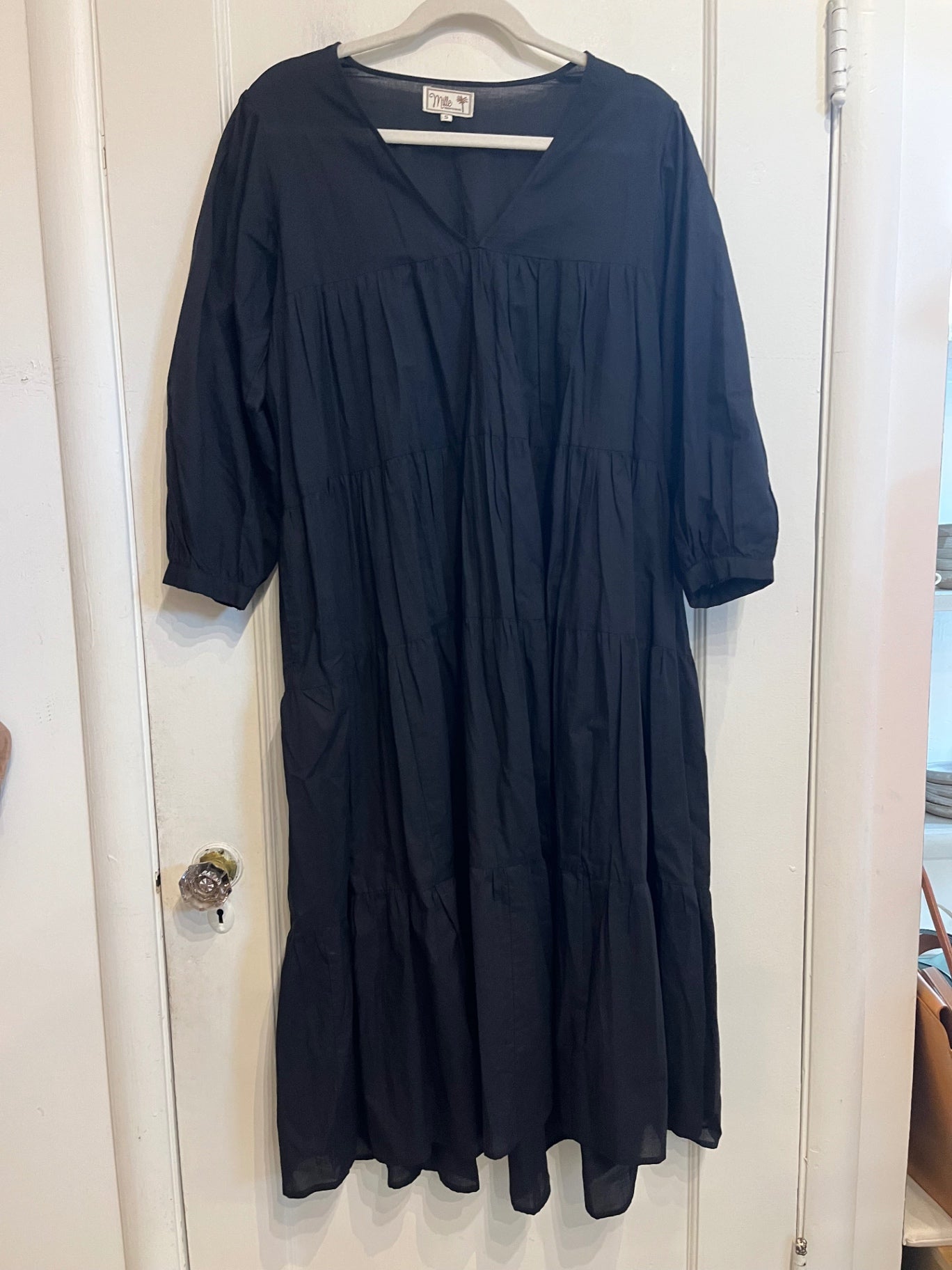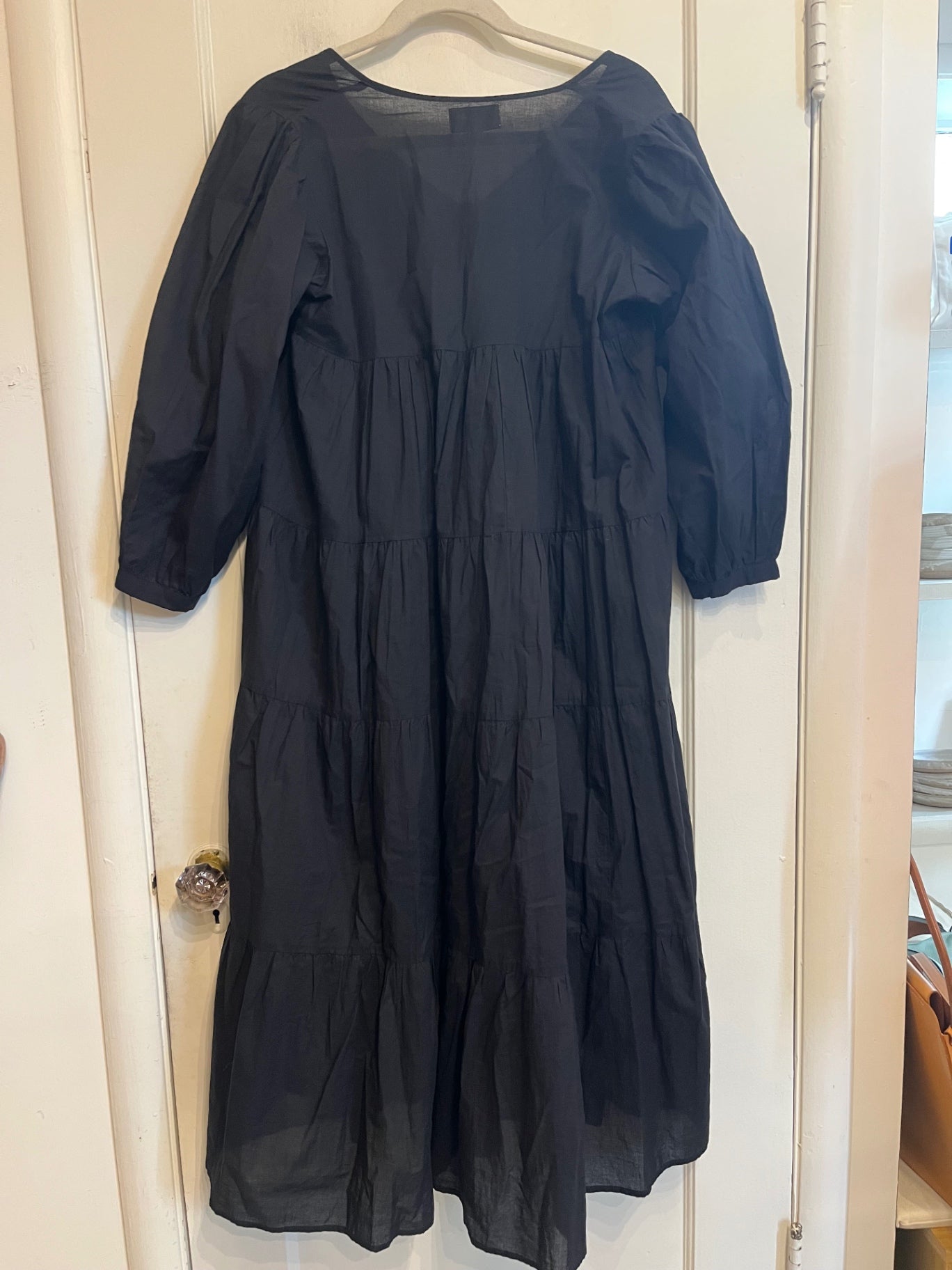 Black cotton tiered dress with relaxed fit and soft volume. Features v-neckline and 3/4 sleeves.