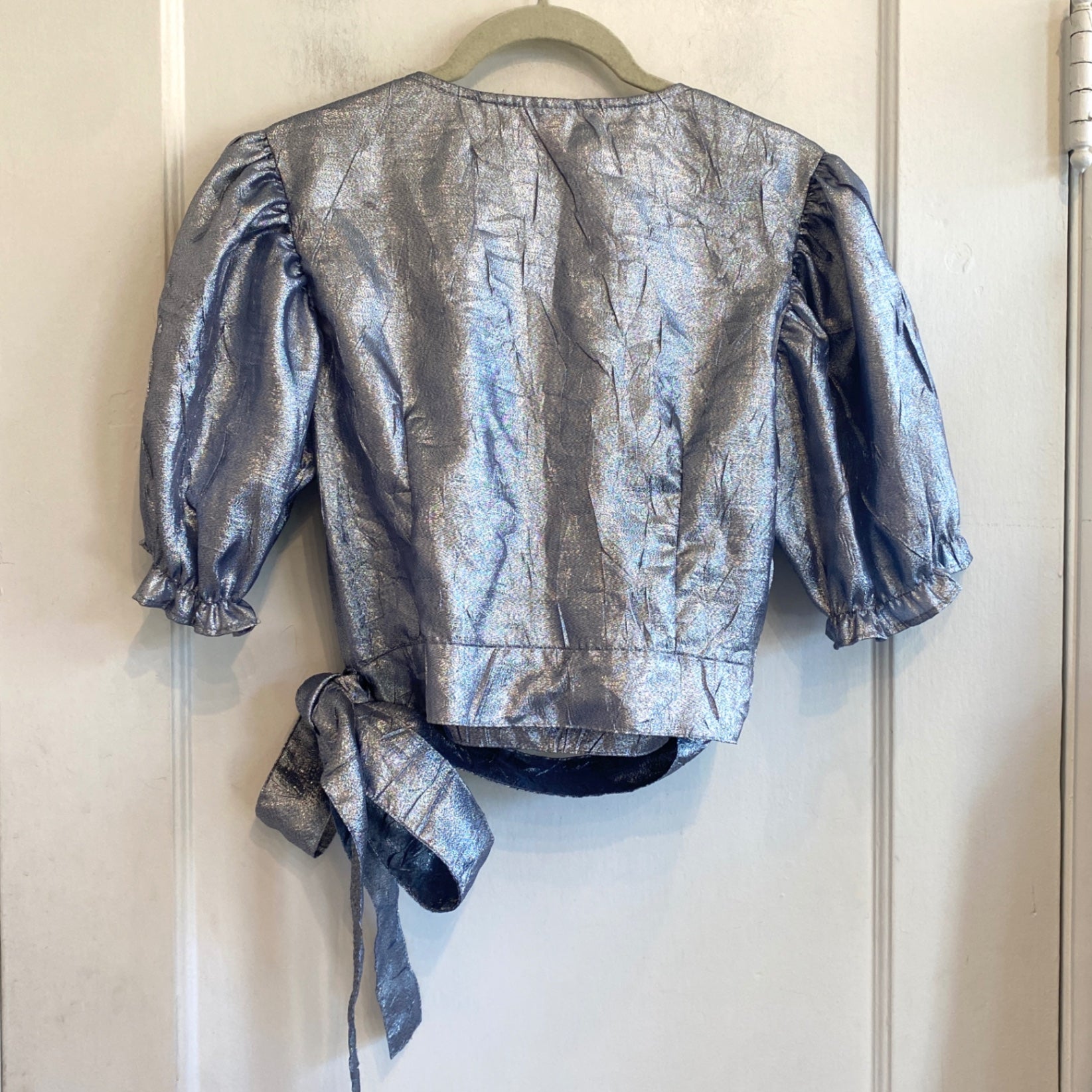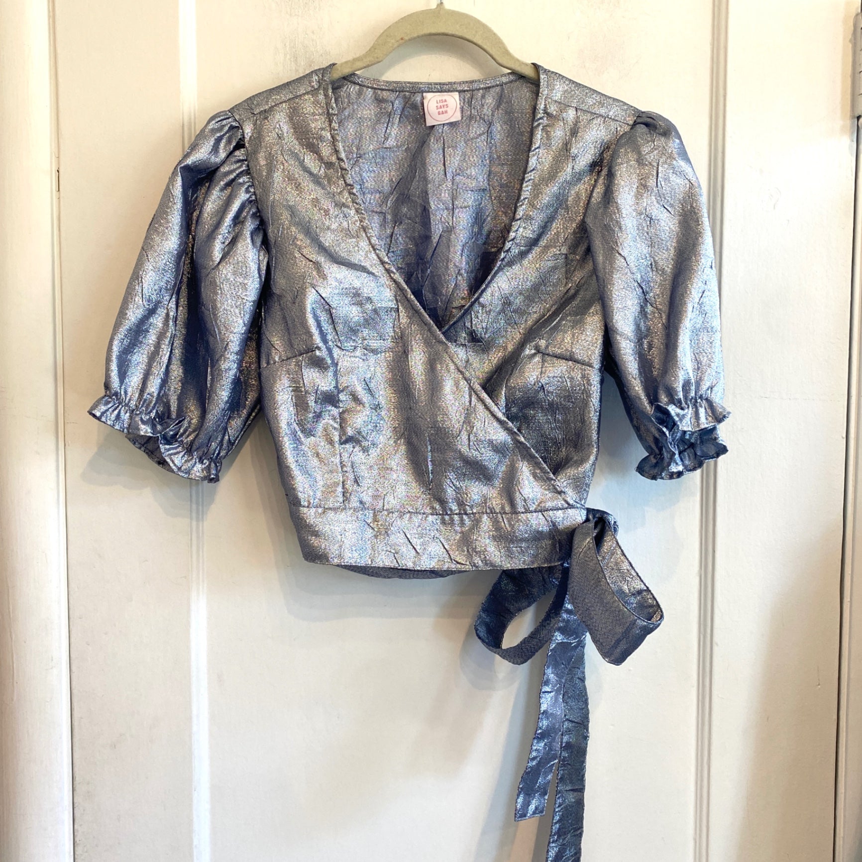 This elegant metallic top features a shimmering silver fabric with a textured, slightly crinkled finish. It has puffed sleeves with ruffled elastic cuffs, and a wrap-style front with a side tie detail. The cropped silhouette makes it a fashionable choice for parties or special events. The structured shoulders add a stylish touch to this statement piece. Perfect for pairing with high-waisted skirts or jeans for a chic look.