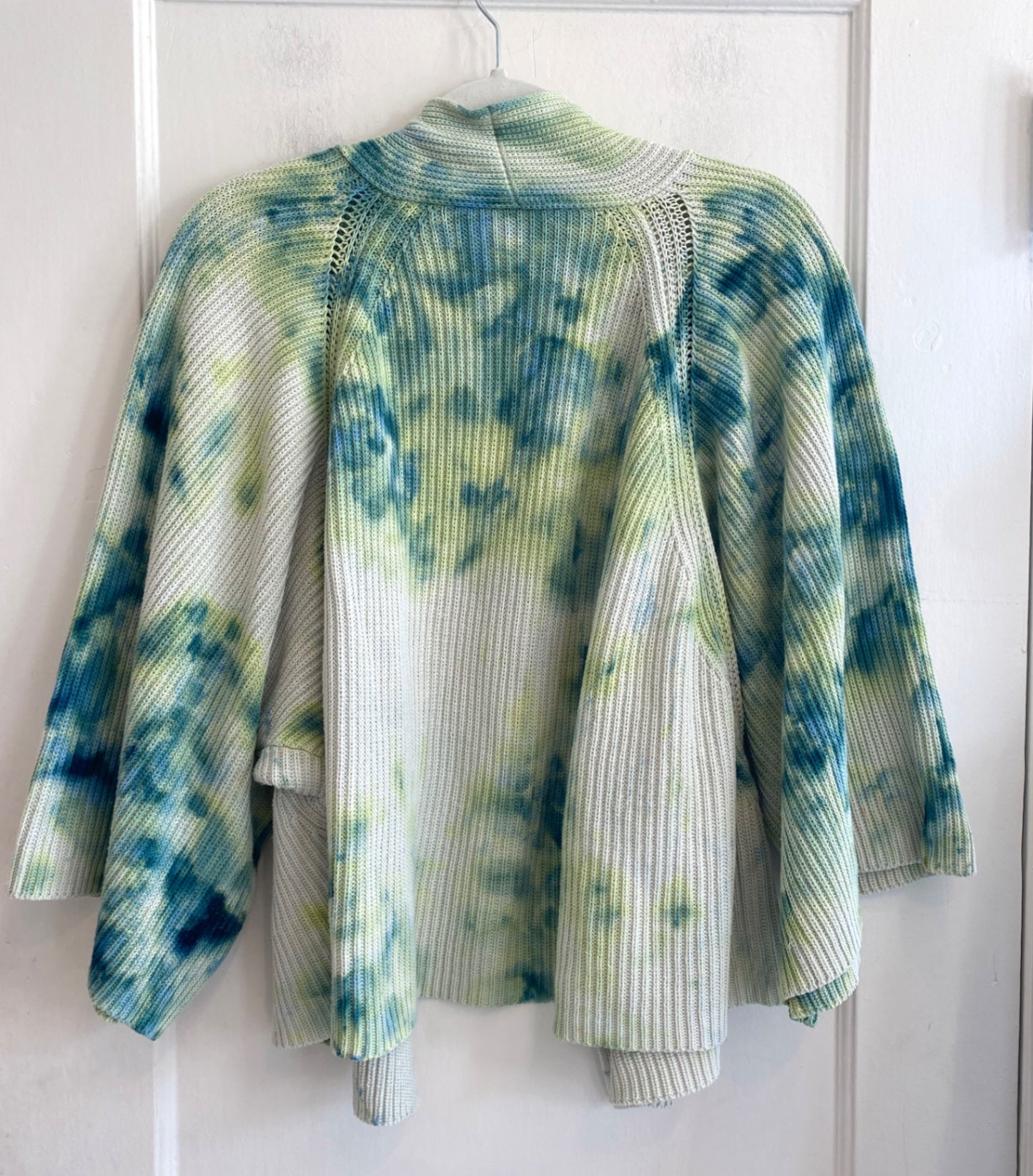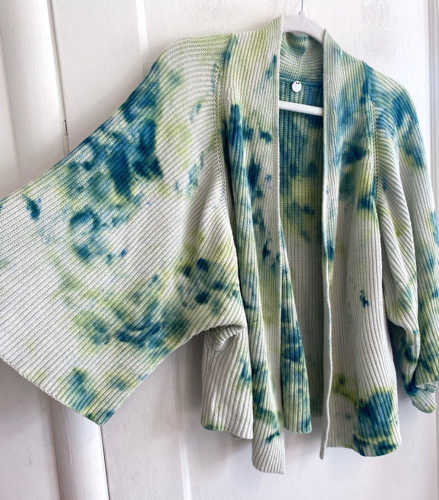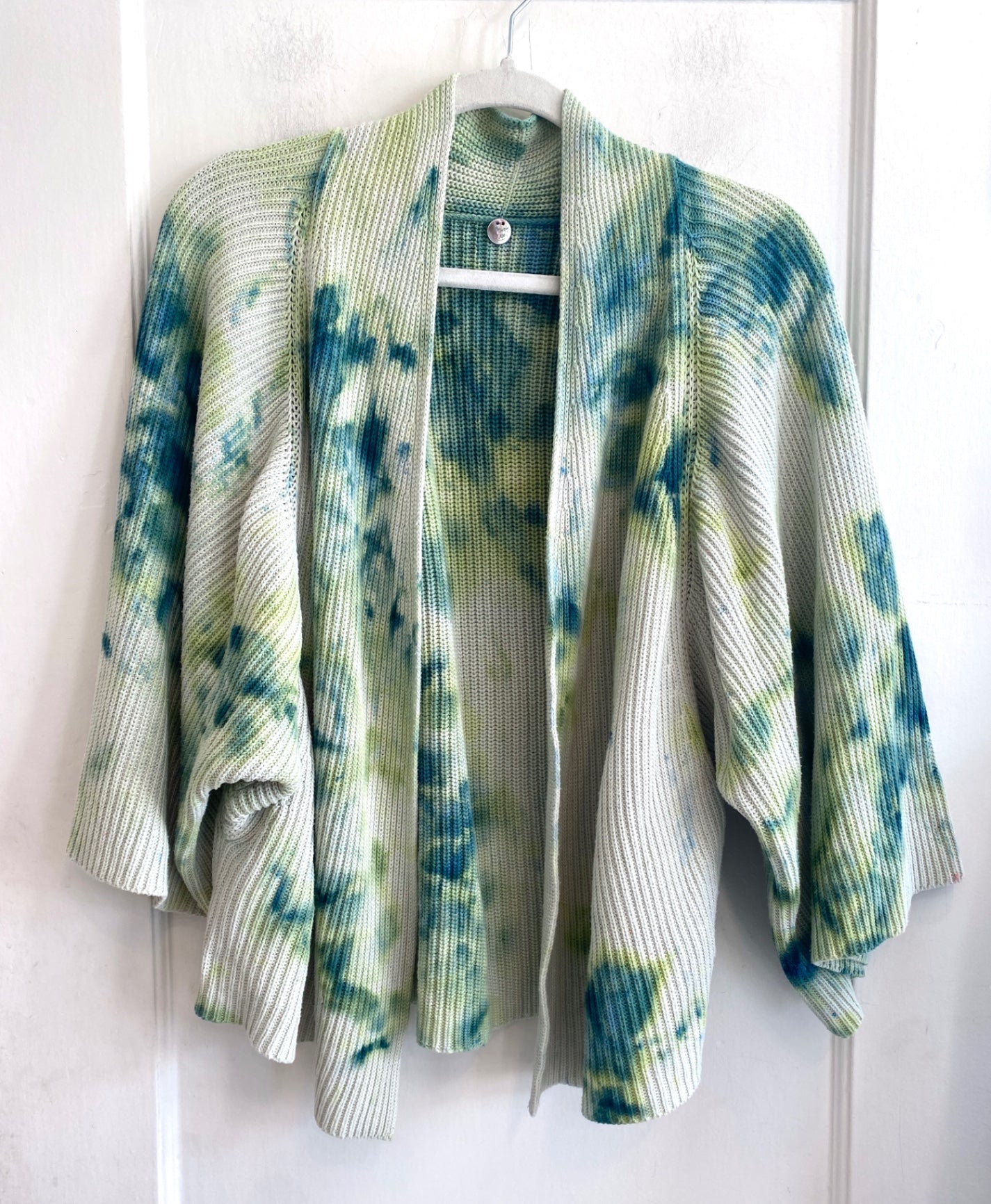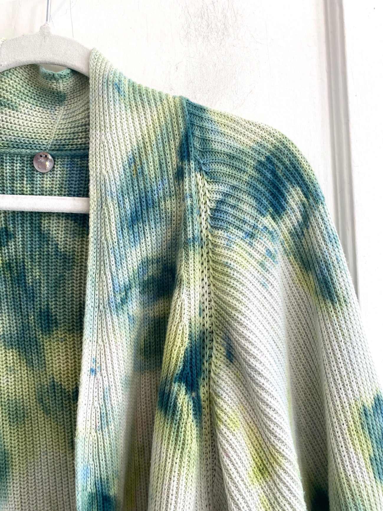 One-of-a-kind, reimagined cardigan sweater from Margaret O’Leary, hand dyed in Oakland, CA.