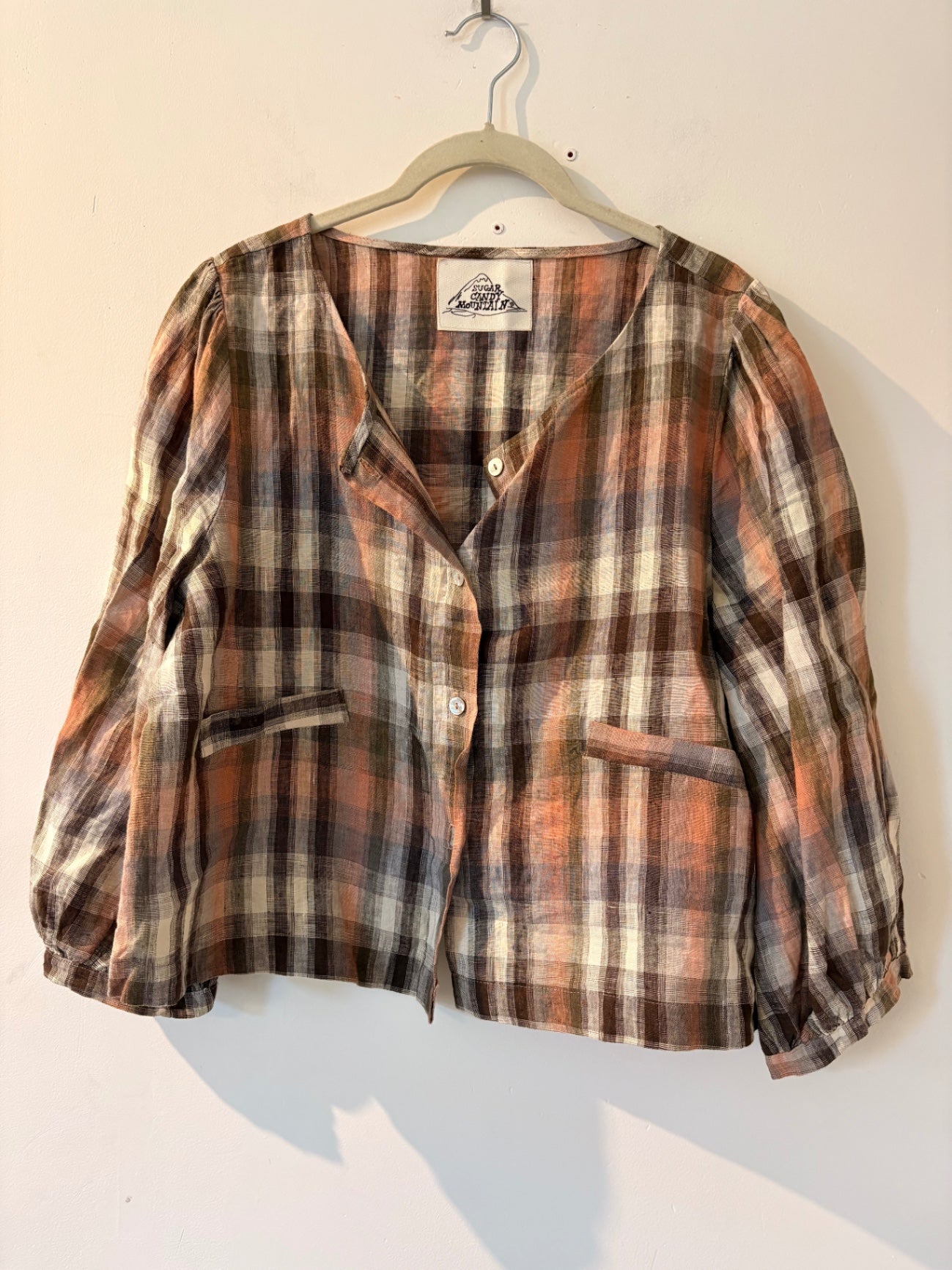 Light woven top in a warm plaid mix. Features a v-neckline, button down front, and front pockets.