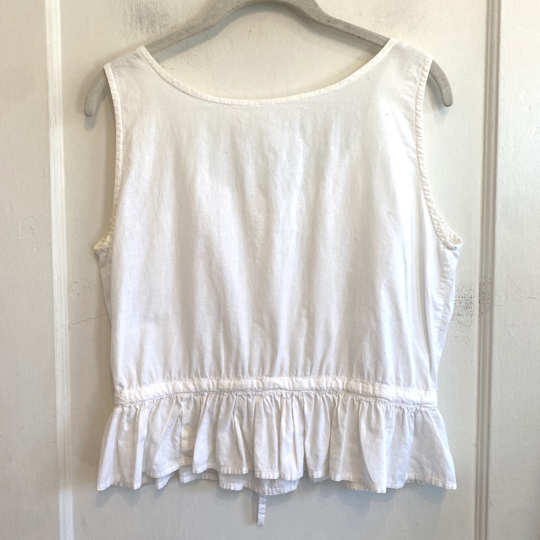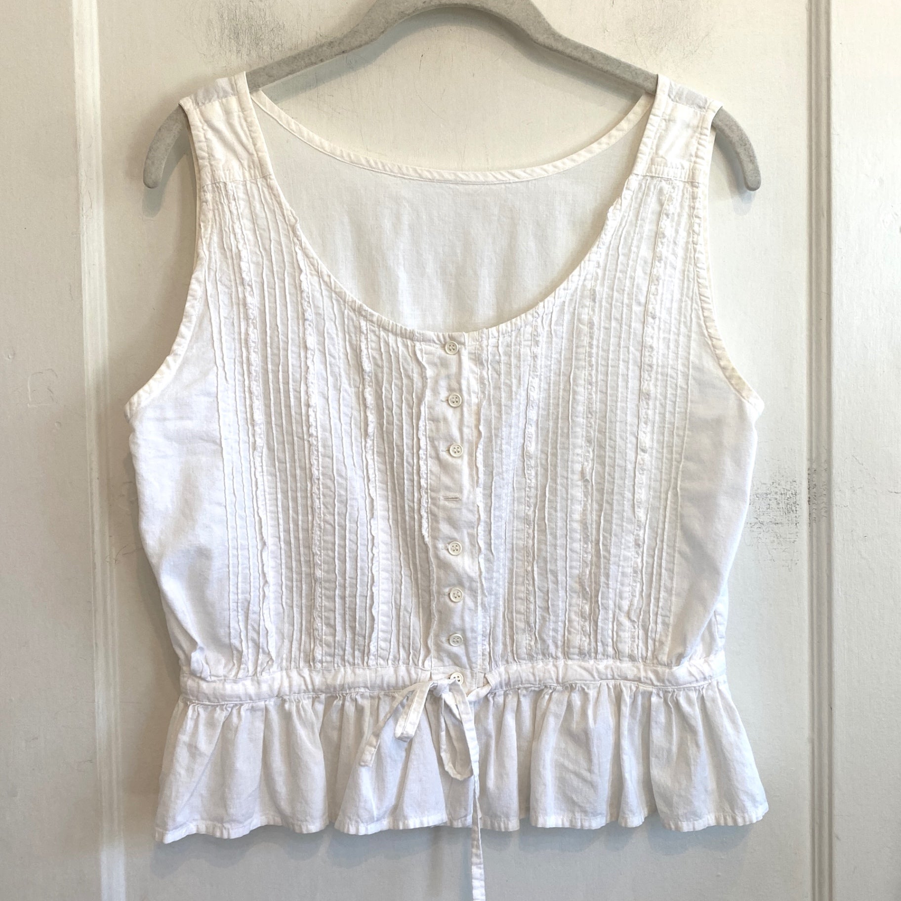 This is a sleeveless white linen top featuring a button-down front and a ruffled hem. The top has vertical textured lines adding a subtle design detail. It has a casual, breezy style suitable for warm weather. The drawstring at the waist allows for a customizable fit, making it versatile for everyday wear or casual outings.
