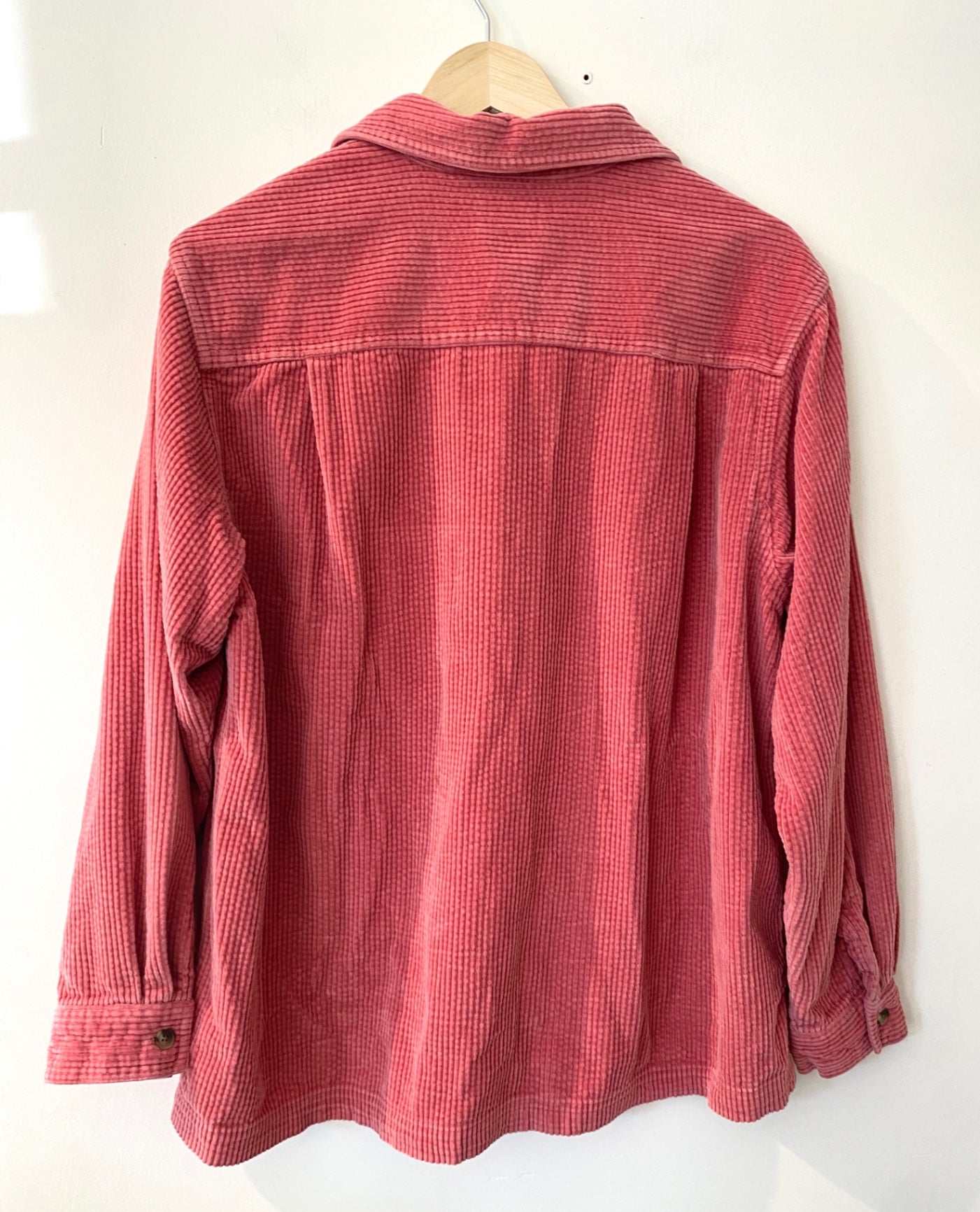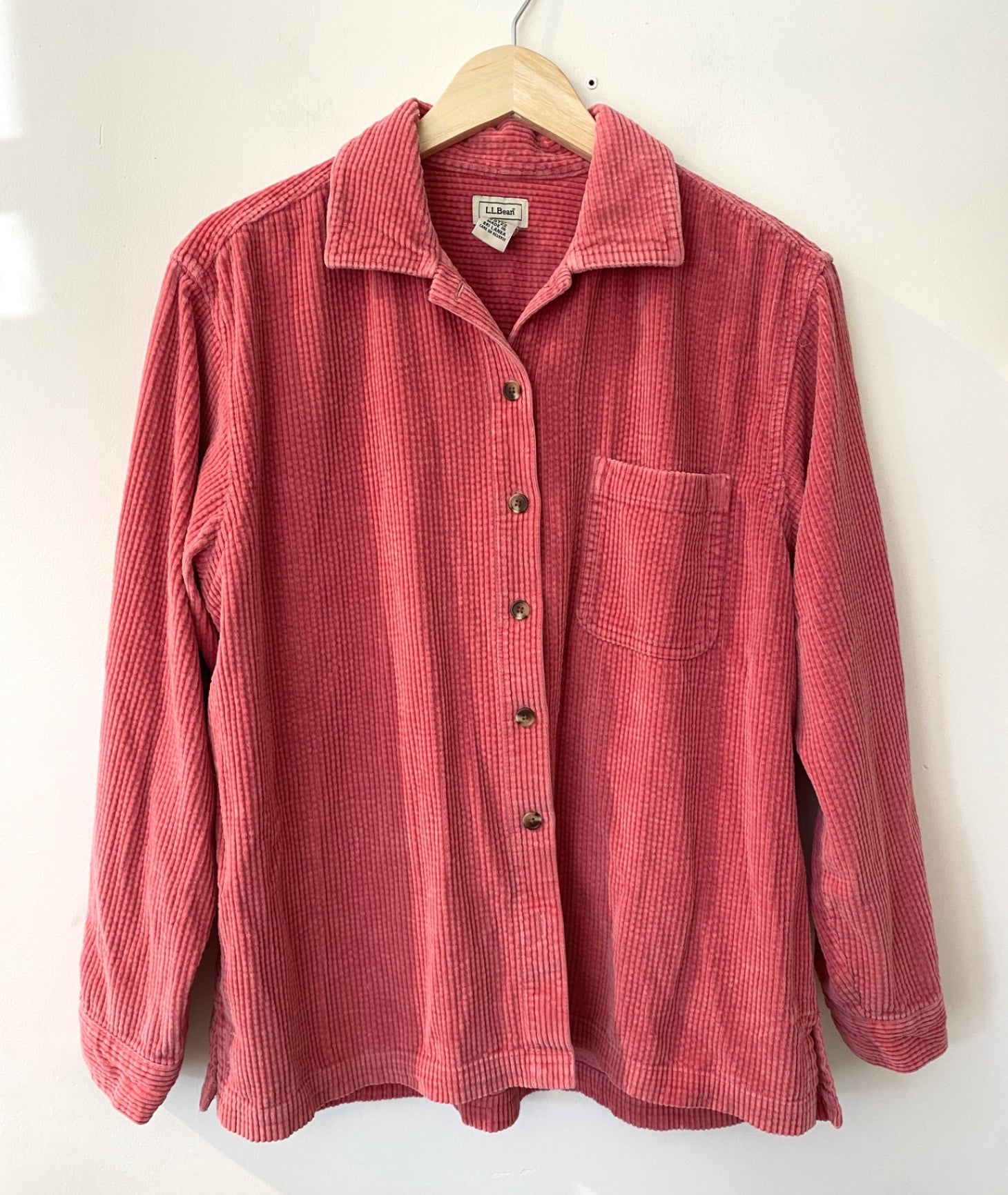 A cozy pink corduroy shirt from L.L. Bean that's perfect for casual days. Its soft, ridged fabric adds texture and warmth. The classic collar and chest pocket give it a timeless appeal, enhancing any casual ensemble. Ideal for layering during cooler weather, this versatile shirt seamlessly blends comfort with style.