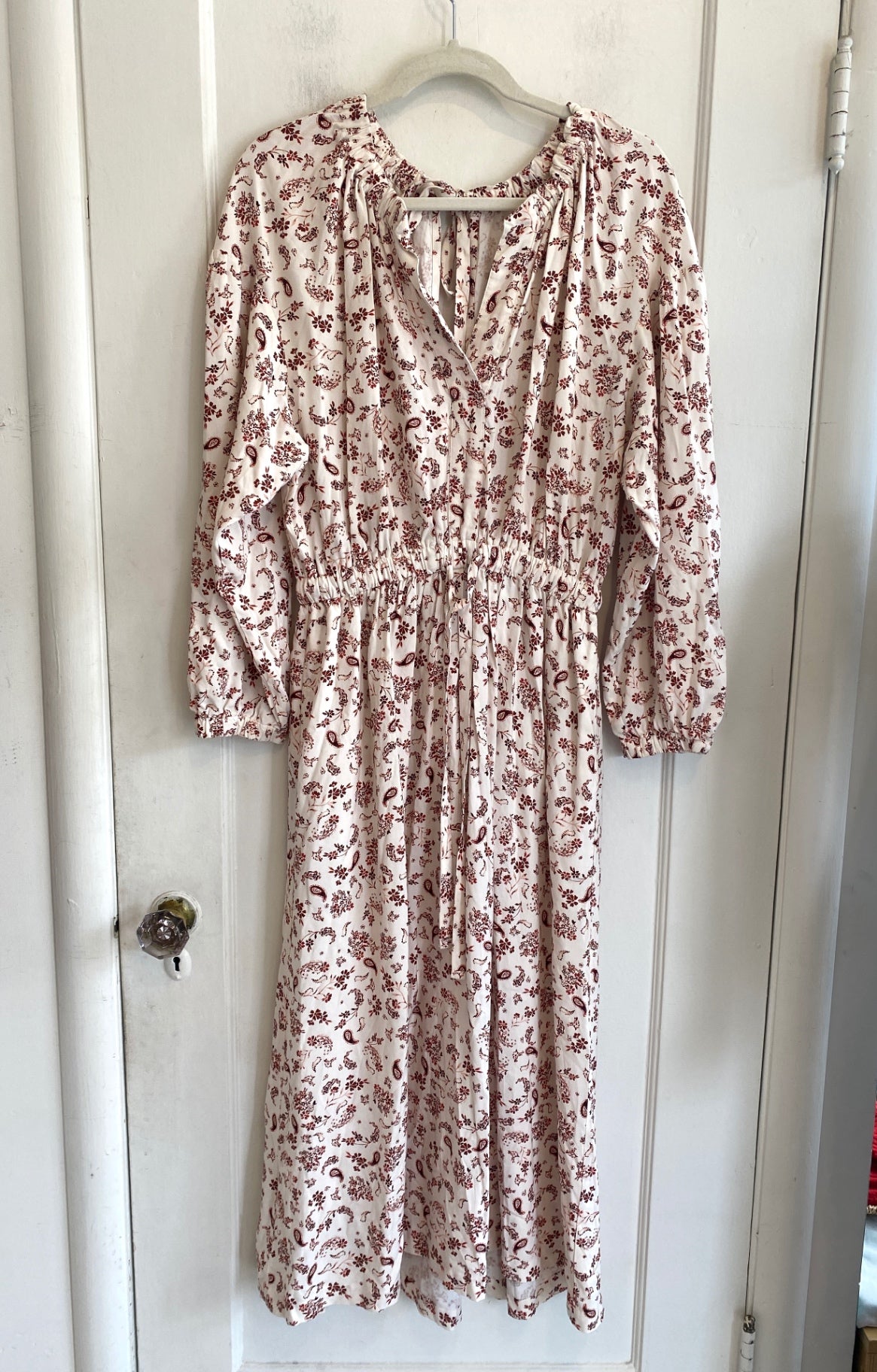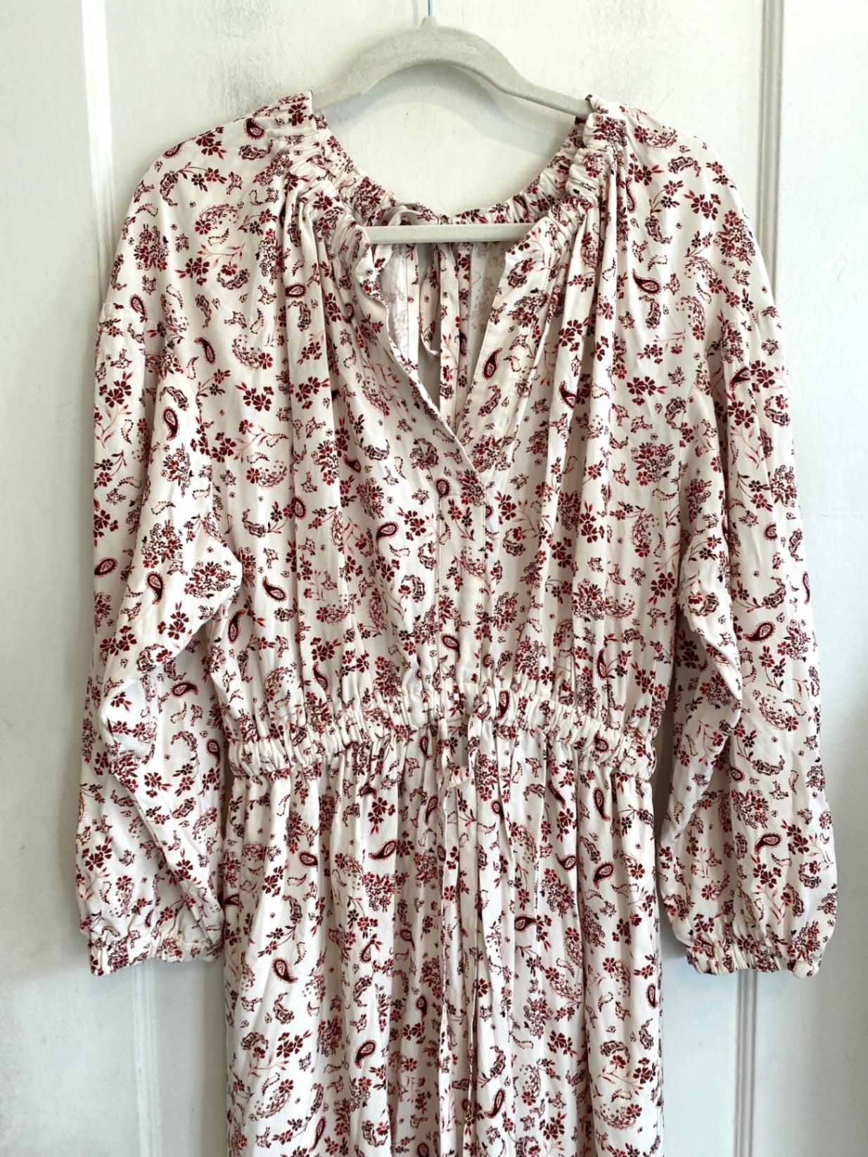 This flowing maxi dress features a charming red floral pattern on a cream background, perfect for spring and summer days. The dress is designed with a gathered neckline and a cinched waist that flatters every silhouette. Its full-length skirt adds a breezy, relaxed vibe, ideal for casual outings or garden parties. Soft, breathable fabric ensures comfort while maintaining an effortlessly stylish look. The long sleeves and ruffled neckline add charming details that elevate the overall aesthetic.