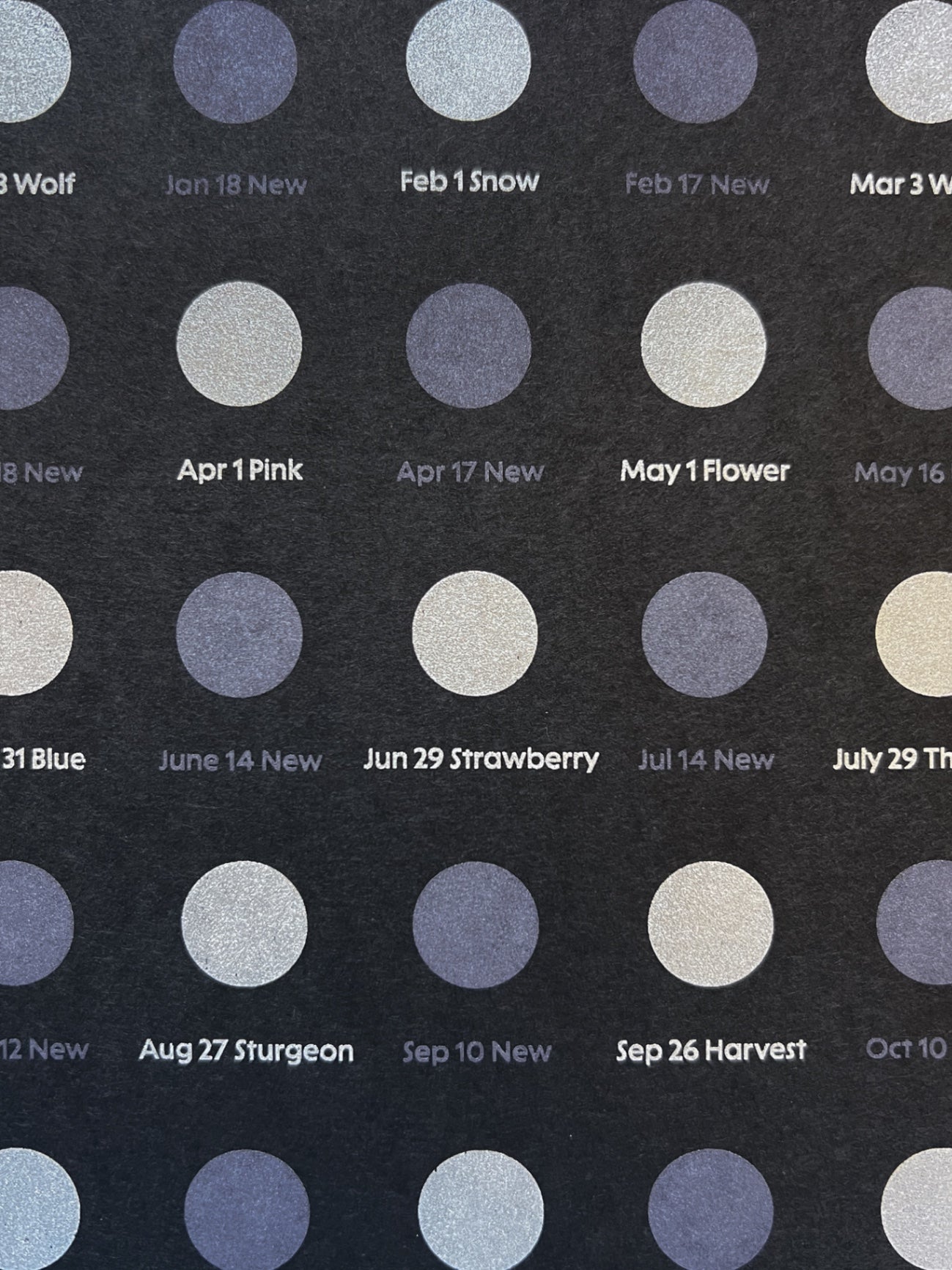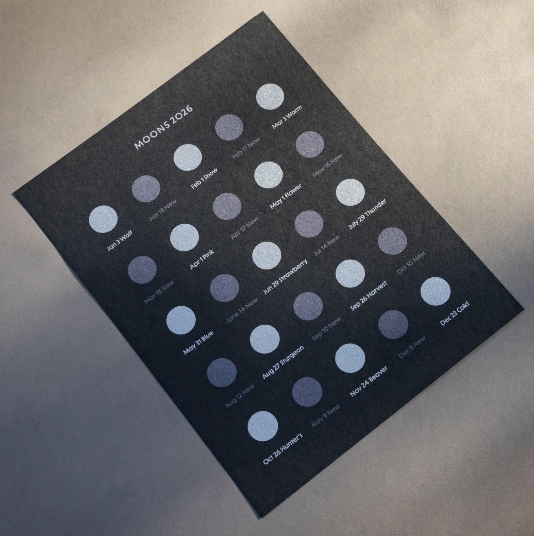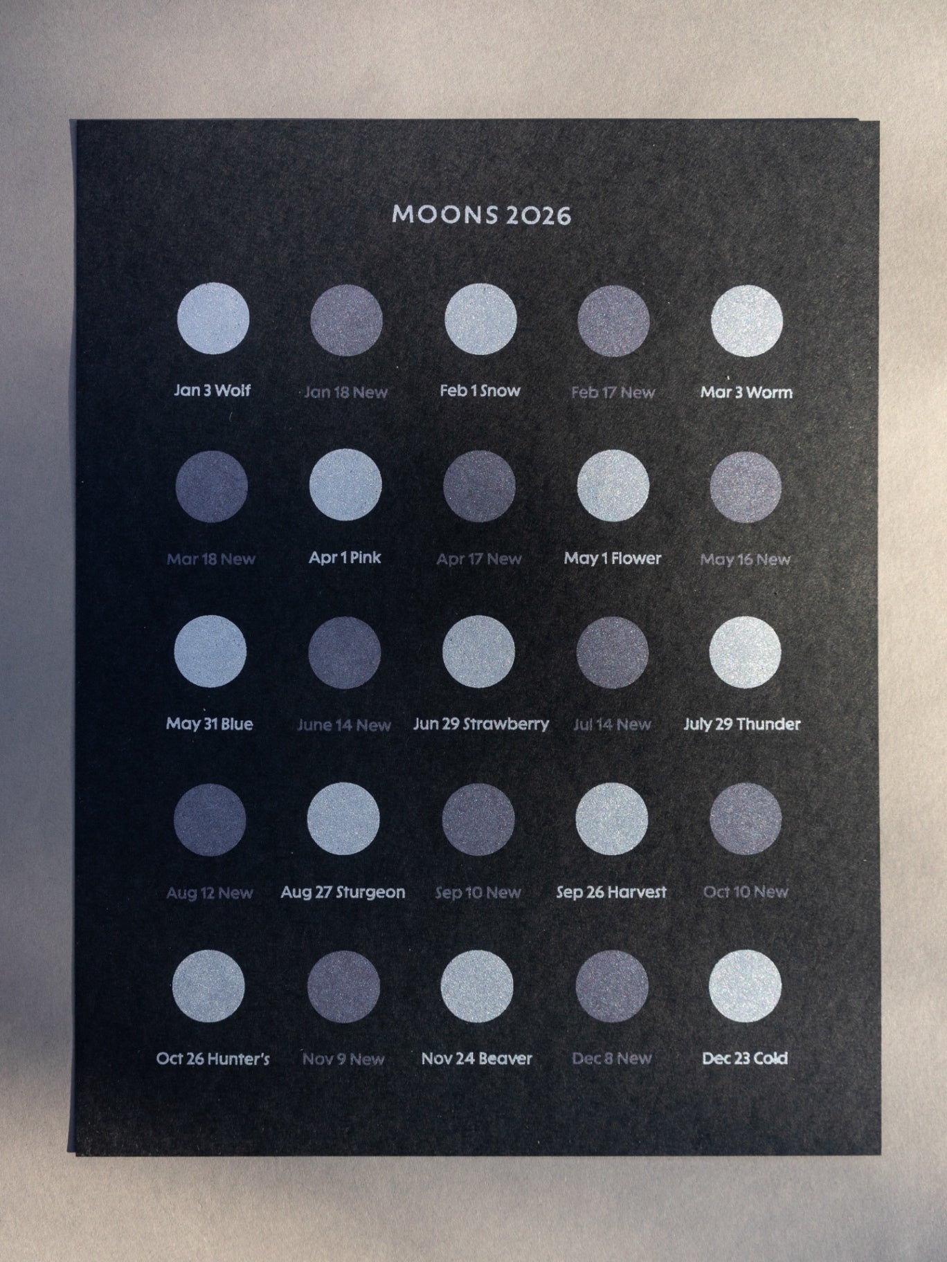 This hand-silkscreened single-sided calendar features the dates of 2026 full and new moons. Each full moon is accompanied by a corresponding folk name. 2026 will be a unique year: there is a blue moon (two full moons in one month)!