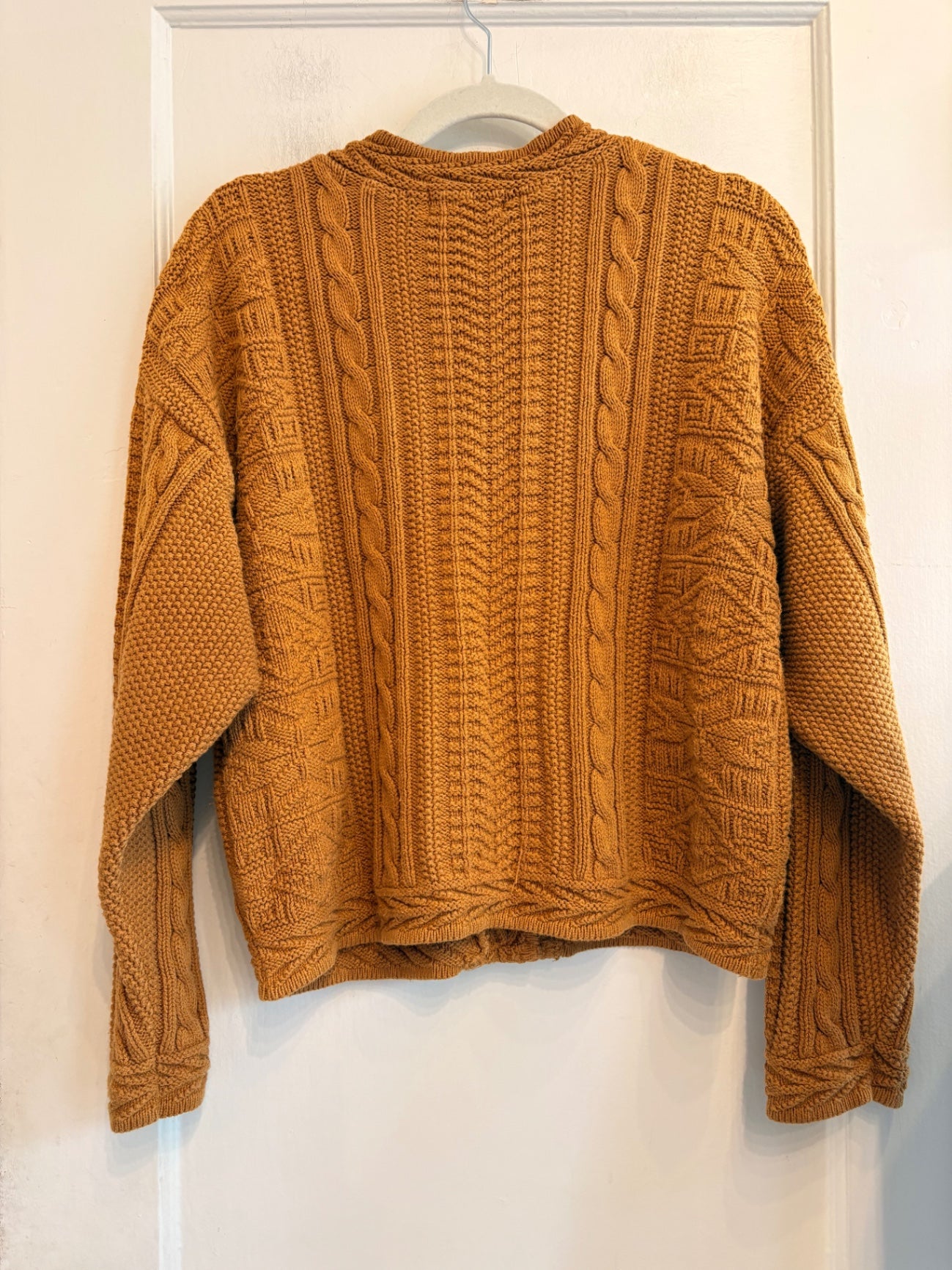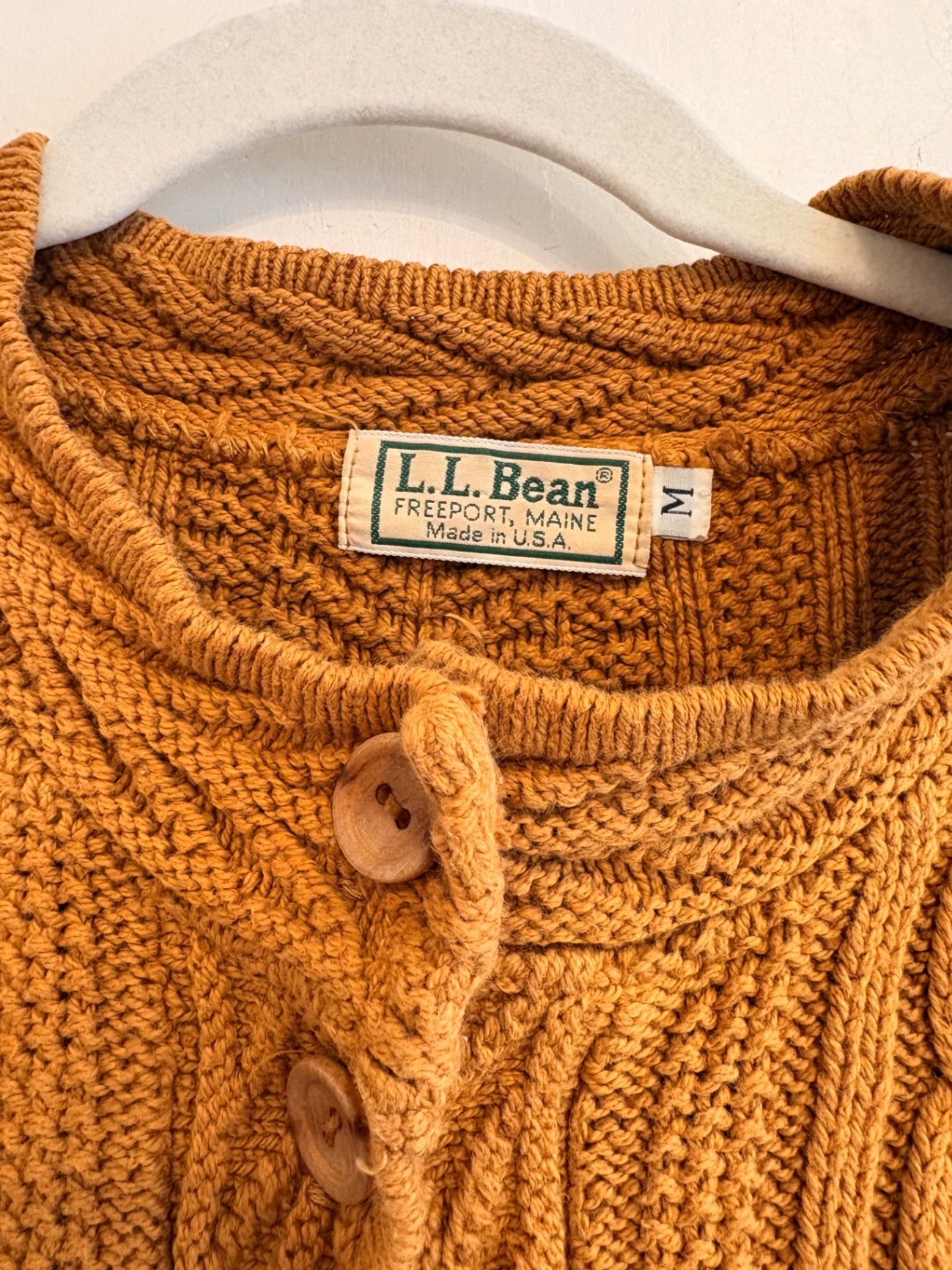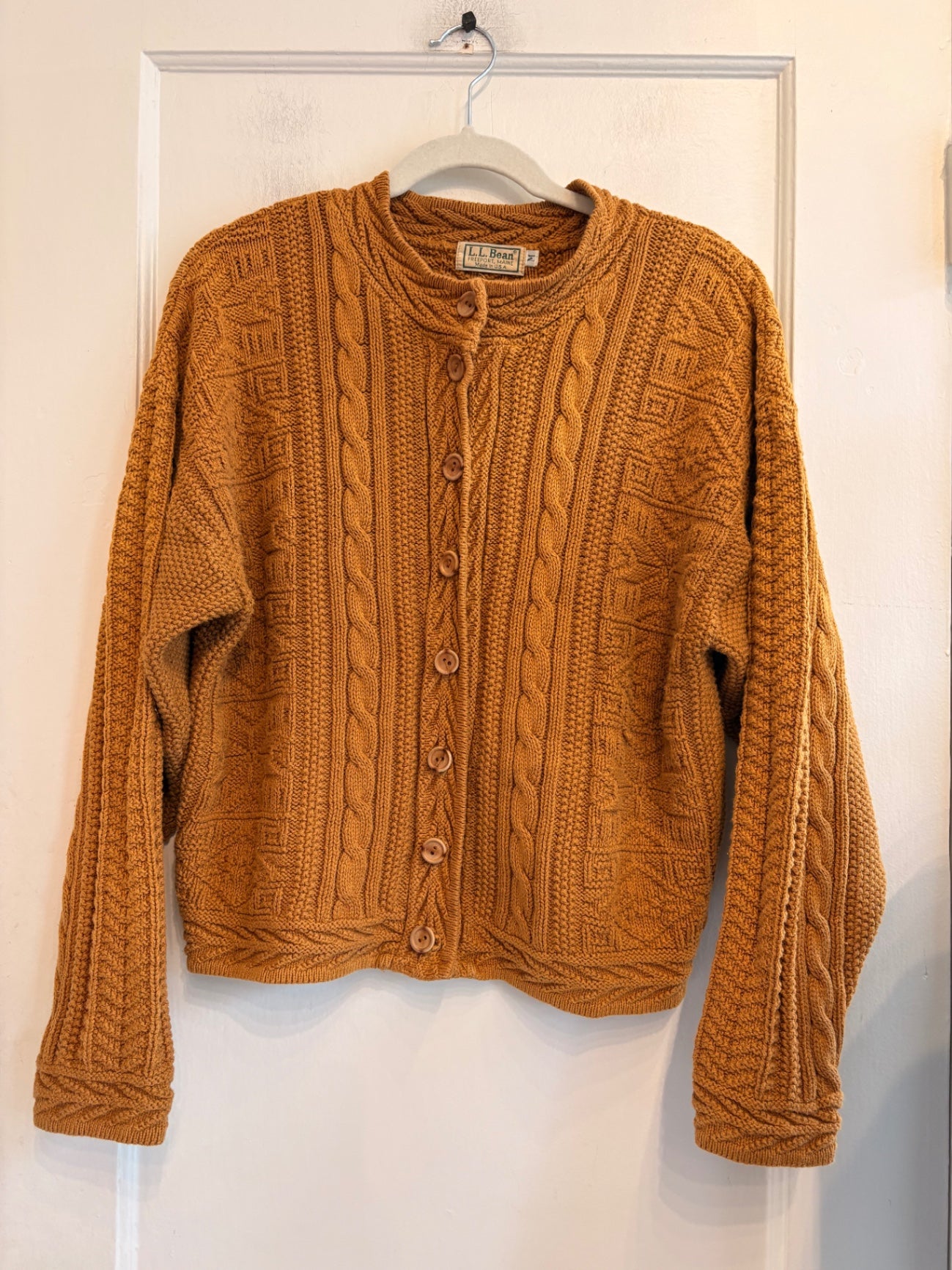 This cozy orange knit sweater from L.L.Bean features a rich cable-knit design that adds texture and warmth. Ideal for chilly days, it combines classic style with comfort. The detailed stitch work makes it a standout piece for casual or semi-formal wear.