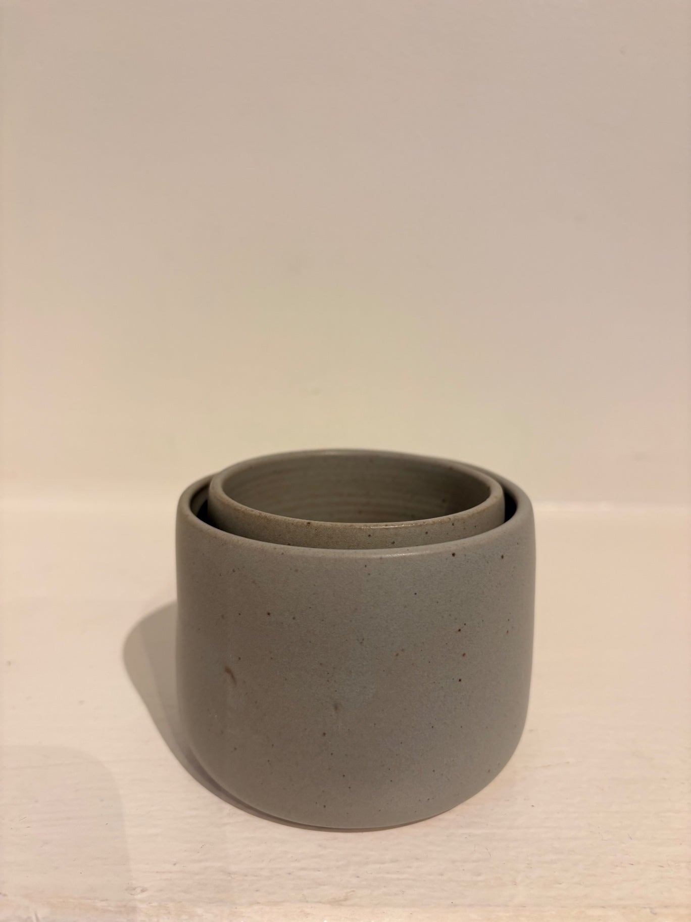 A minimalist gray ceramic container with a smooth matte finish. Its simple design makes it versatile for holding small items or serving as a decorative piece in modern interior settings.