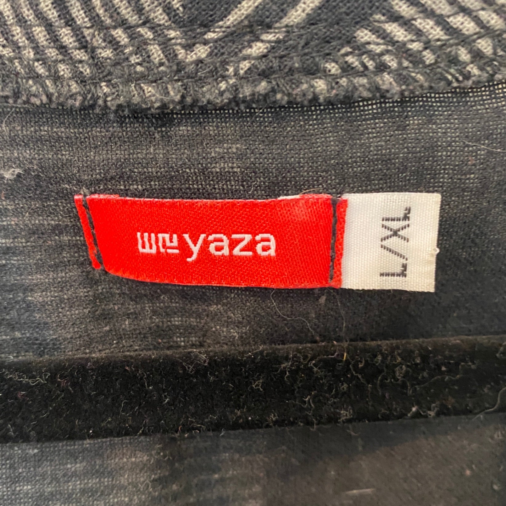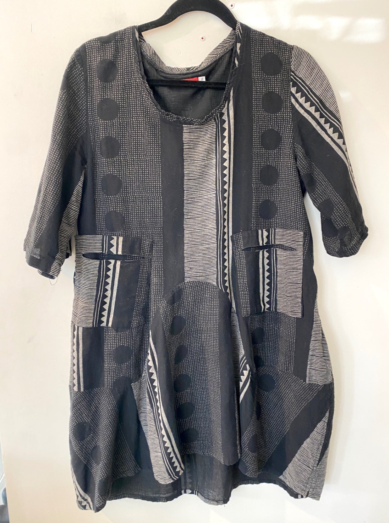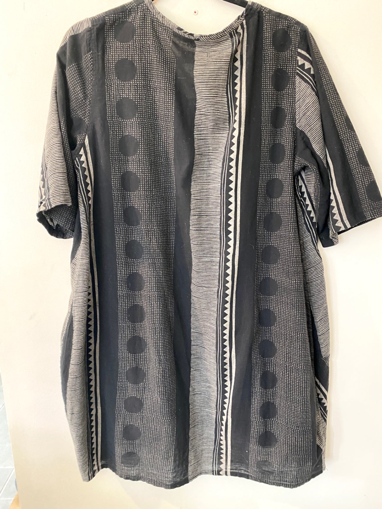 Lightweight yaza tunic style top featuring a mix of black and white patterns and stripes, dots, and geometric details.
