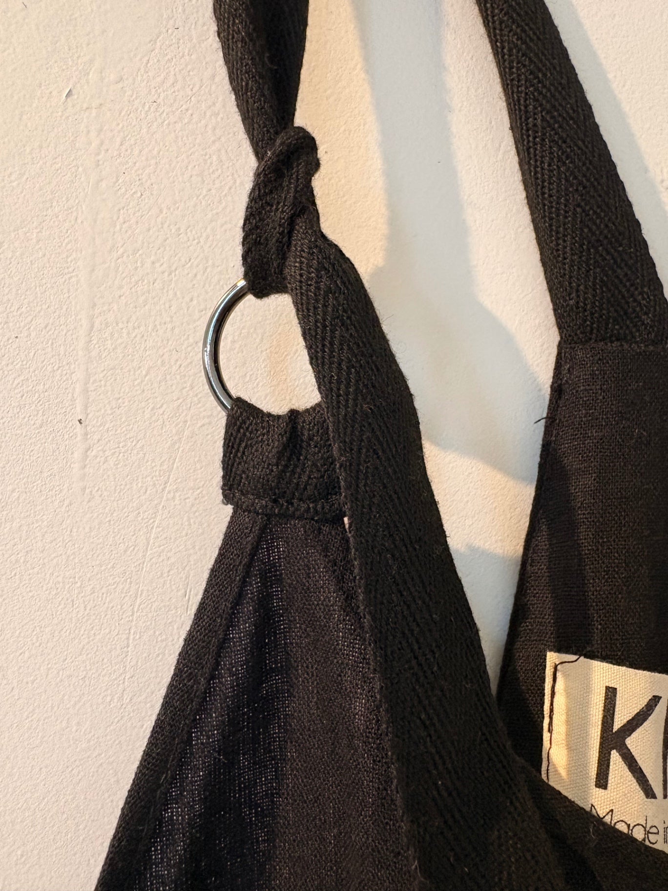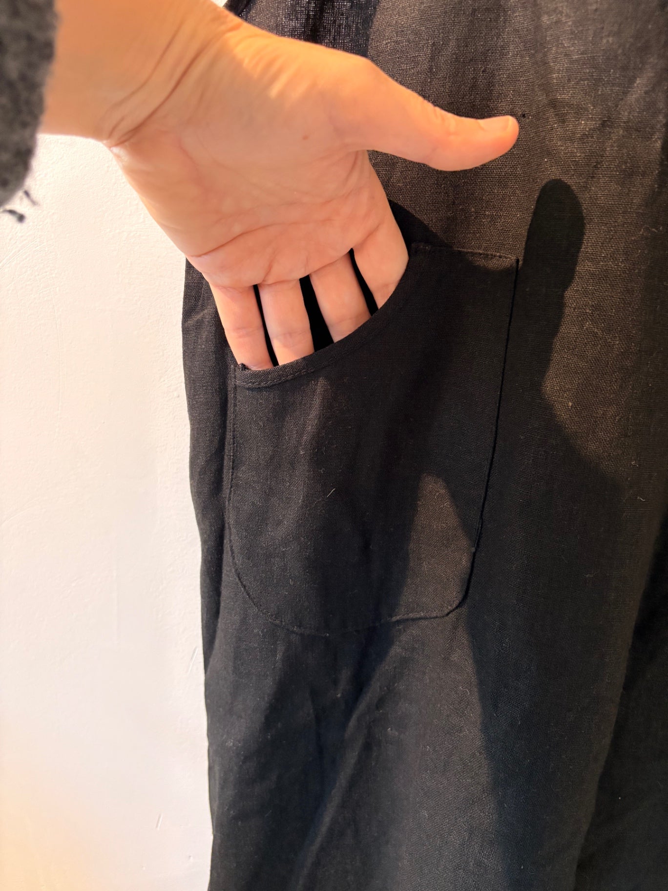 Minimalist black linen apron-style dress with adjustable rung stripes and large front pockets.