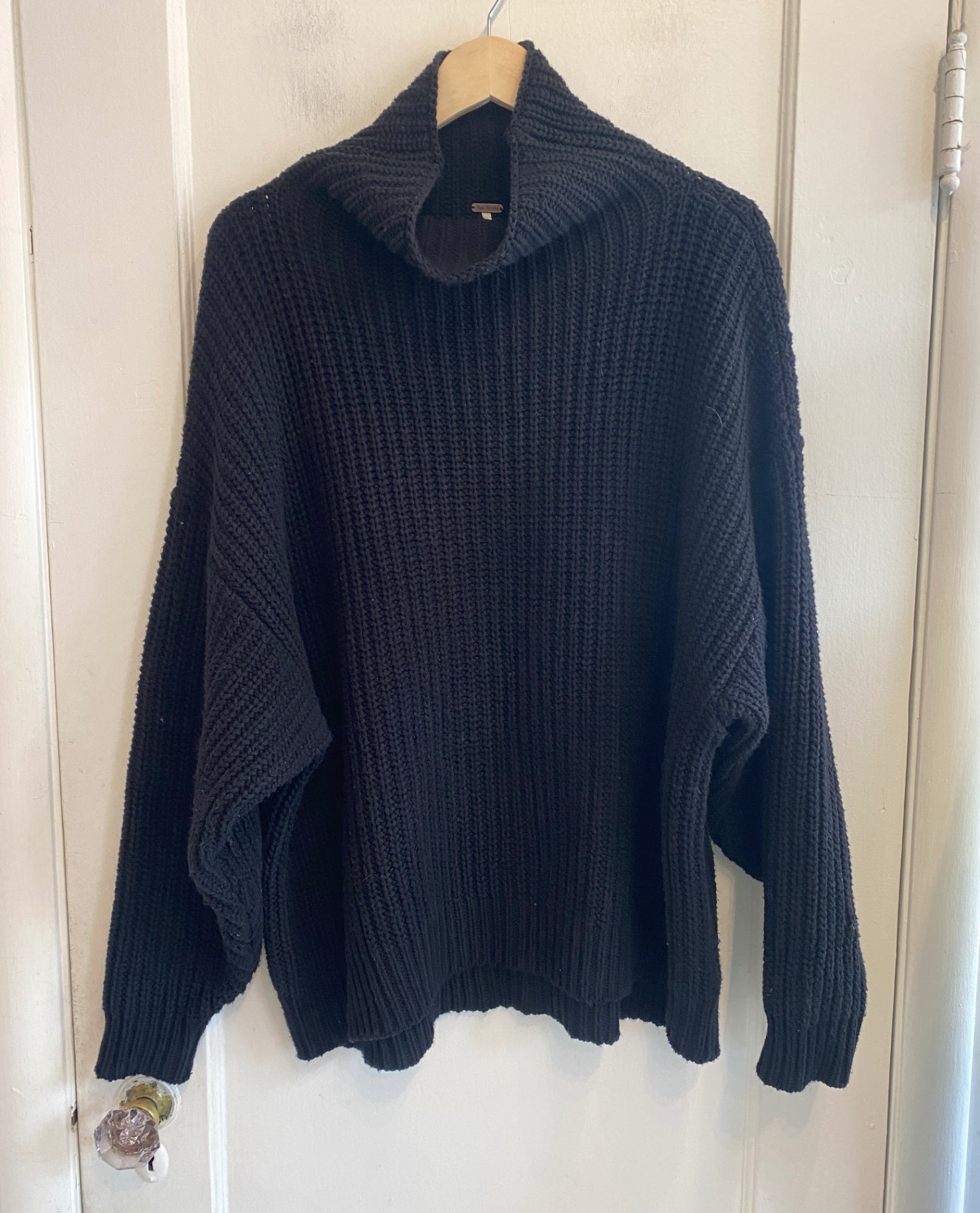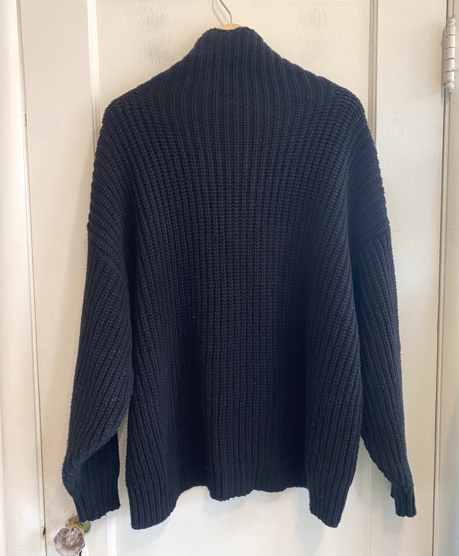 This chunky knit sweater in black offers a cozy fit with a high collar and relaxed silhouette. Perfect for layering during colder months, it combines comfort and timeless style effortlessly. The textured knit adds depth to the design, making it a versatile piece for casual outings.