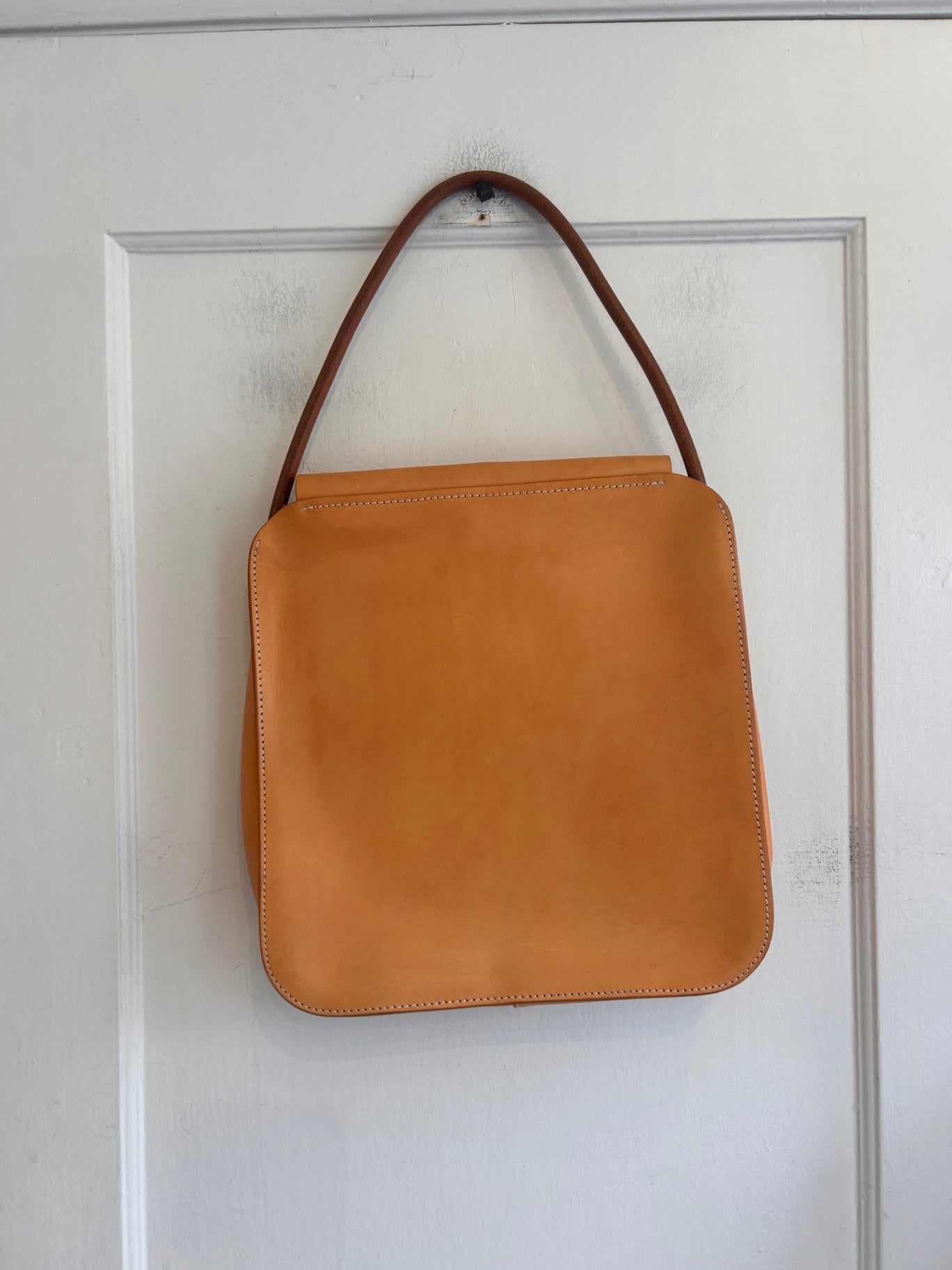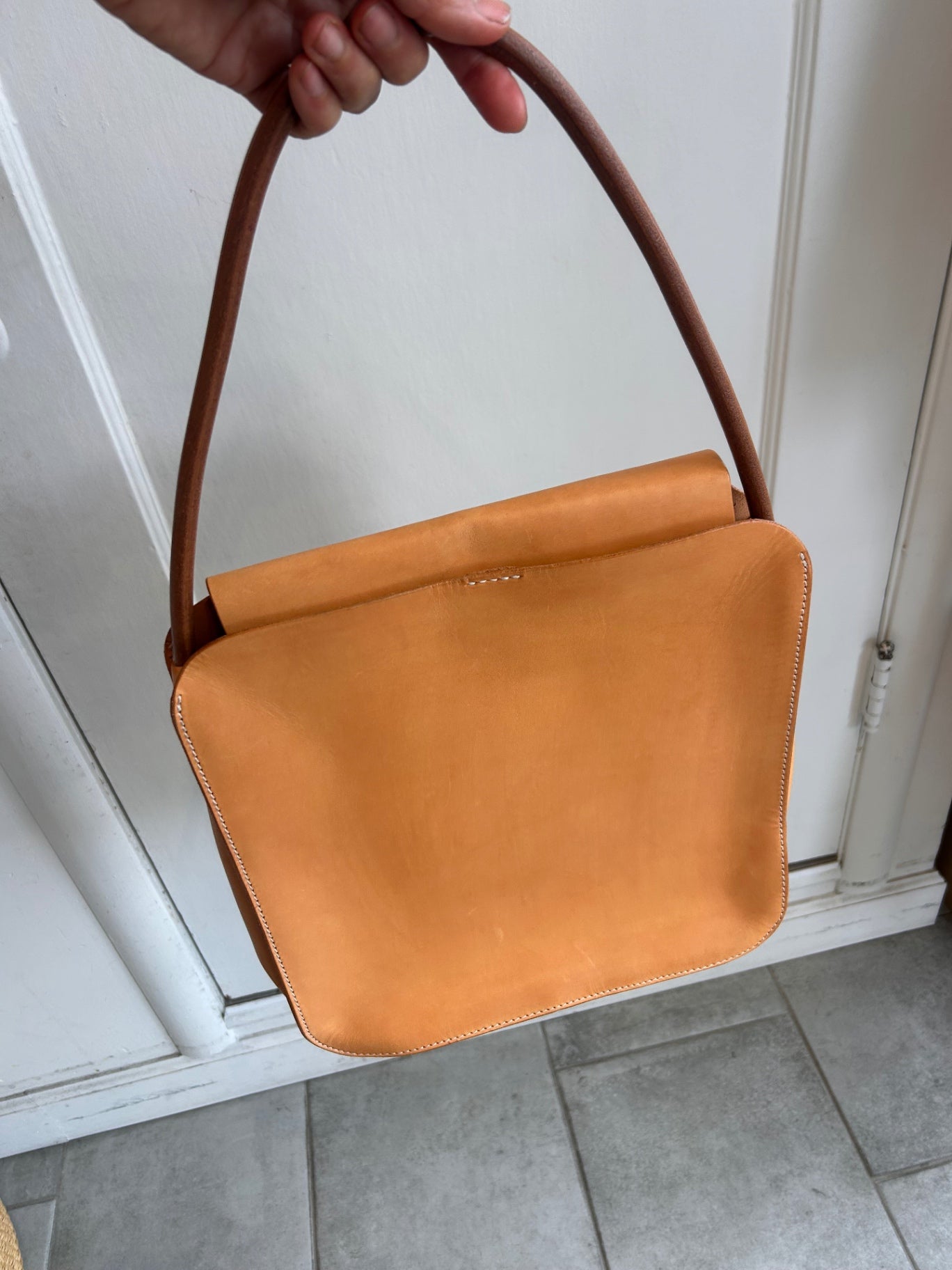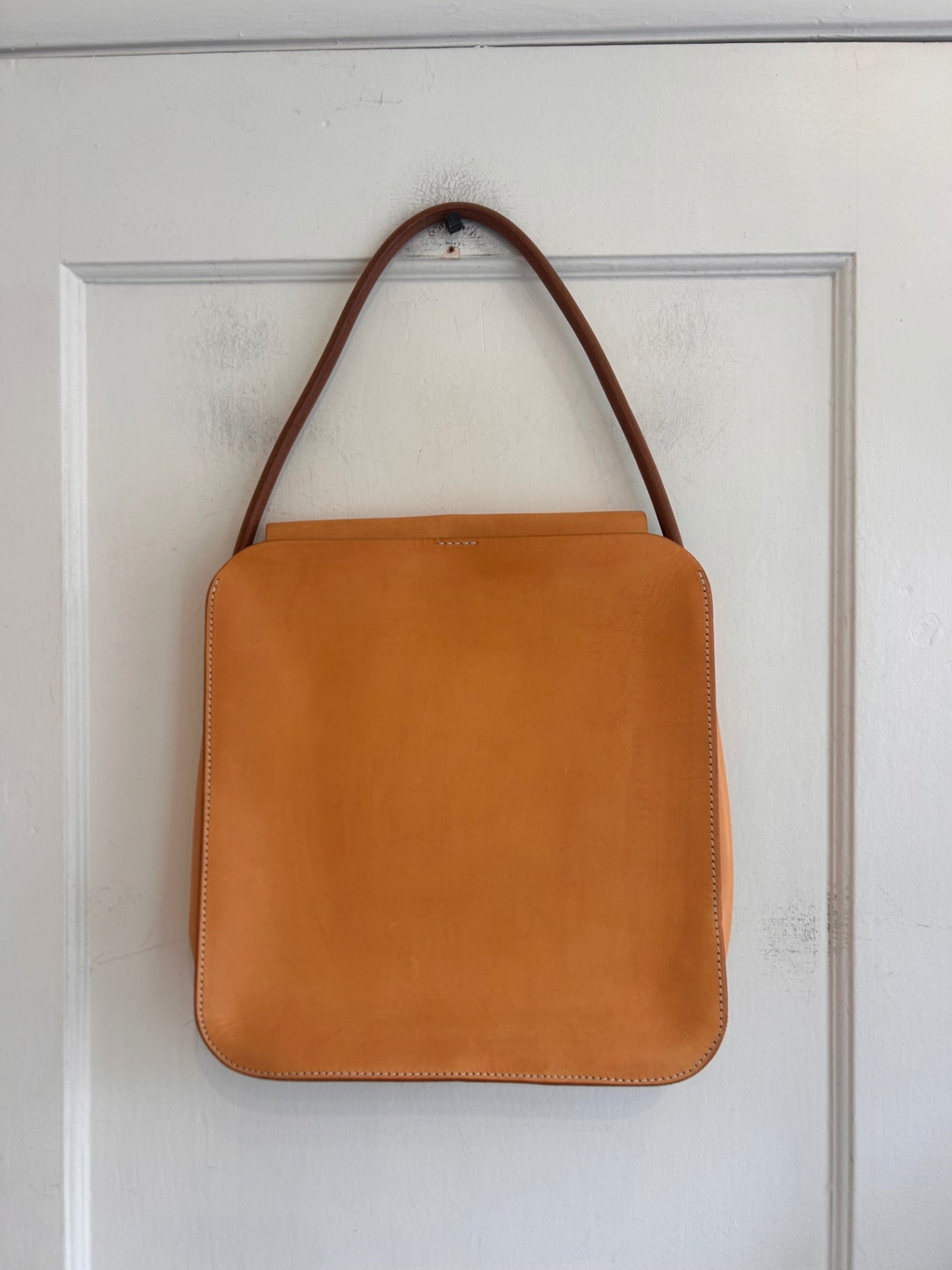 Tan leather tote bag crafted from smooth, structured leather with a minimalist silhouette.
