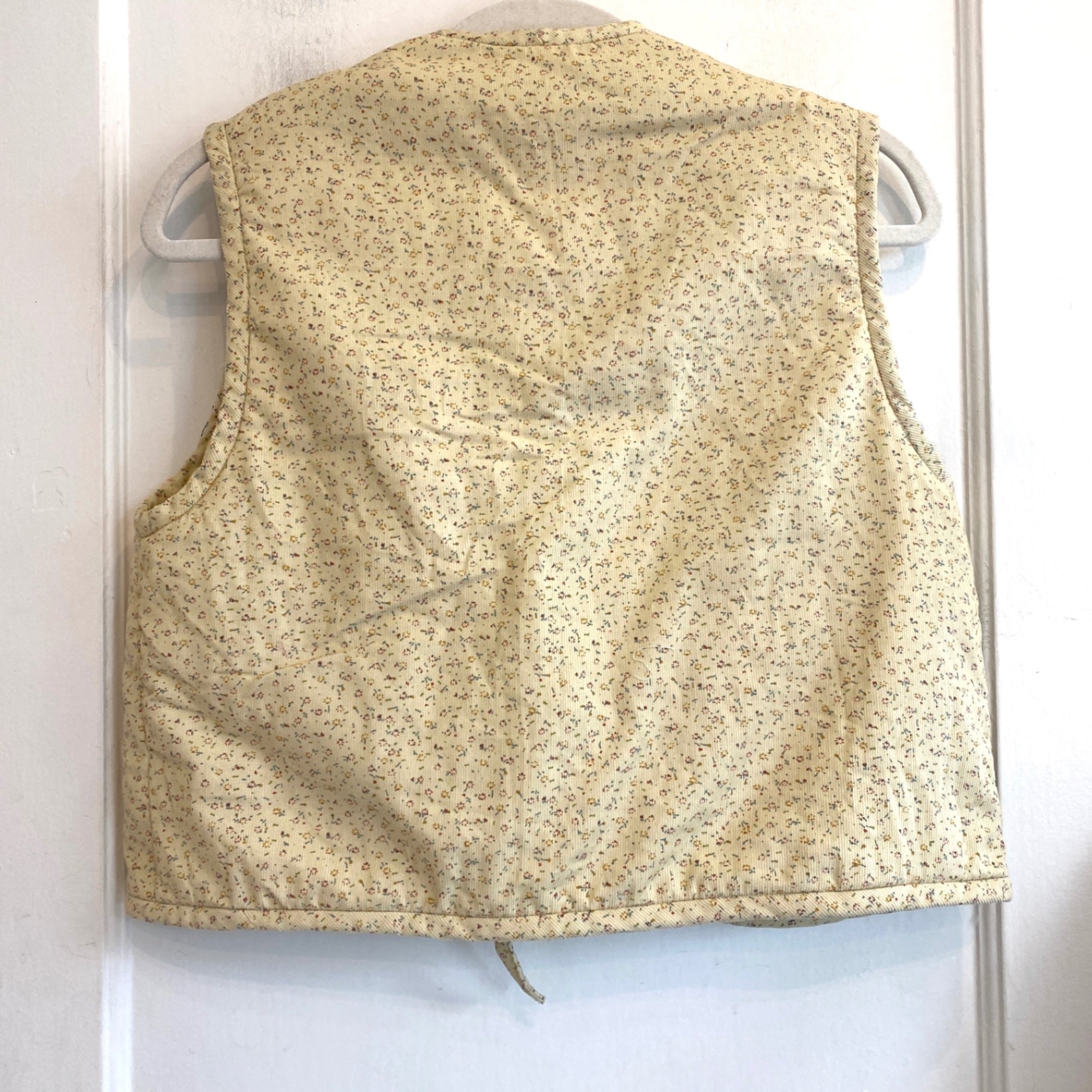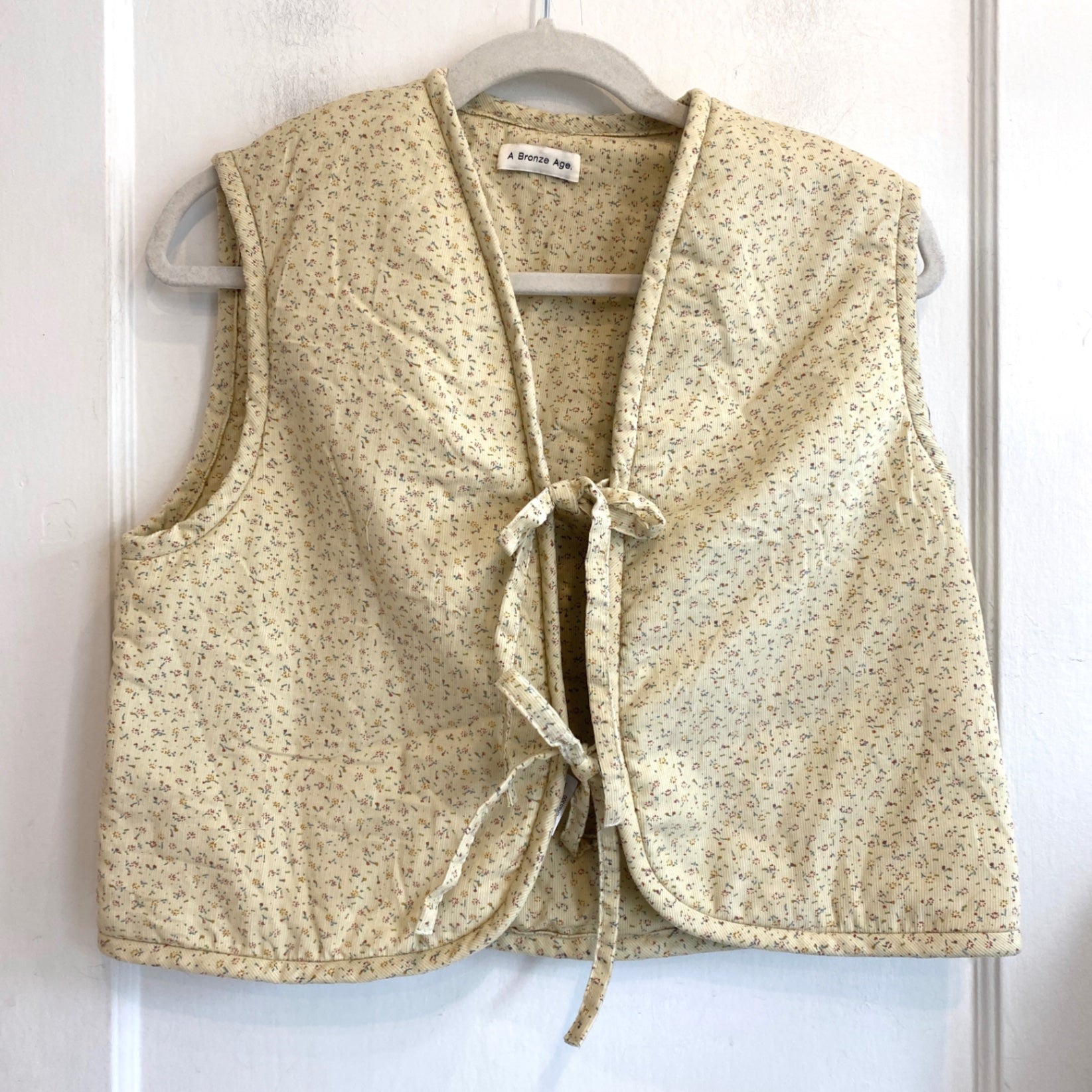 This quilted vest from A Bronze Age offers a cozy layer with a vintage-inspired look. Its light beige color and delicate floral pattern make it a versatile piece for casual and layered outfits. The vest features a front tie closure, adding a touch of charm and ease of wear. Perfect for chilly days when you want to stay comfortable without sacrificing style. Its sleeveless design makes it an excellent choice for transitional weather.