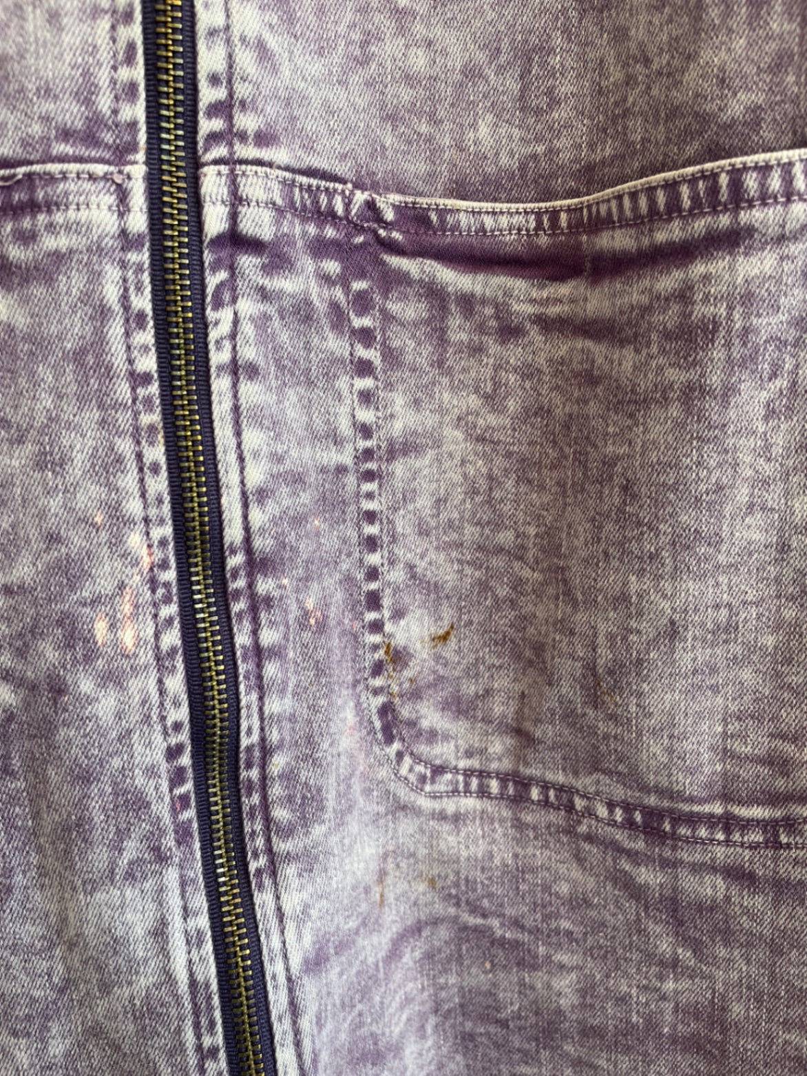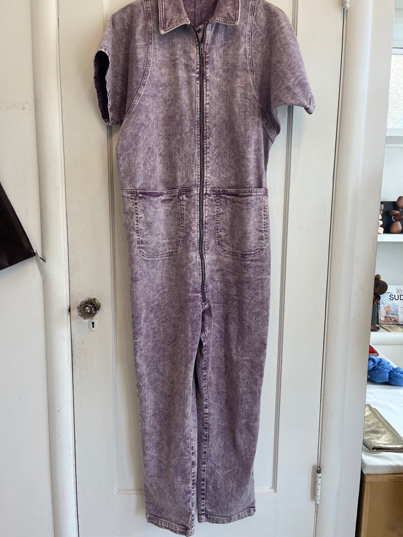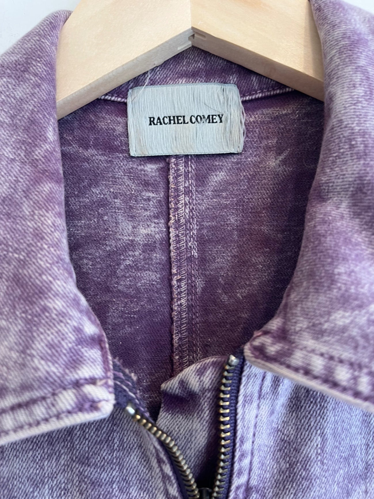 Rachel Comey soft washed-purple denim utility jumpsuit. Short sleeves, full zip front, large patch pockets.