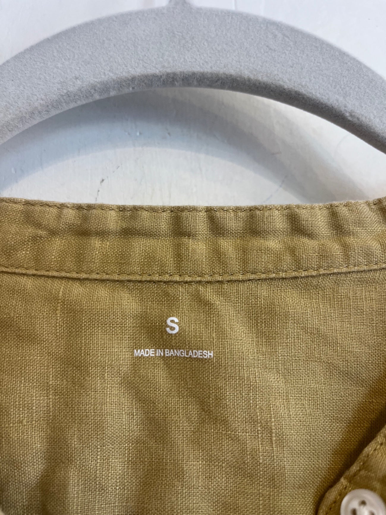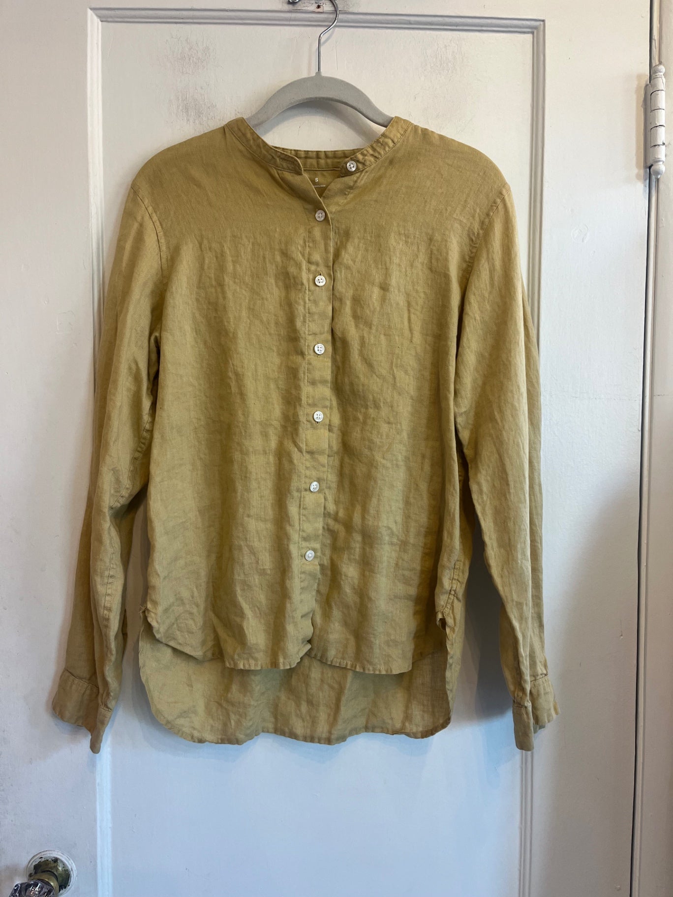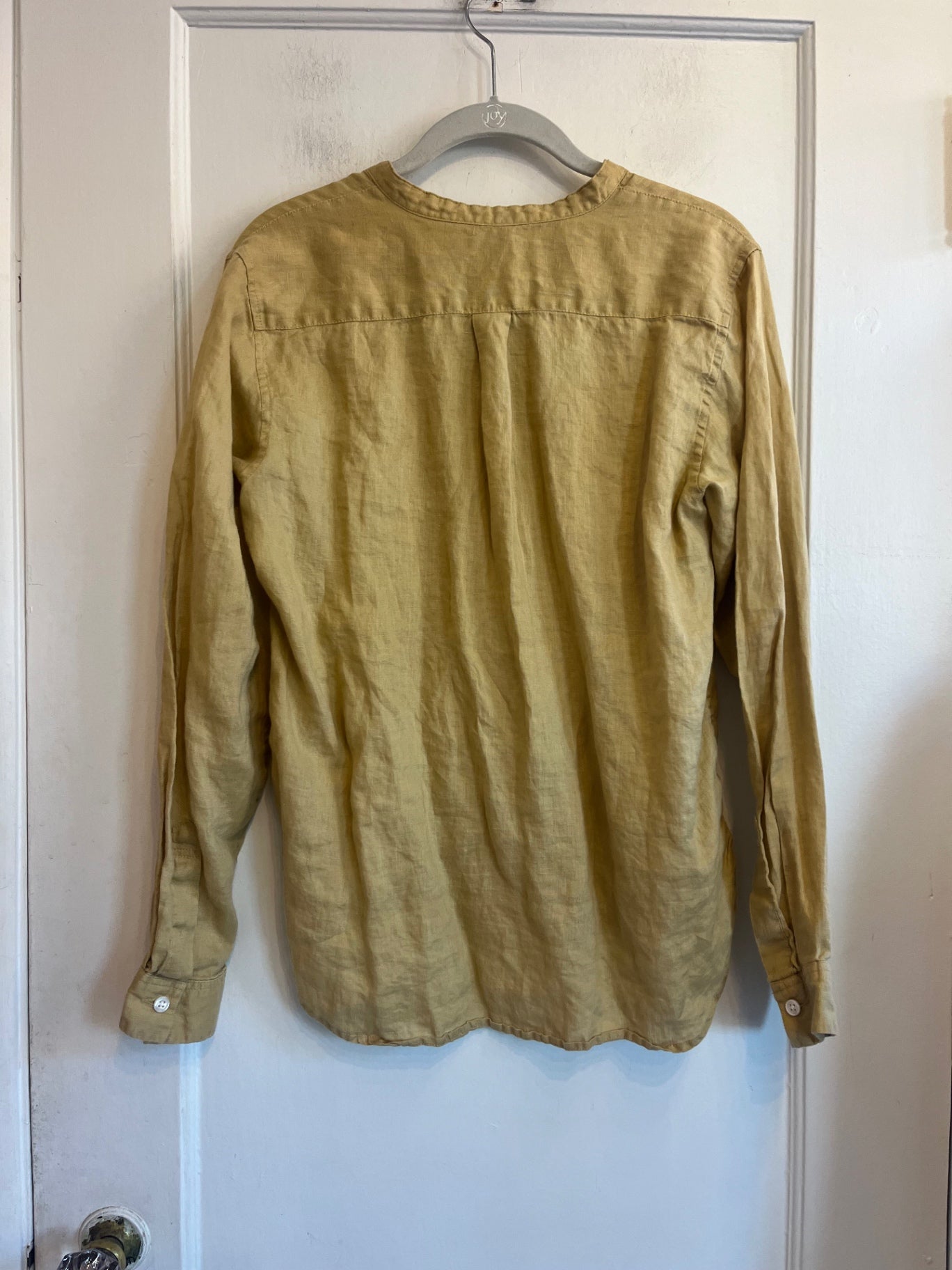 Lightweight linen button-up in a warm mustard tone. Features a relaxed fit, long sleeves, and breathable feel.