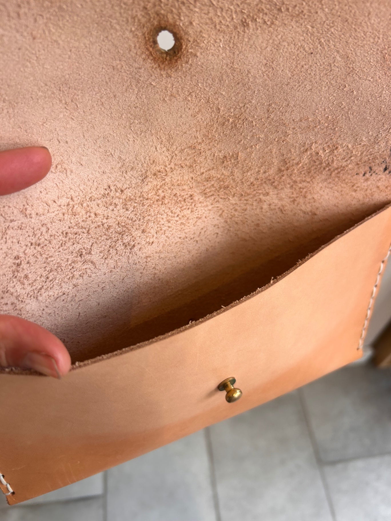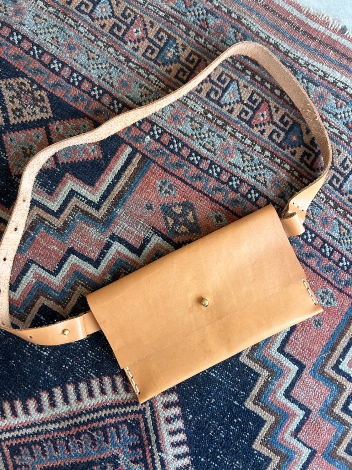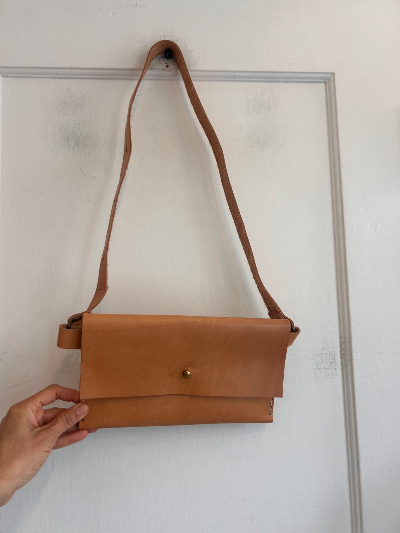 Classic tan leather envelope style crossbody purse, made from smooth, structured leather with a clean flap front.