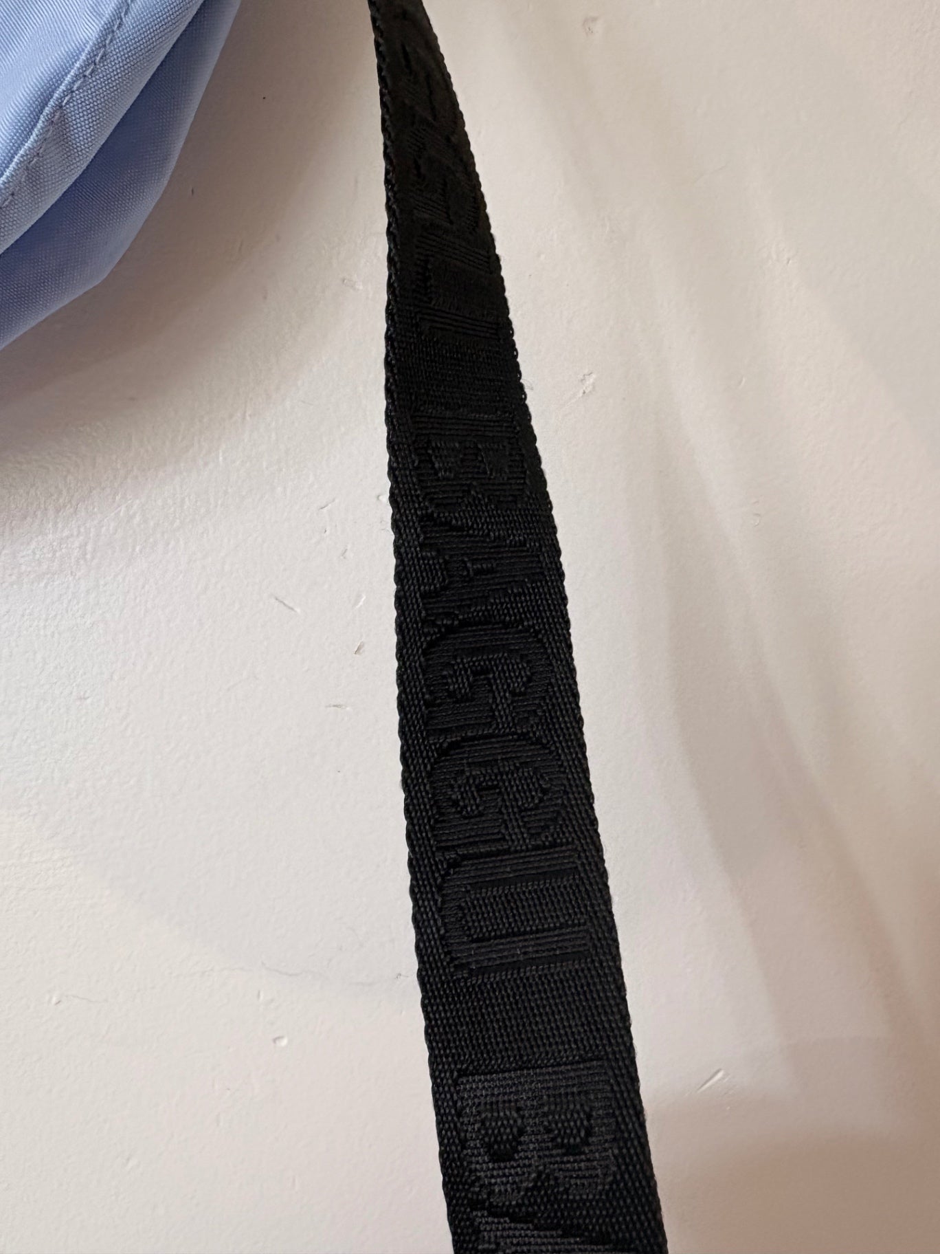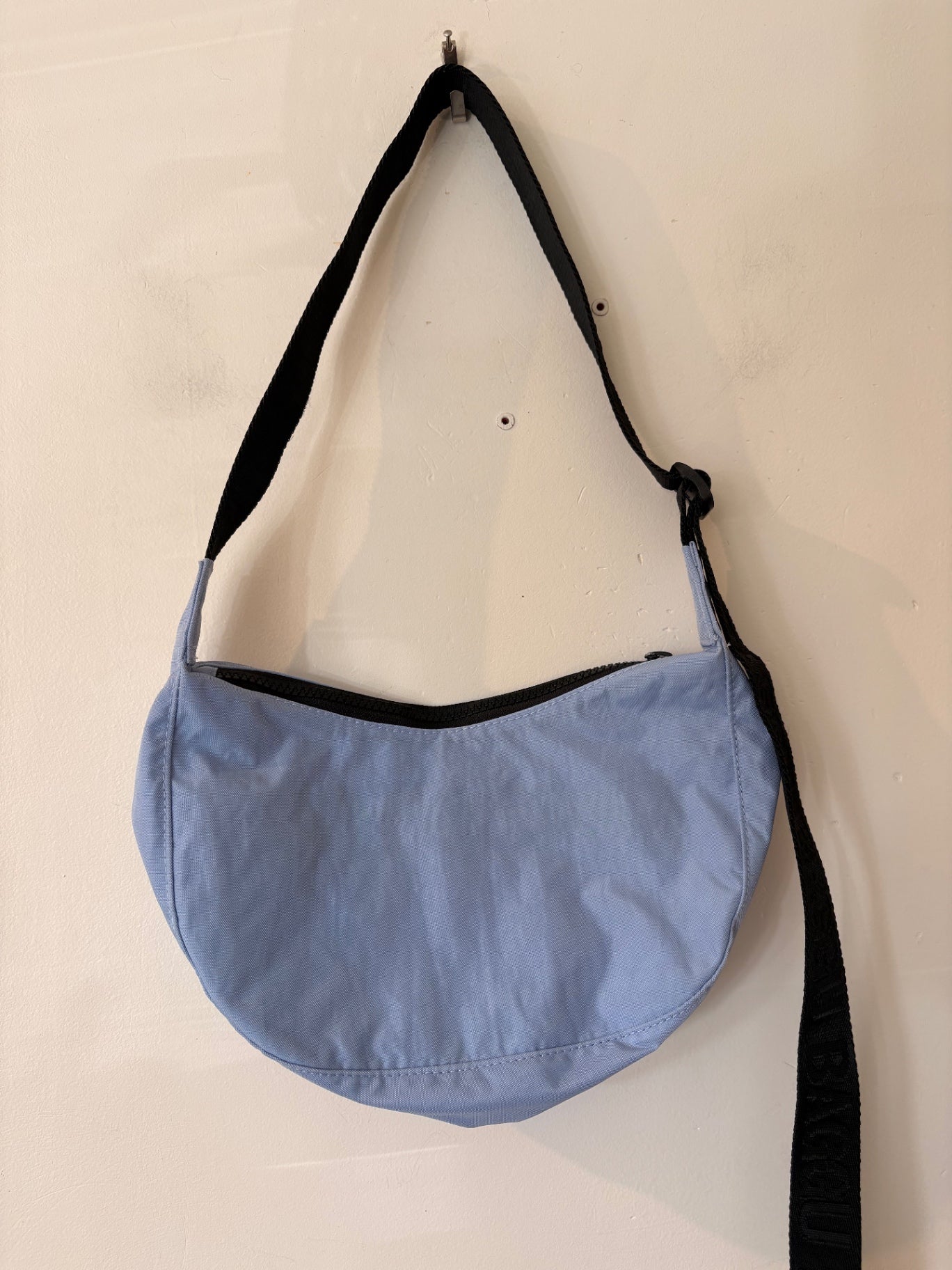 A casual, crescent-shaped bag crafted from lightweight nylon, perfect for everyday outings. Its minimalist design is complemented by a practical black zipper at the top, ensuring your essentials are secure. The adjustable black strap adds comfort and versatility for carrying. Ideal for adding a touch of sporty style to your casual wardrobe.