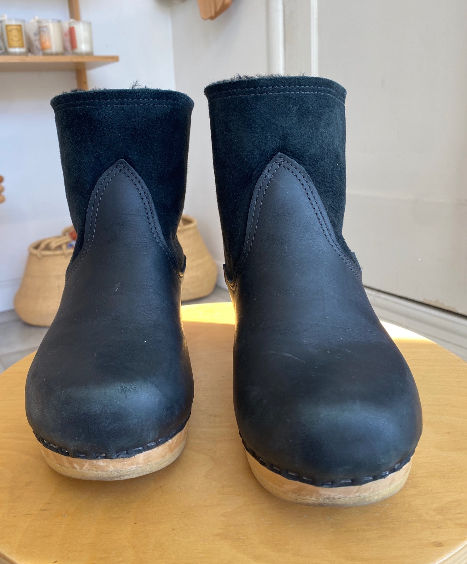 These stylish black ankle boots blend leather and suede textures, offering a sophisticated touch to any wardrobe. Designed with a unique wooden heel, they provide comfort and elevating style. Ideal for both casual outings and more polished looks, these boots are a versatile addition to your footwear collection. Their classic color makes them easy to pair with various outfits.