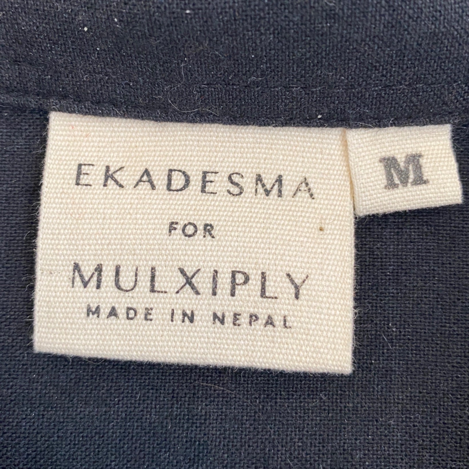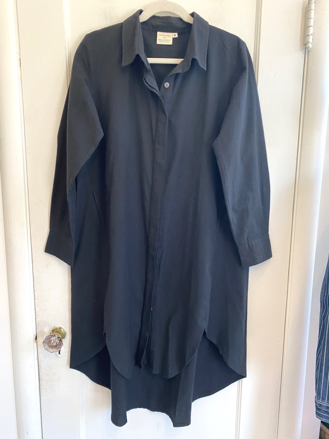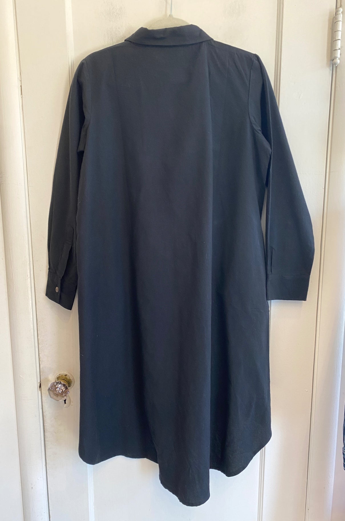 Lightweight black shirt dress with button front, collar, and flowy asymmetrical hem.