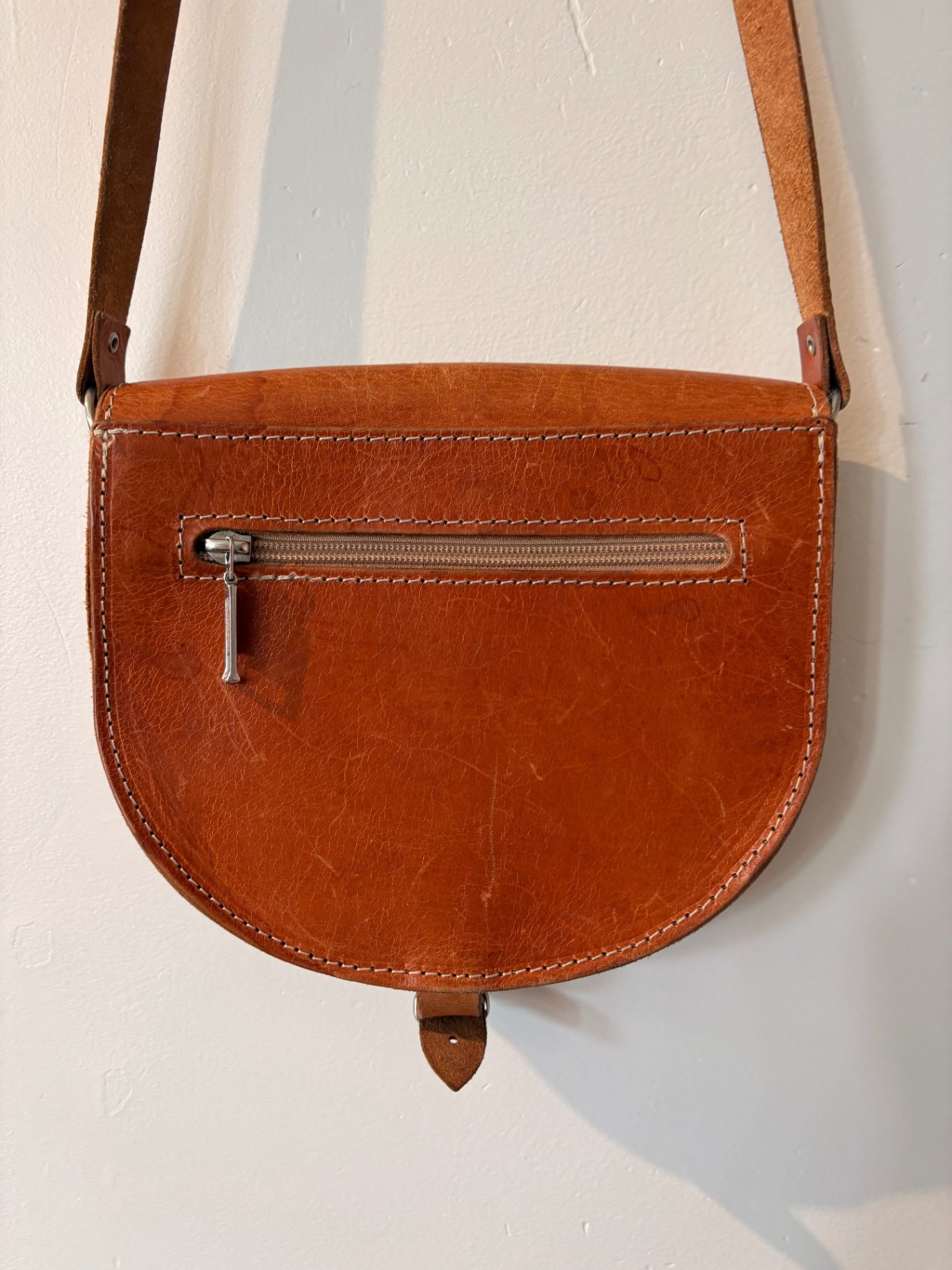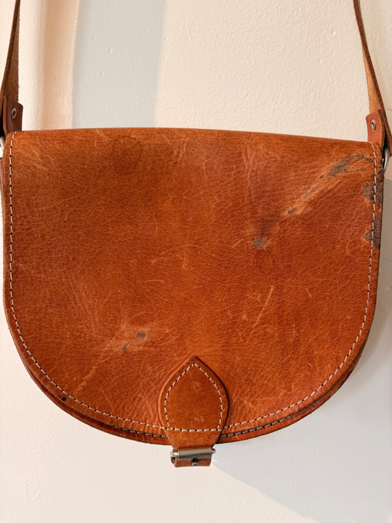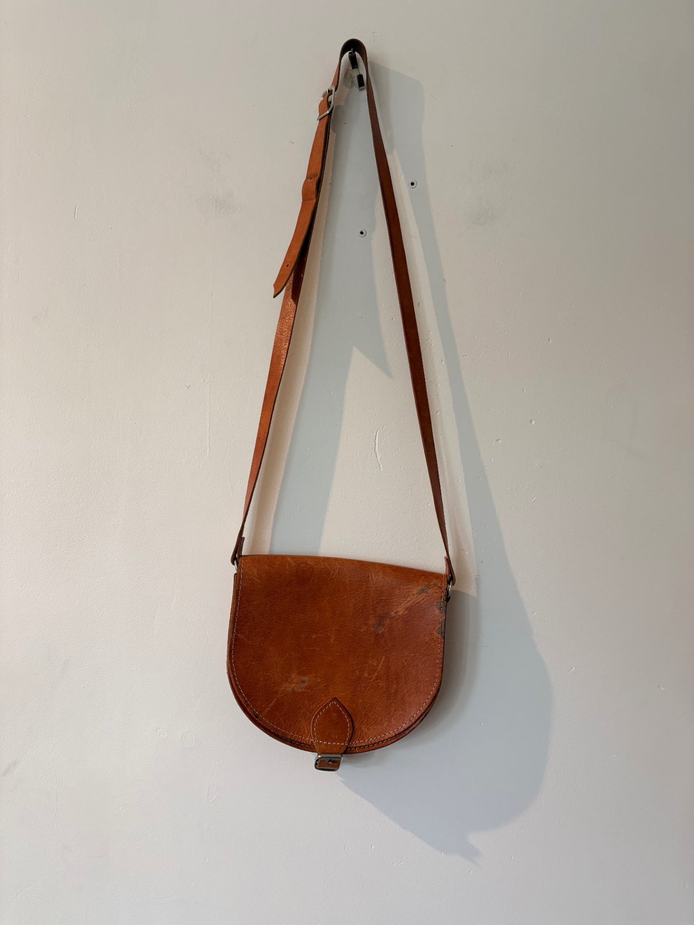 A vintage brown leather shoulder bag featuring a classic semi-circular shape. Its well-worn surface adds character and tells a story of timeless style. Perfect for casual outings or adding a rustic touch to your look. The understated design makes it versatile and easy to pair with various outfits. Crafted from genuine leather, it offers durability and sophisticated charm.