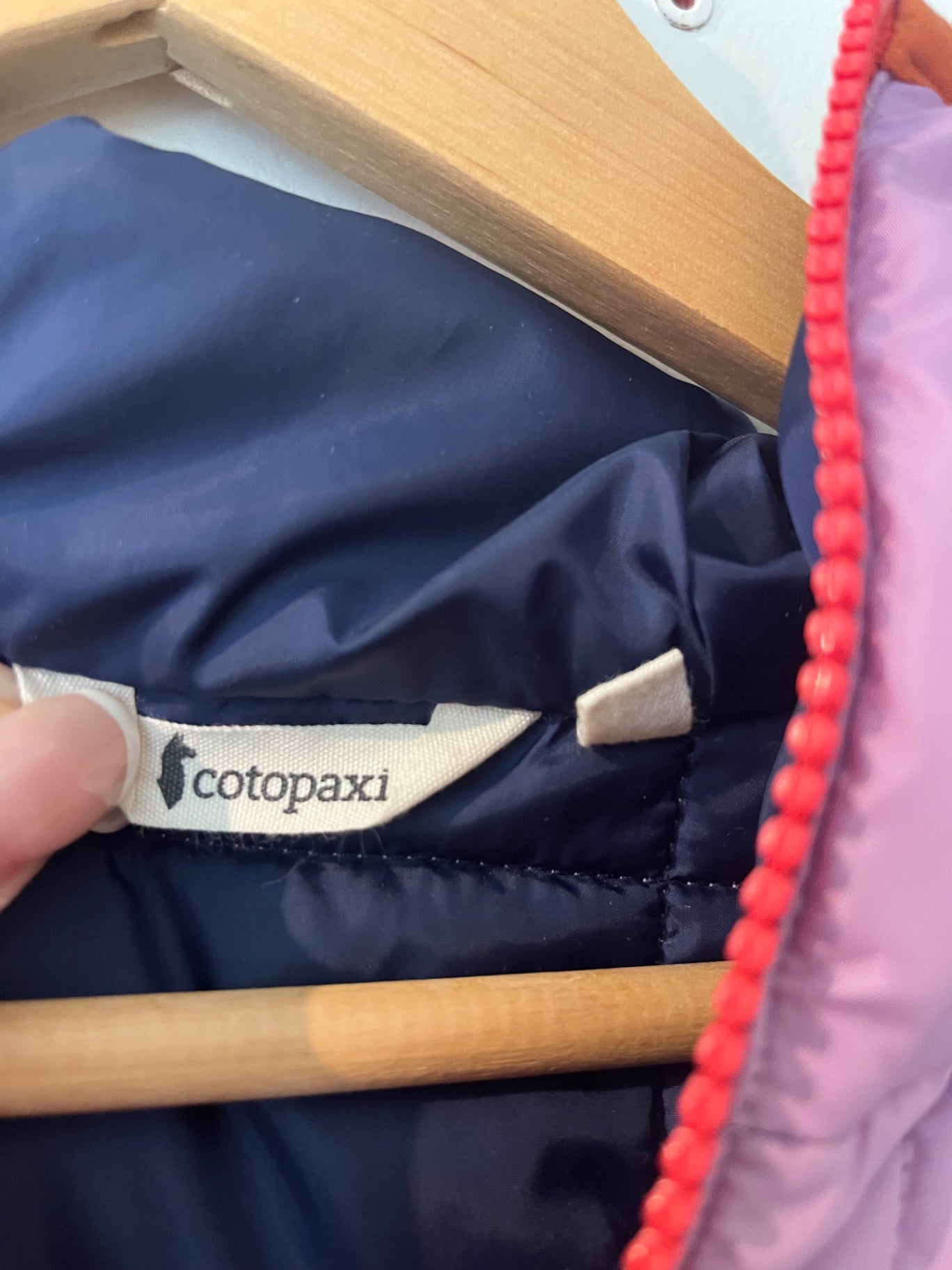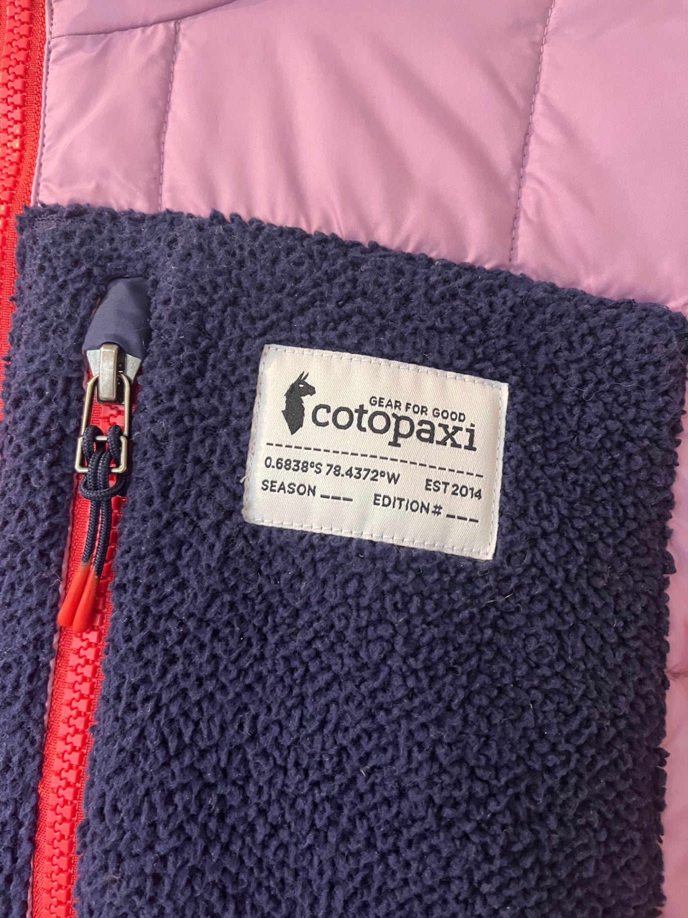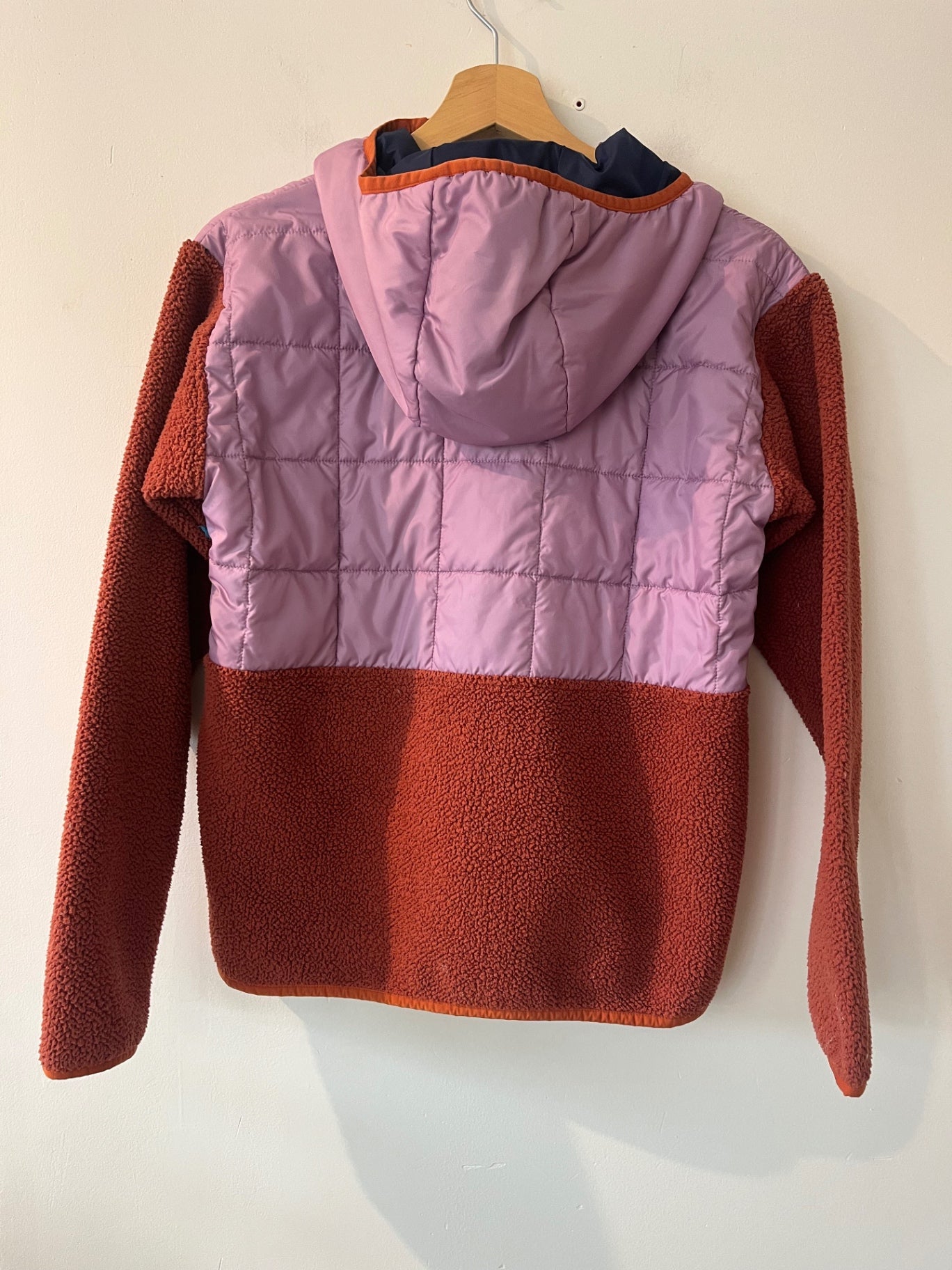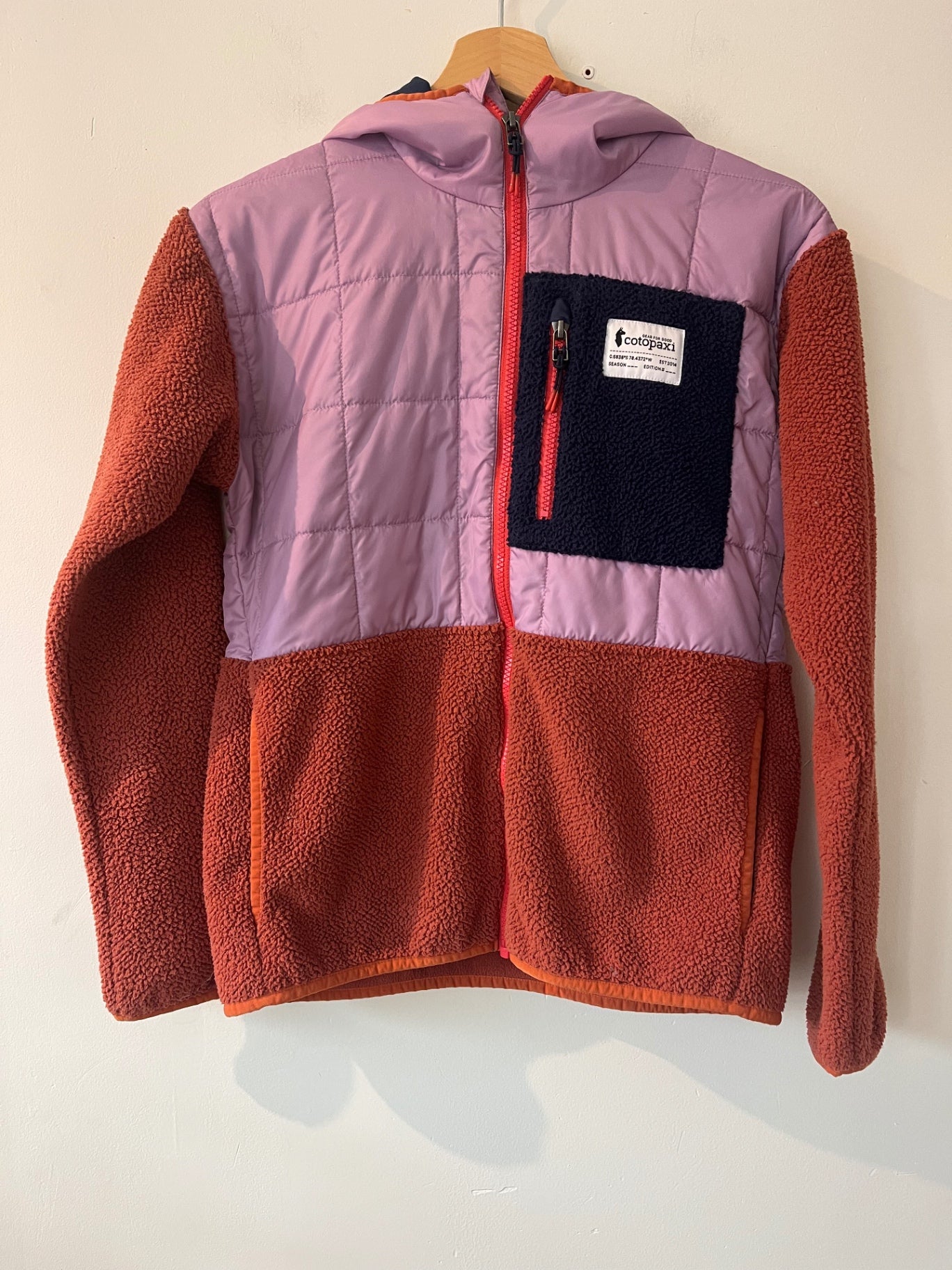 Hybrid fleece by Cotopaxi featuring lavender, rust, and navy tones. Cozy fleece body with insulated quilted panels and a hood. Zip-front with chest pocket detail.