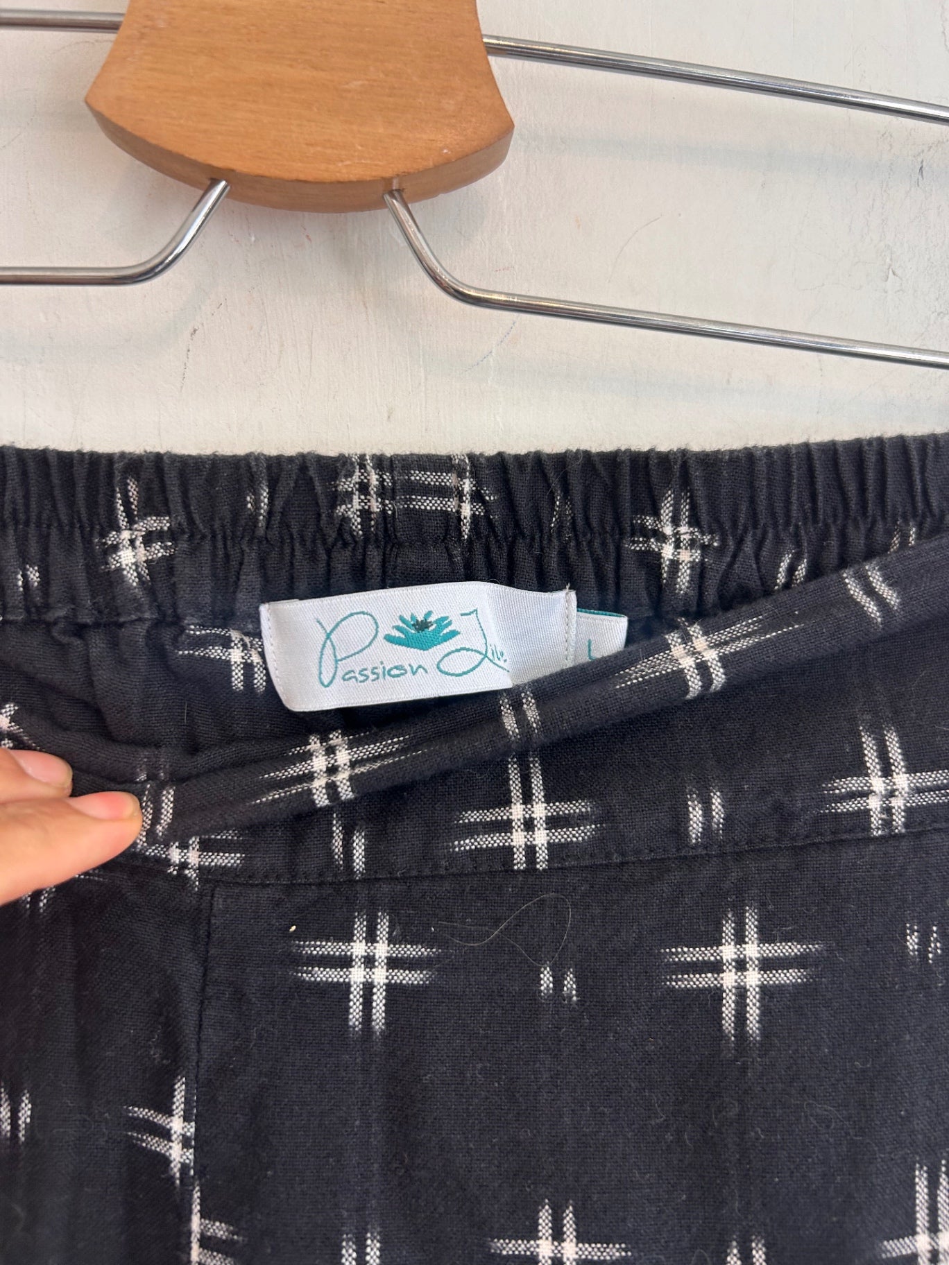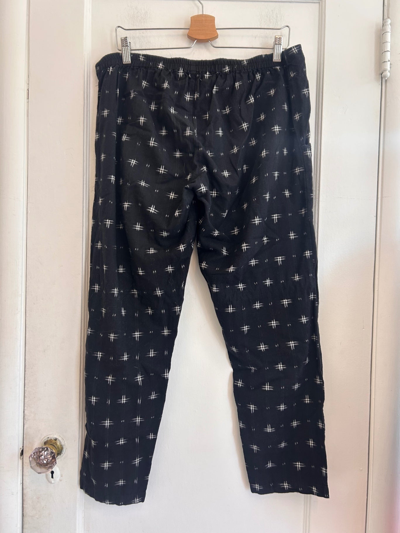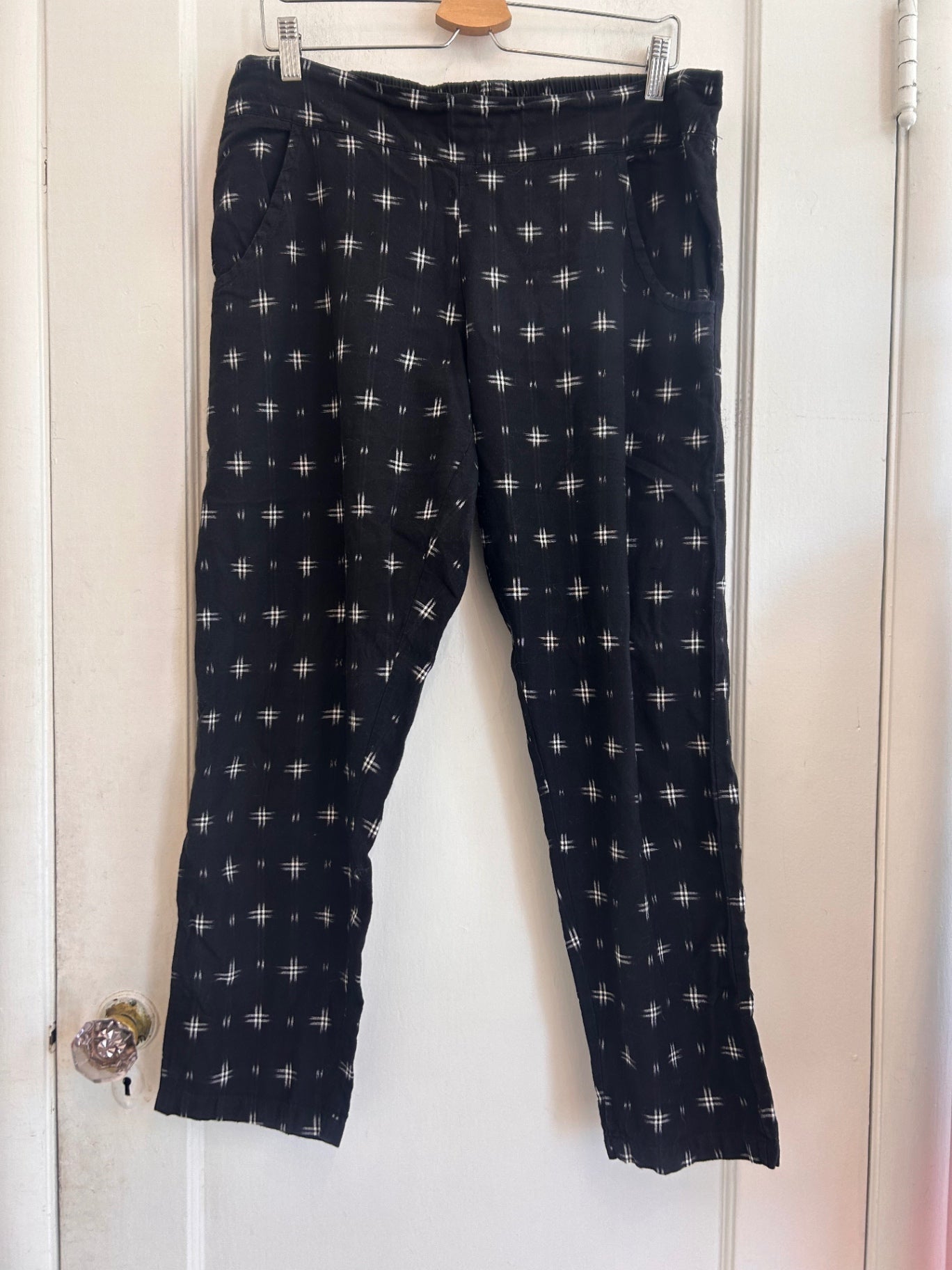 Passion Jilie black and white printed pants with an easy tapered fit, side pockets, and geometric handwoven-inspired pattern.