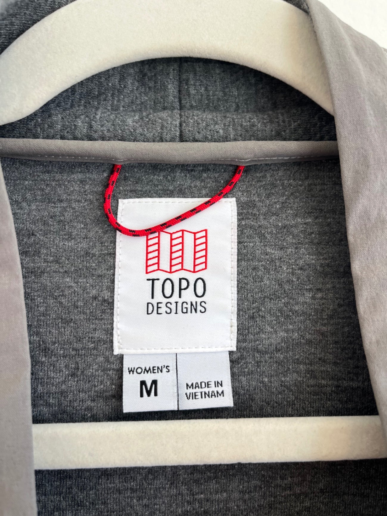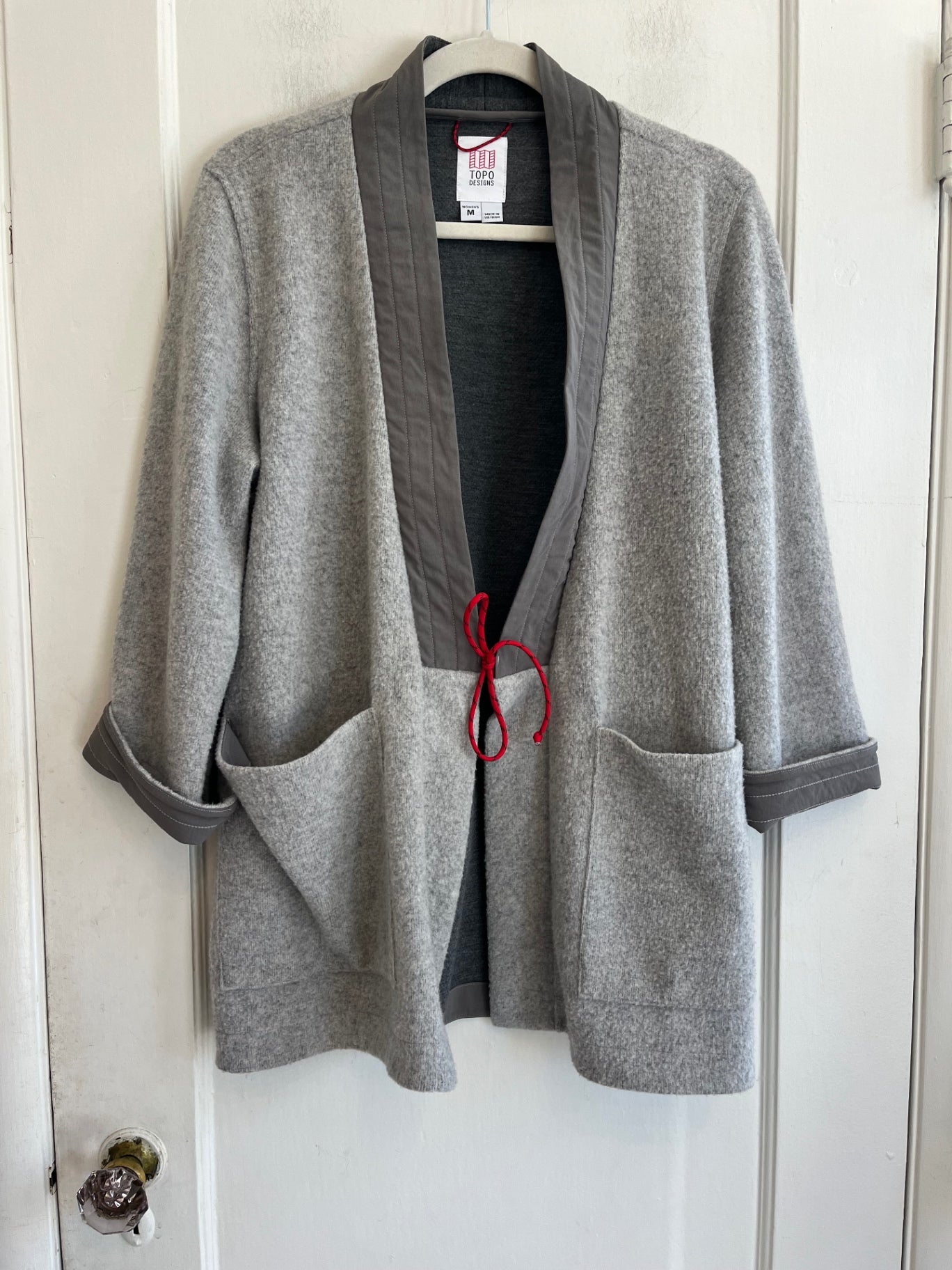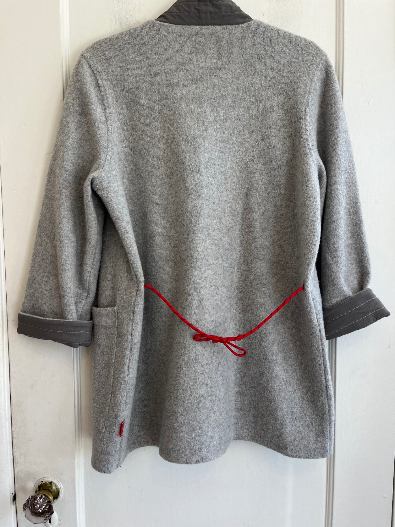Soft grey wool-blend jacket with contrast trim and red tie closure. Features large front pockets and a relaxed fit.