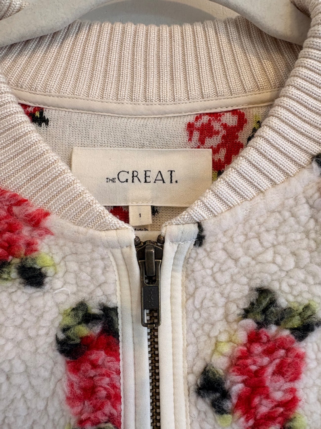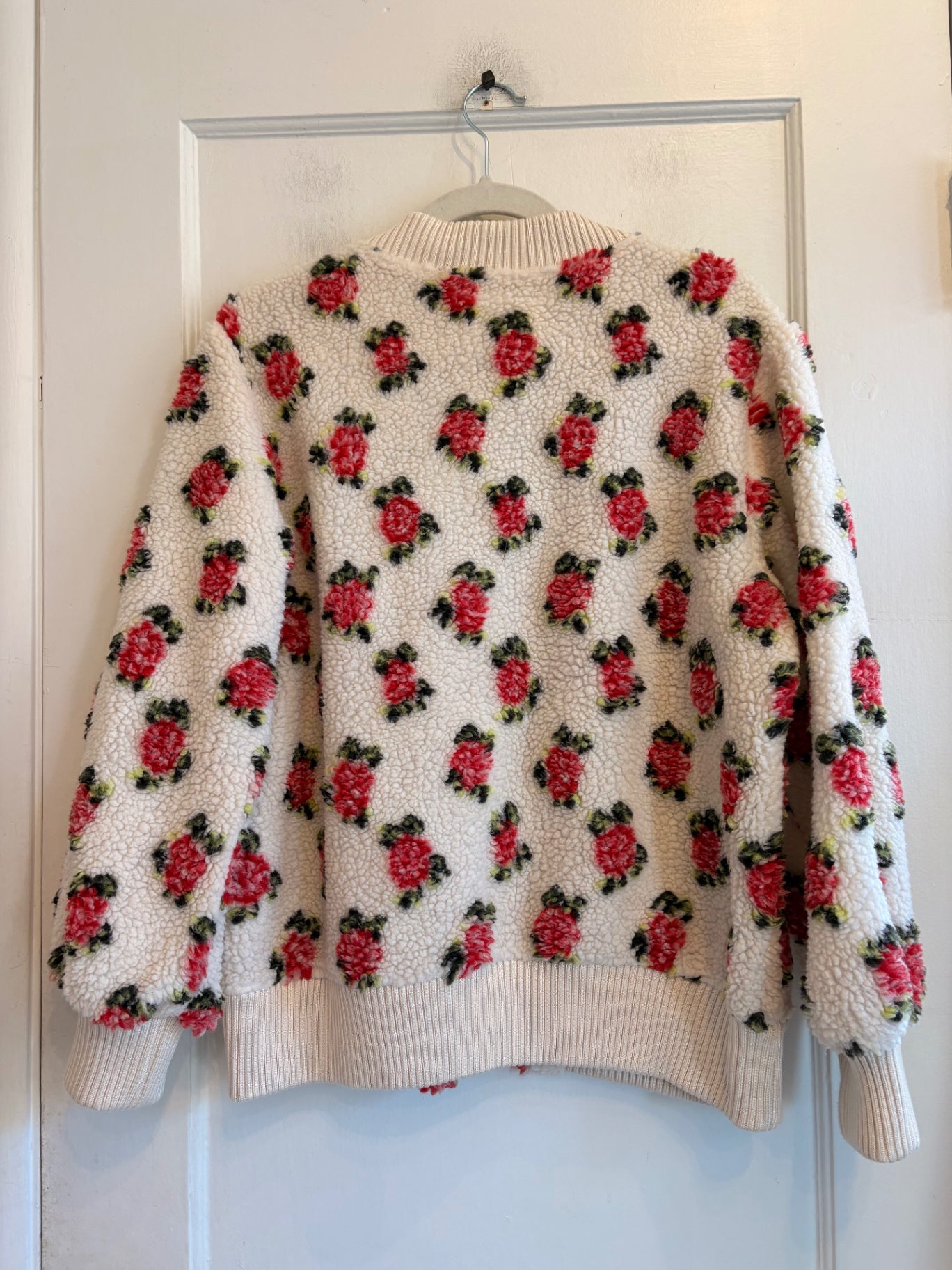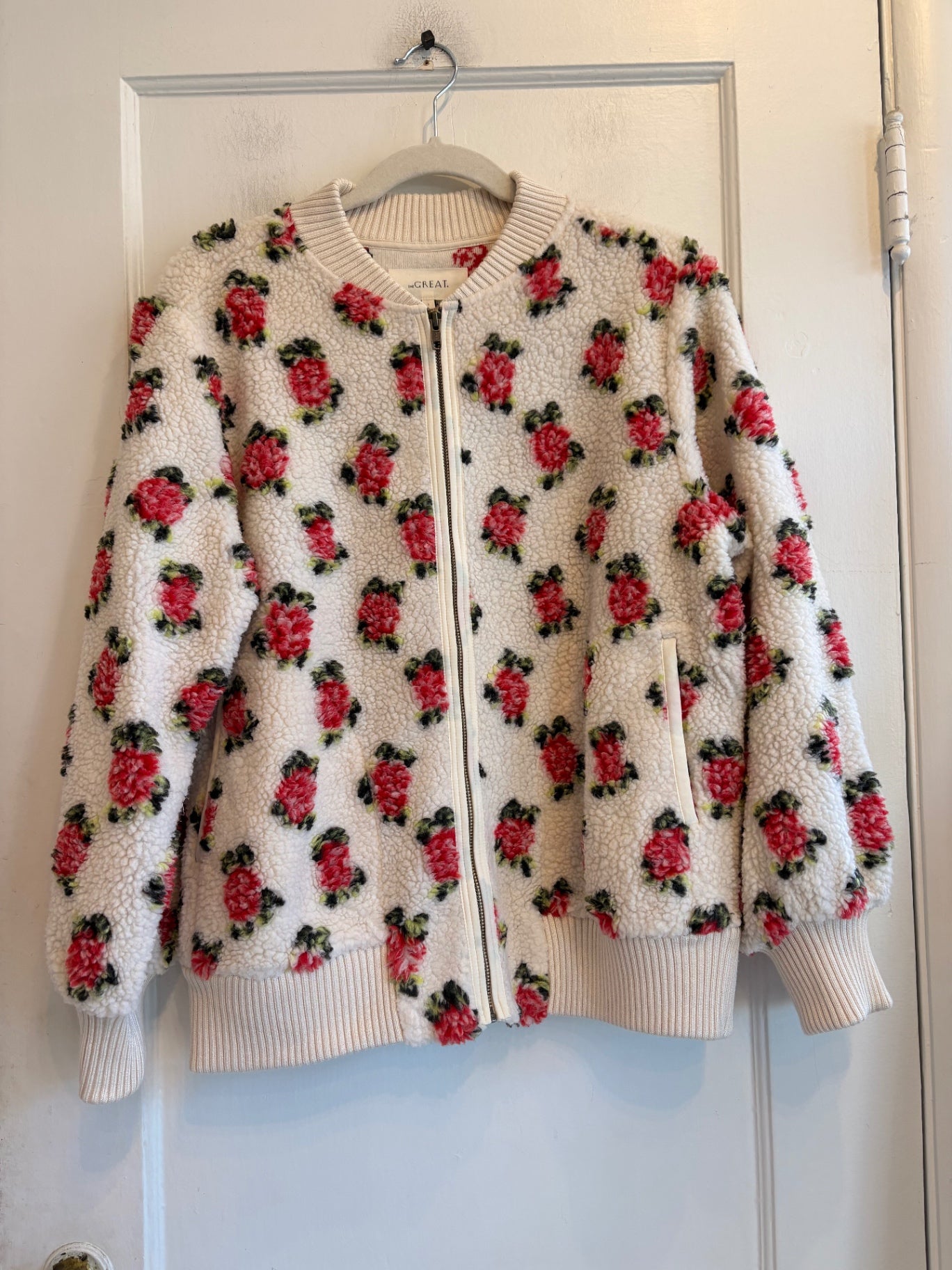 This cozy sherpa fleece jacket features a charming floral print that adds a playful touch to your casual wardrobe. Its soft texture is perfect for cooler days, offering both comfort and style. The ribbed cuffs and collar ensure a snug fit, while the full zipper allows for versatile wear. Ideal for layering, this jacket pairs well with jeans or leggings for a relaxed, trendy look.