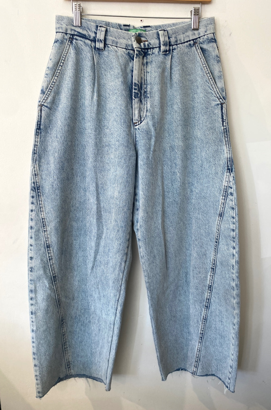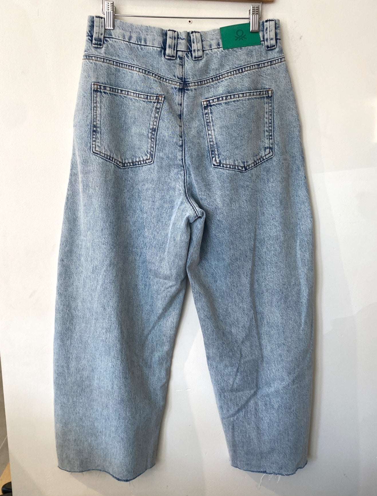 These are classic light blue denim jeans from United Colors of Benetton. Crafted from durable denim, they provide a comfortable and timeless look. Ideal for casual wear, these jeans are versatile and easy to pair with various tops. The design includes a button closure and belt loops for a secure fit.