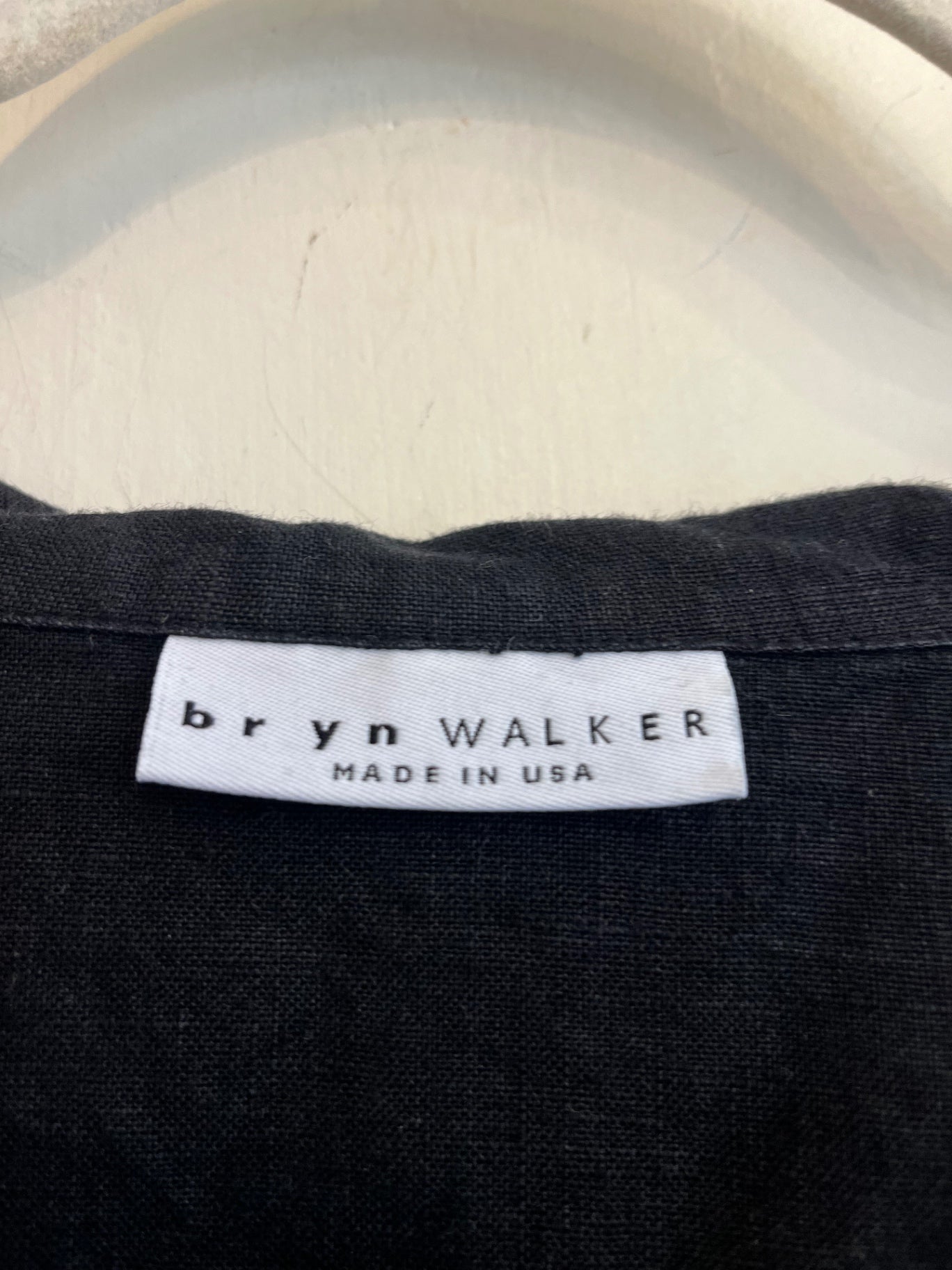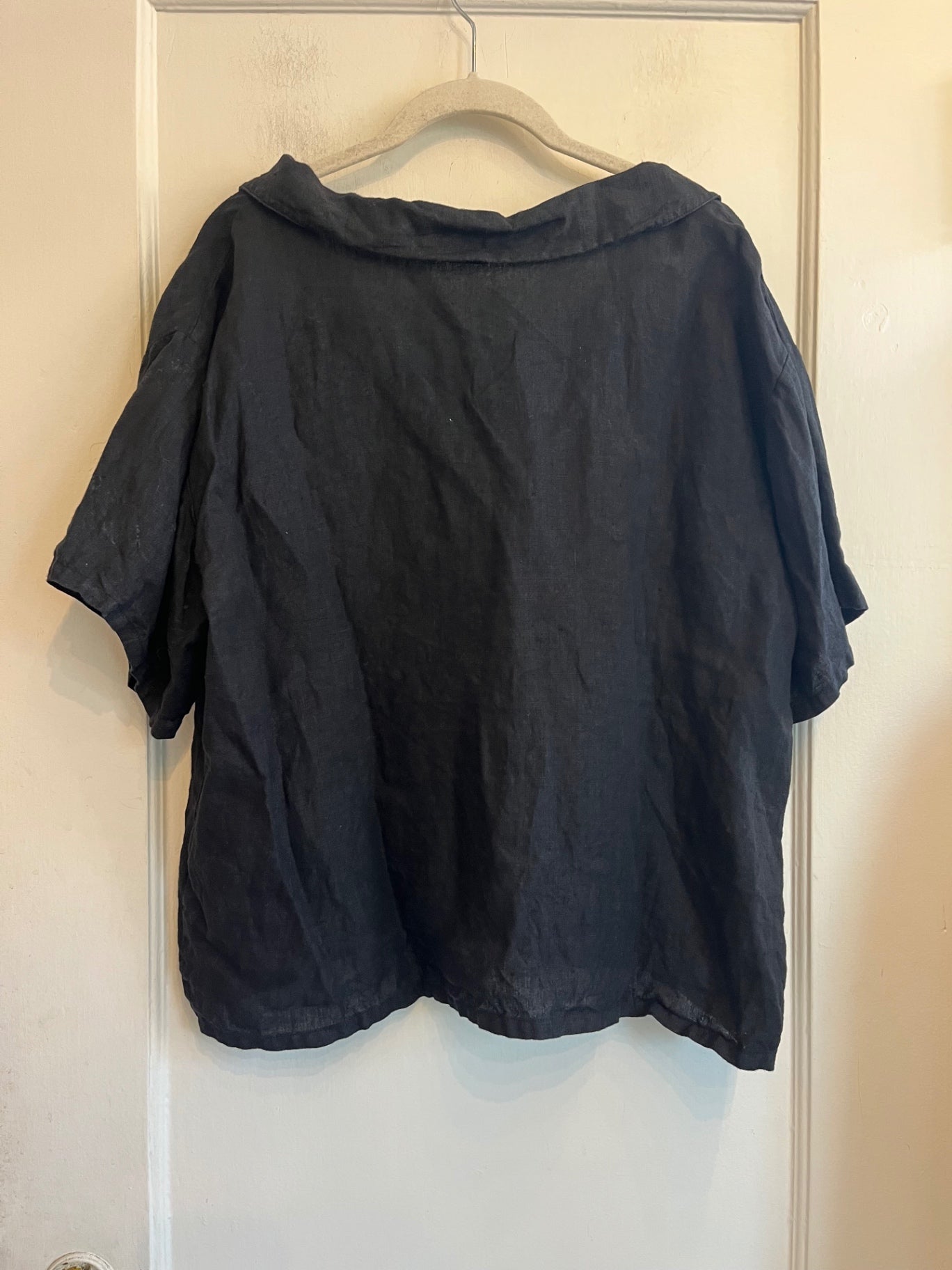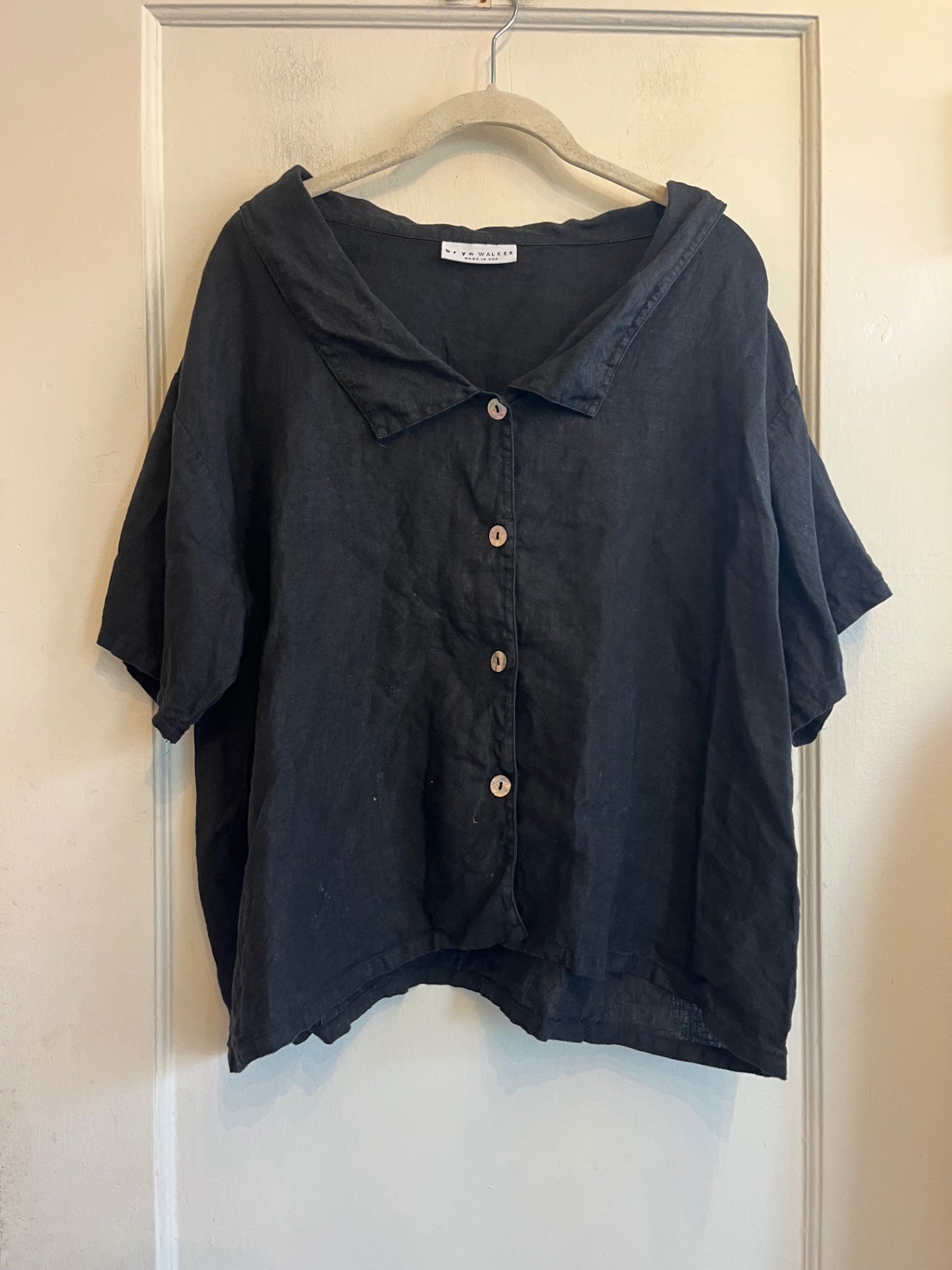 Bryn Walker black linen button-up top with a relaxed, boxy fit. Features short sleeves and oversized collar, in a breathable linen fabric.