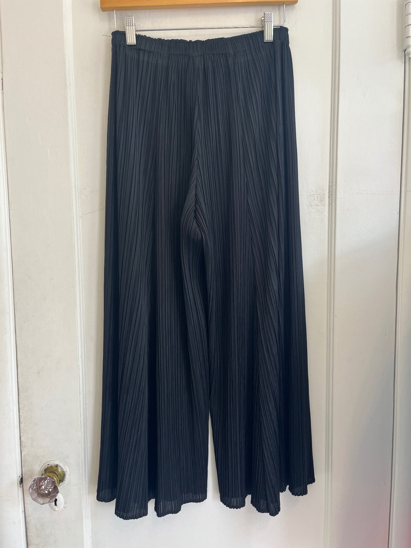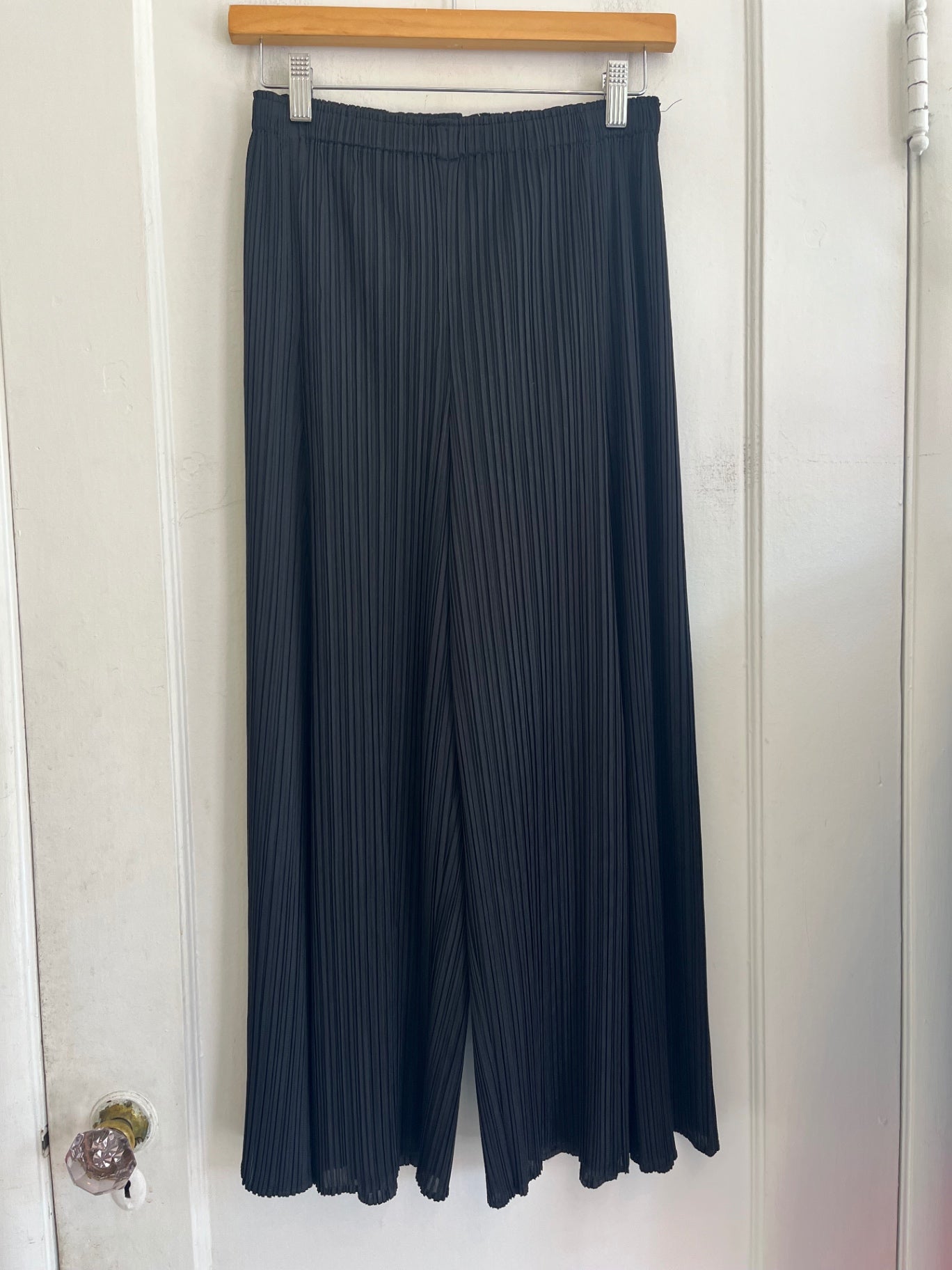 Pleats Please black pleated wide-leg pants. Elastic waistband with signature lightweight, flowy pleated fabric. Comfortable and flattering fit.