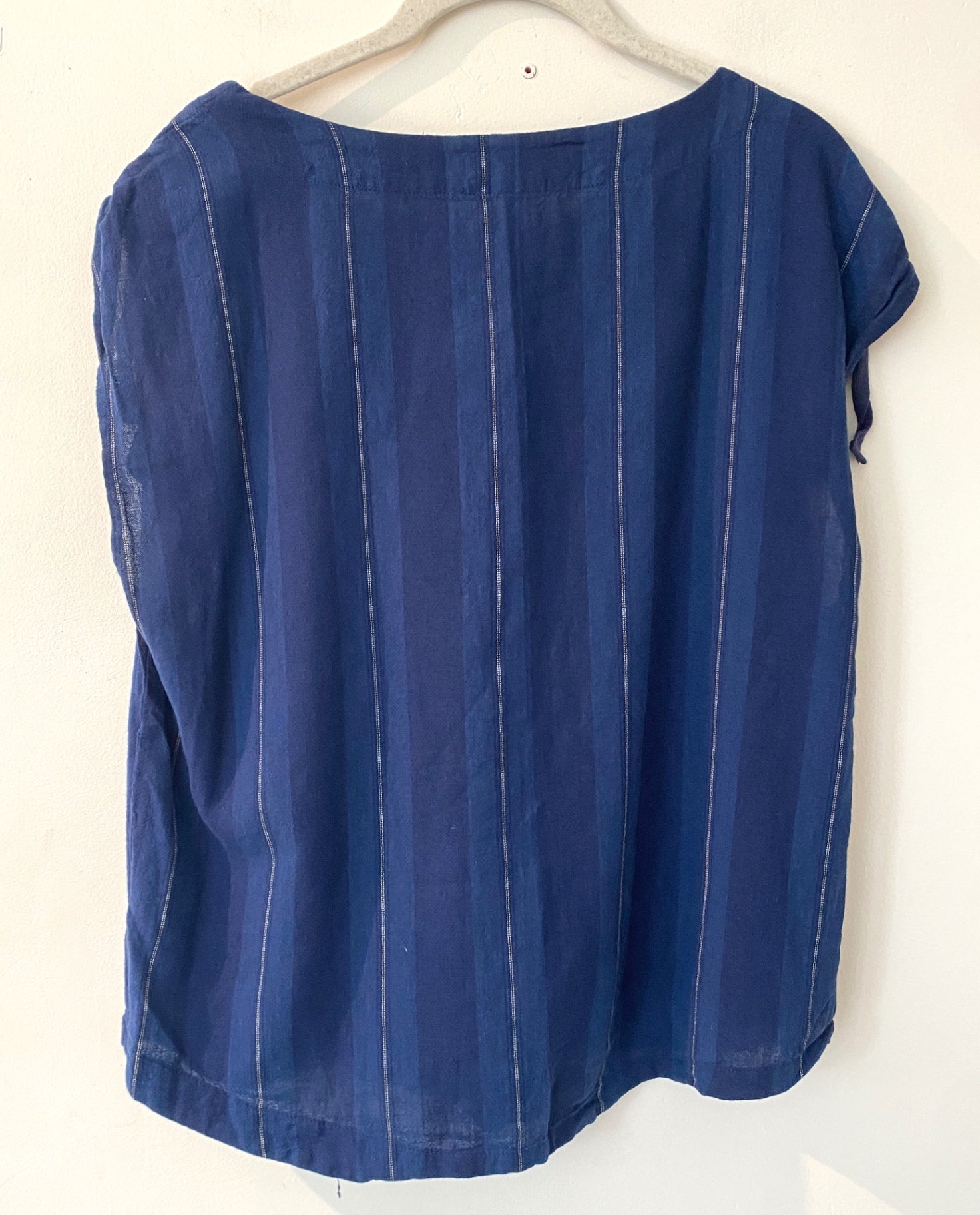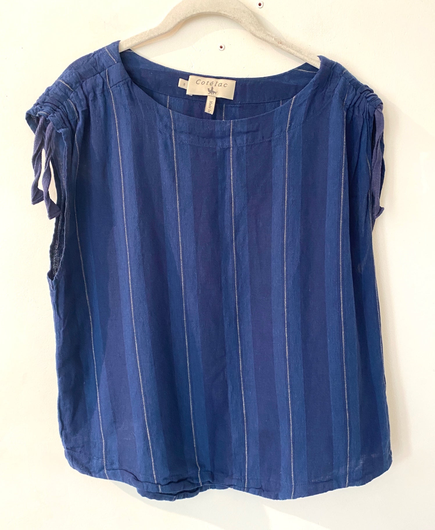 This breezy blue linen top by Cotelac features vertical stripes, puffed shoulder details, and a relaxed fit. Perfect for warm weather, it offers a casual yet chic look. The lightweight fabric ensures comfort while maintaining style. An effortless piece for your summer wardrobe that pairs well with jeans or skirts.