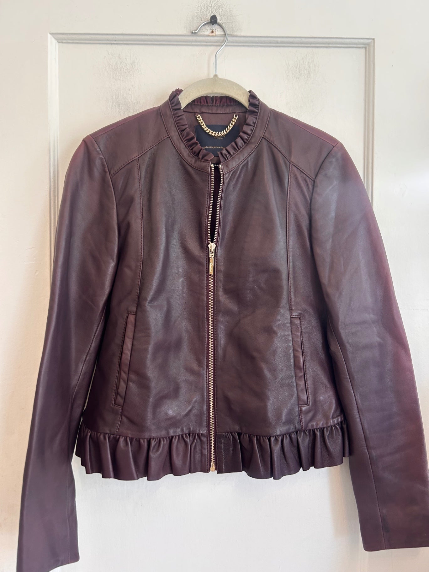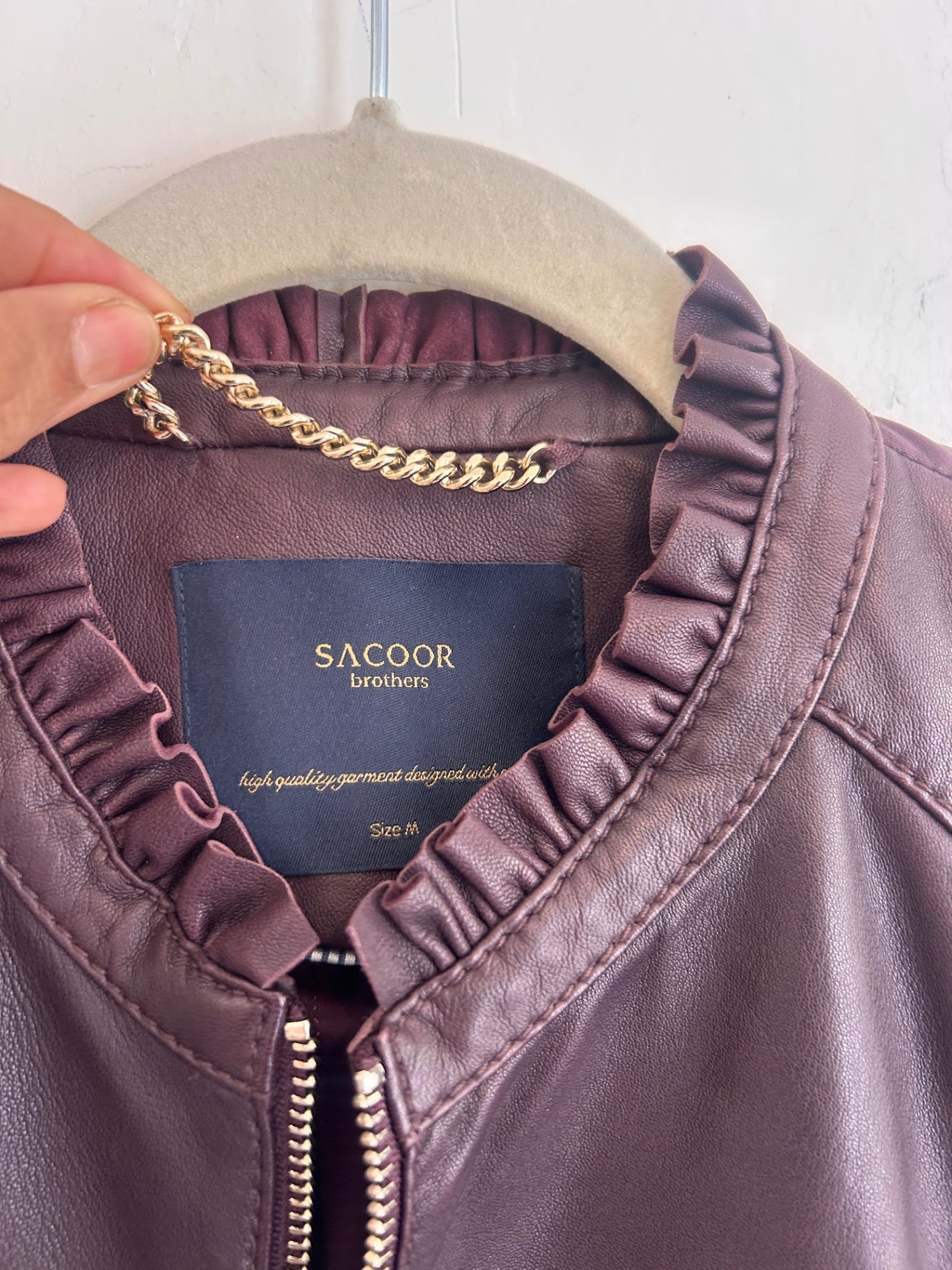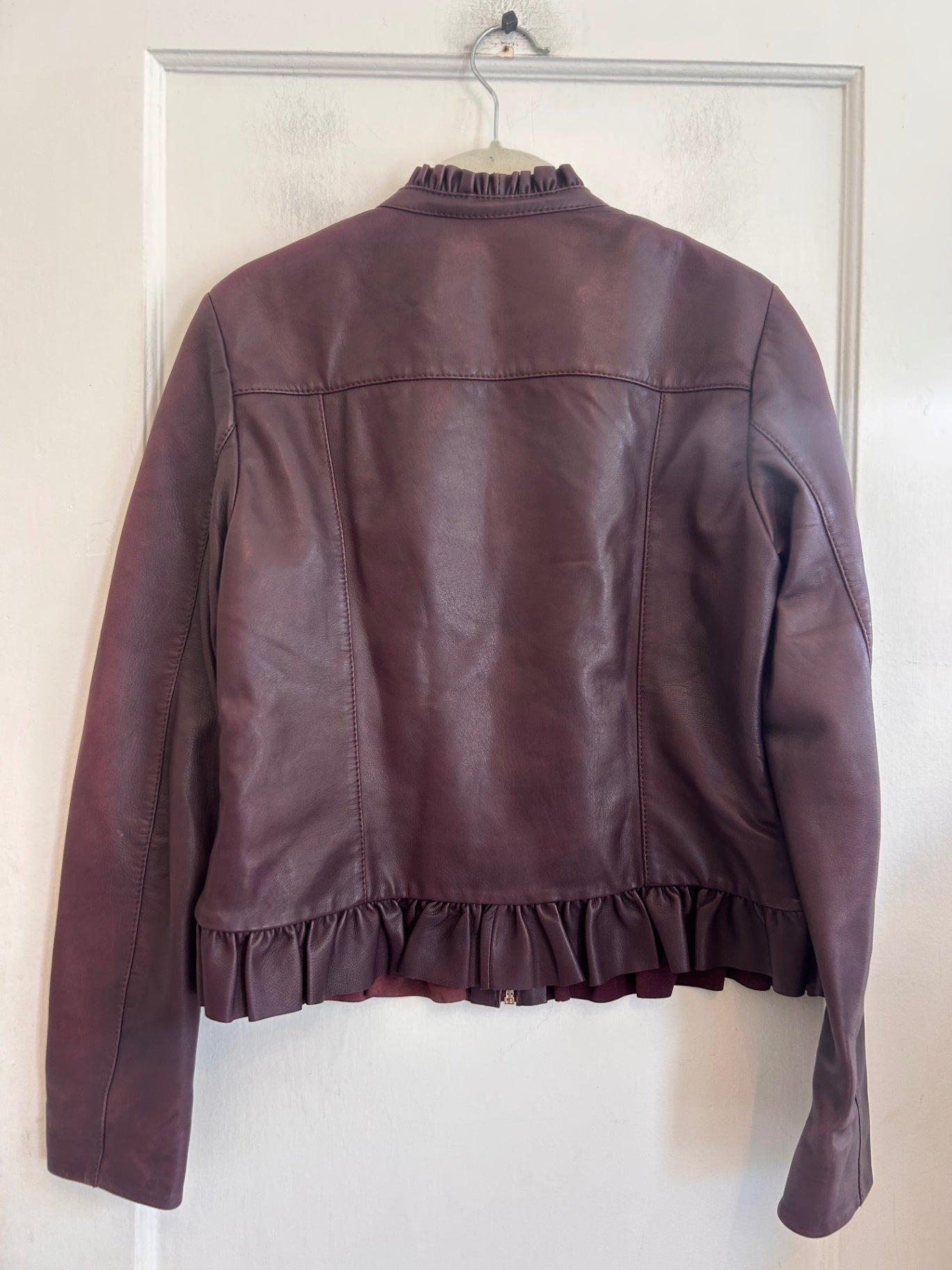 Sacoor cropped leather jacket in rich Merlot with a structured fit and timeless silhouette. Ruffle detailing in collar and