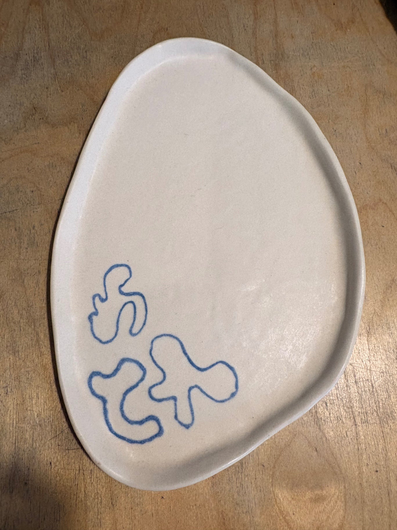 A simple white ceramic plate with a few blue squiggly lines drawn on it. Its smooth surface and basic design make it suitable for serving snacks or small dishes in a casual setting.