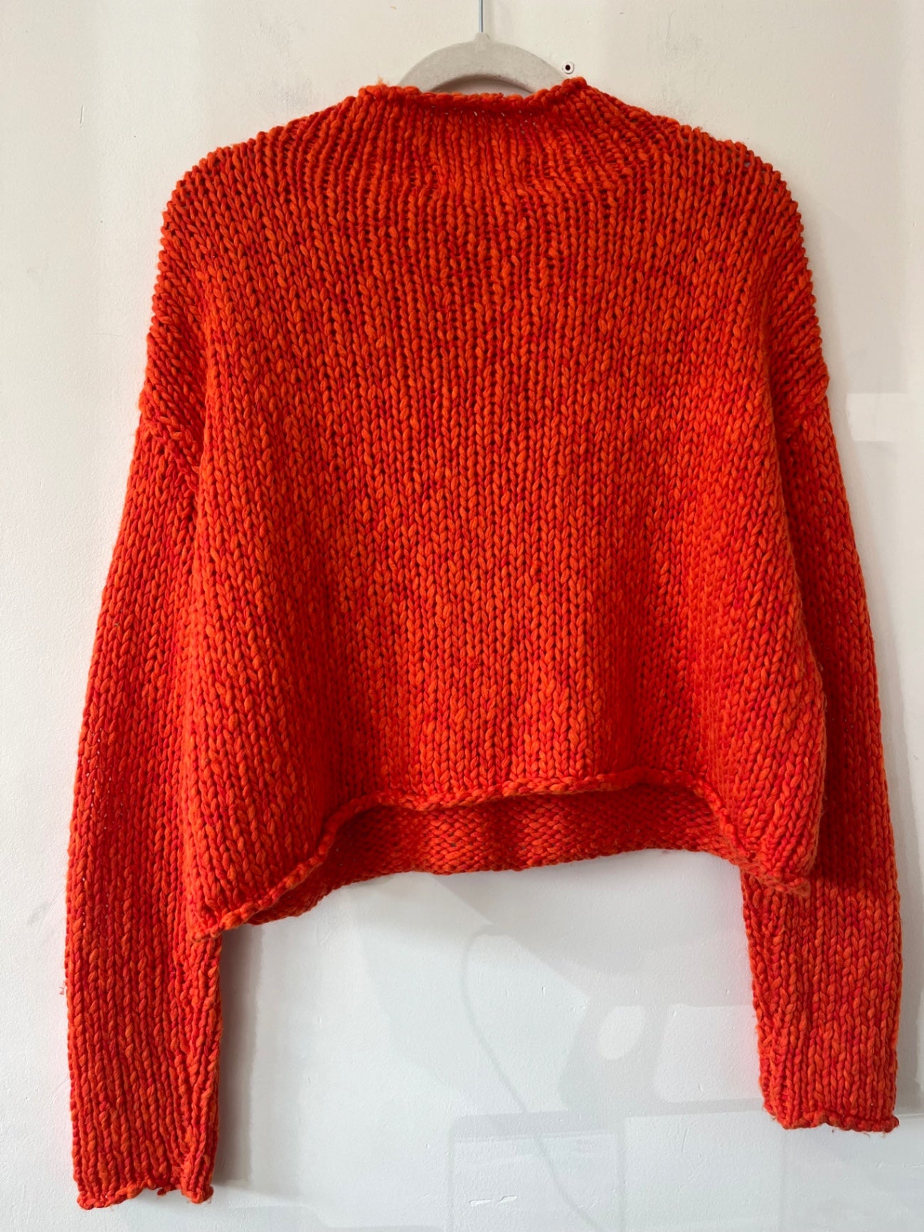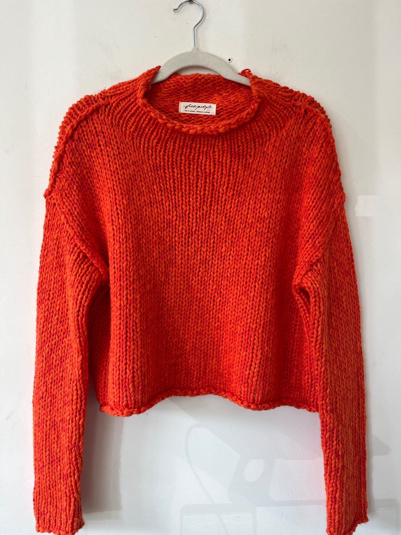 Statement chunky knit sweater by Free People in a bold orange color. Relaxed fit in slightly cropped hem and textured knit throughout.