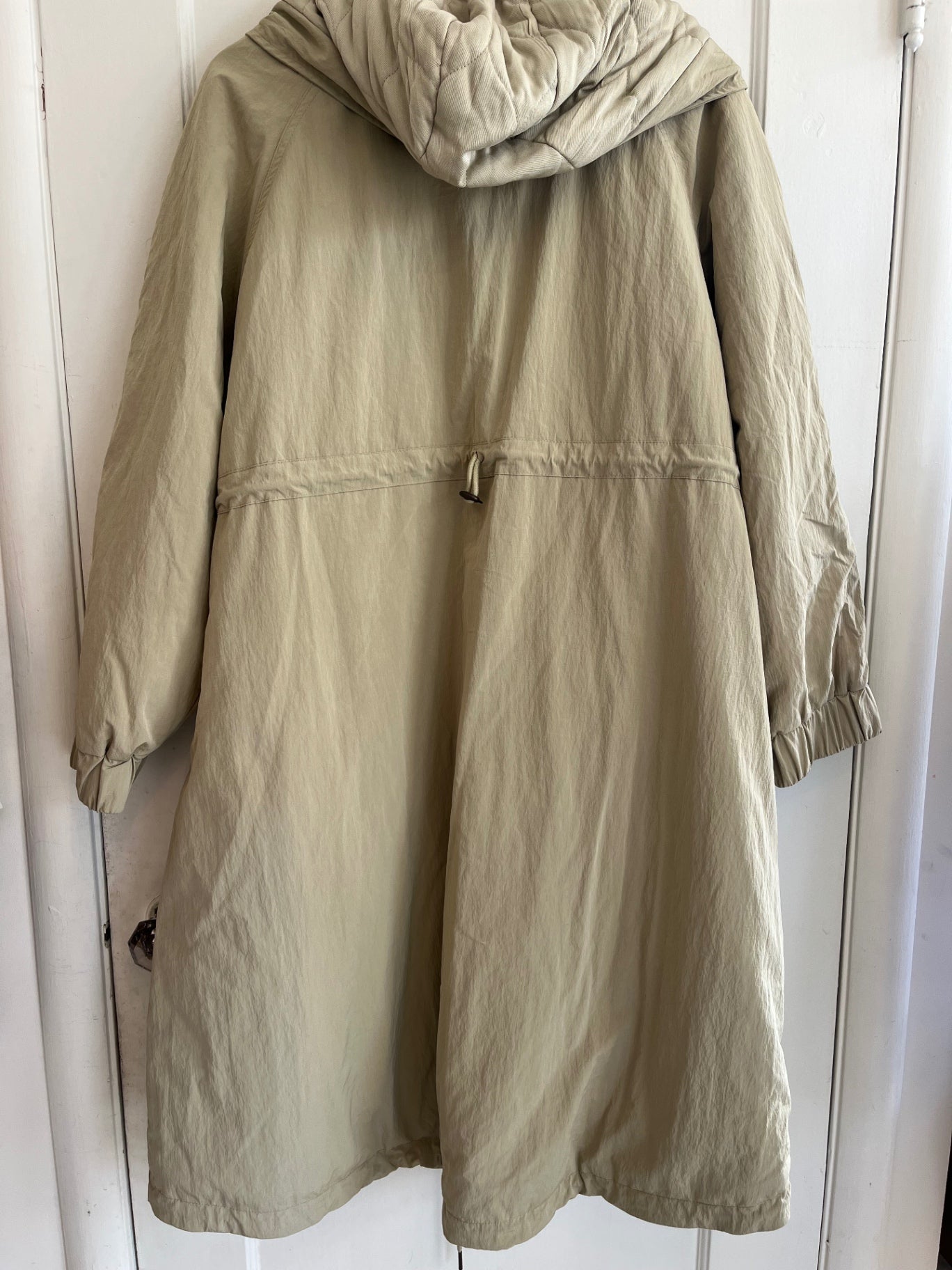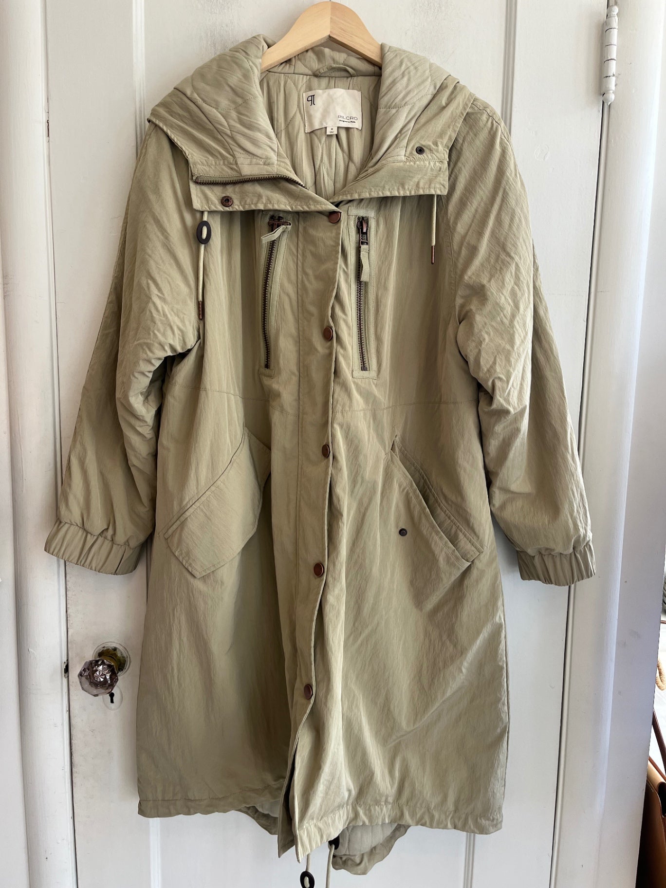 Longline parka jacket by Pilcro in a light sage green. Feature a hood, zip and snap front, and large front pockets.