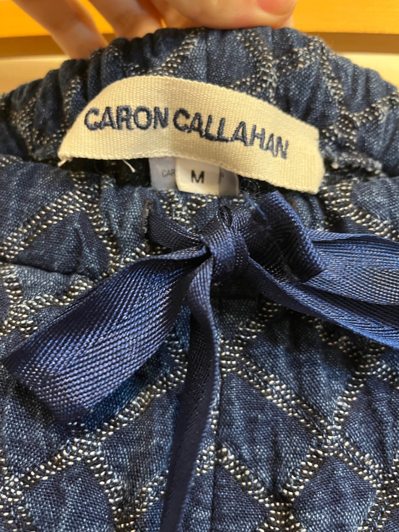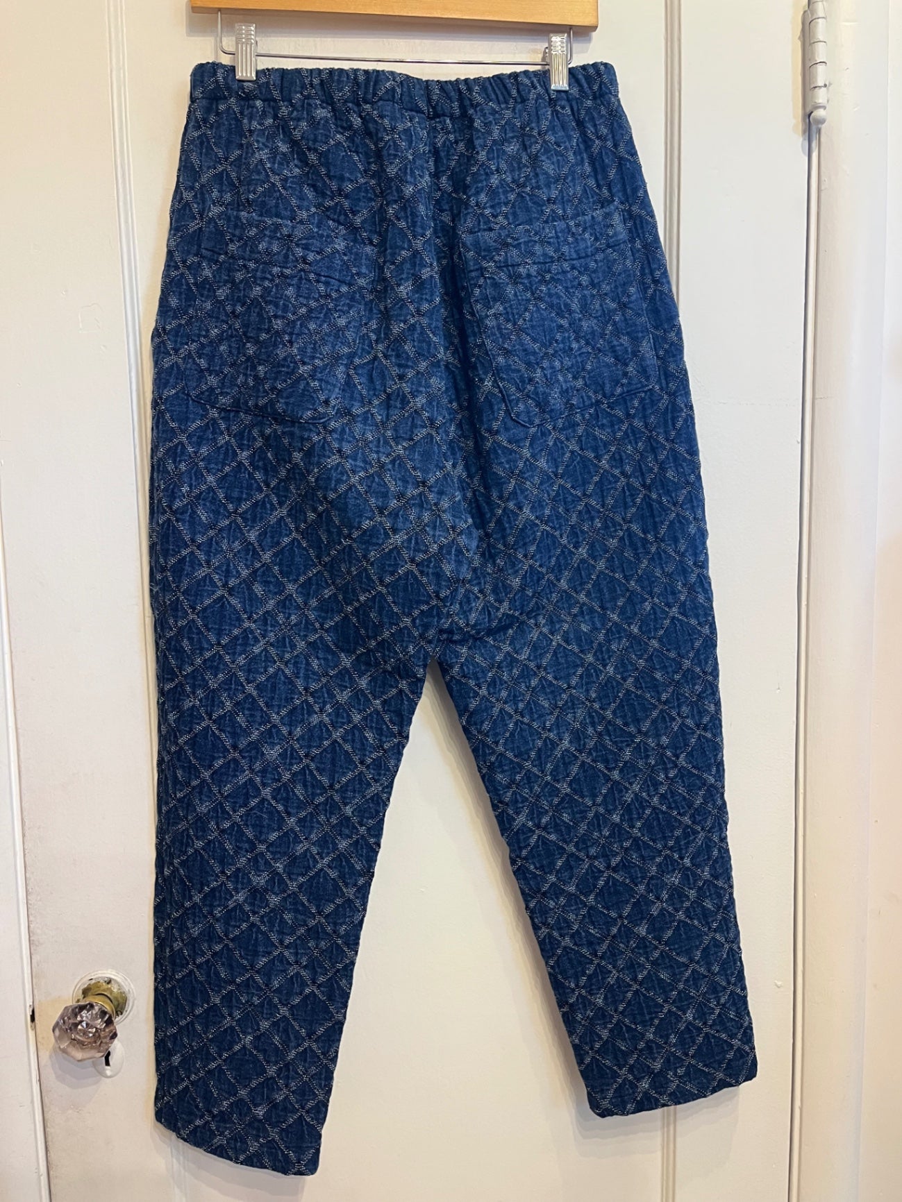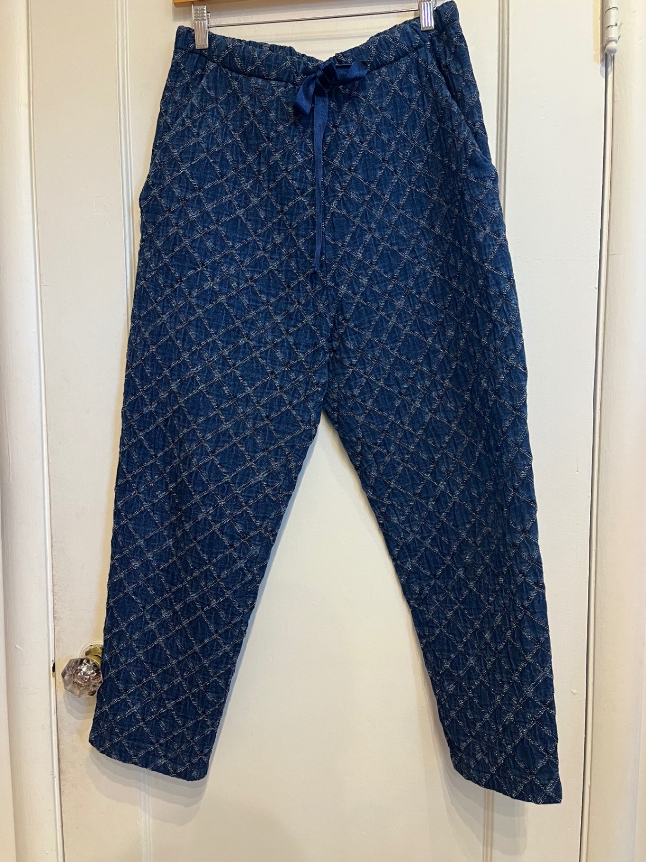Textured indigo pants Caron Callahan featuring a soft quilted diamond pattern fabric, relaxed taper leg, elastic waistband, and adjustable satin drawstring tie.