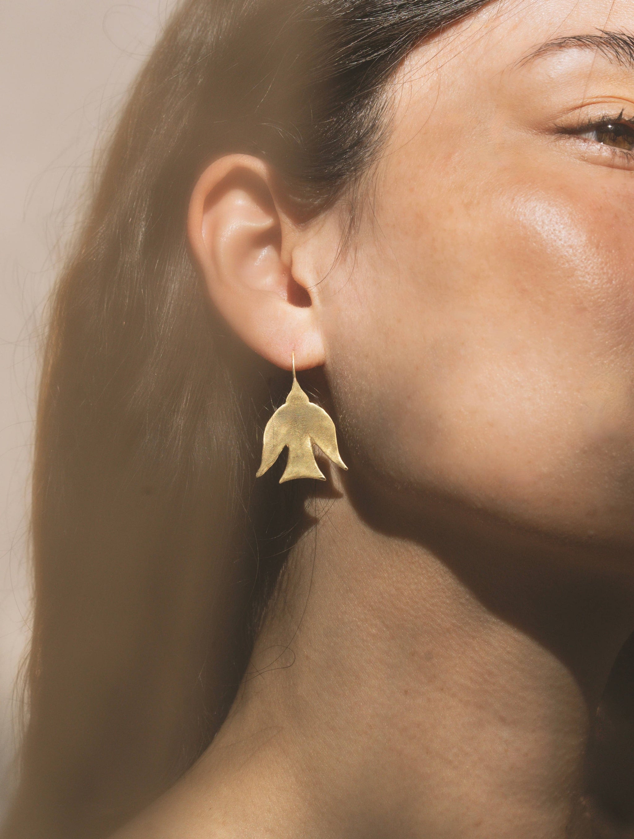 The Ornis earrings carry the abstract silhouette of a bird, sculptural lines and elongated ear wires that create a sense of graceful movement, evoking the freedom of flight. Inspired by ancient symbols of spirit and renewal, these earrings are emblems of resilience, transformation and the wild grace of nature. * Sold as a pair * Approximately 6grams * Available in 14k Gold coated recycled brass on sterling silver ear wires. * Each piece of jewelry is designed and handcrafted in small batches in coastal California. Due to the handmade nature of each piece: sizing, color and texture may vary slightly. *