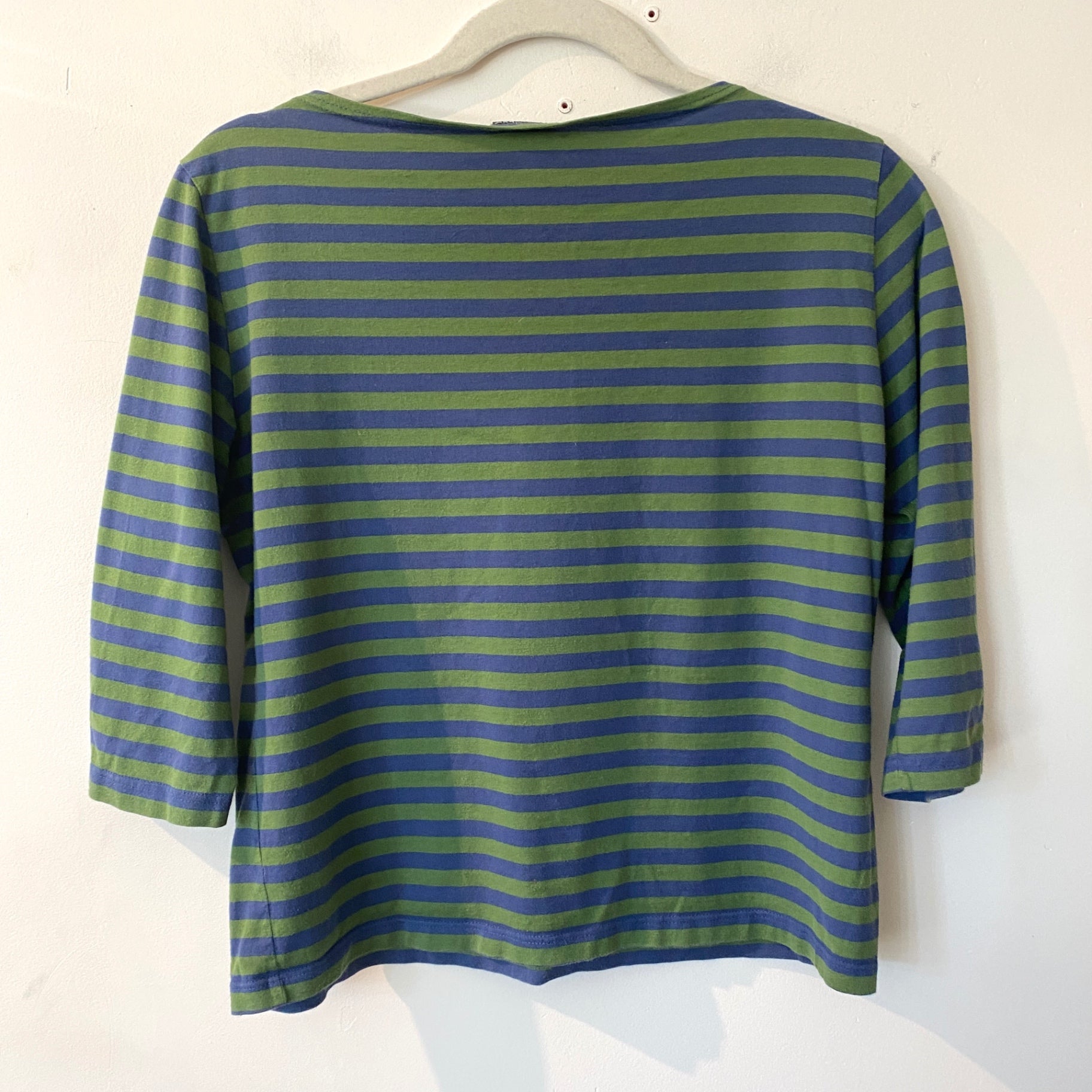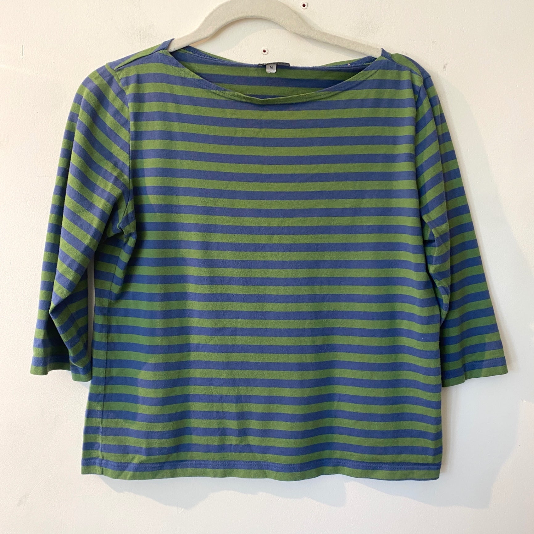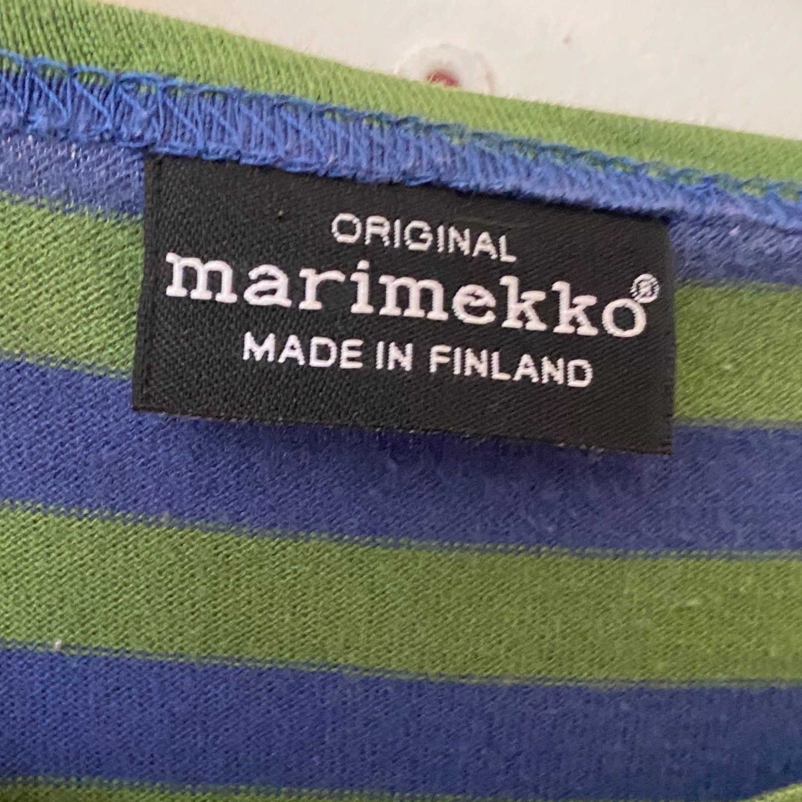 This Marimekko top features a vibrant blue and green horizontal stripe pattern. Made in Finland, it offers a comfortable fit with three-quarter length sleeves. The fabric appears soft and suitable for casual wear. Its design showcases the brand's iconic style and quality craftsmanship. Ideal for adding a pop of color to everyday outfits.
